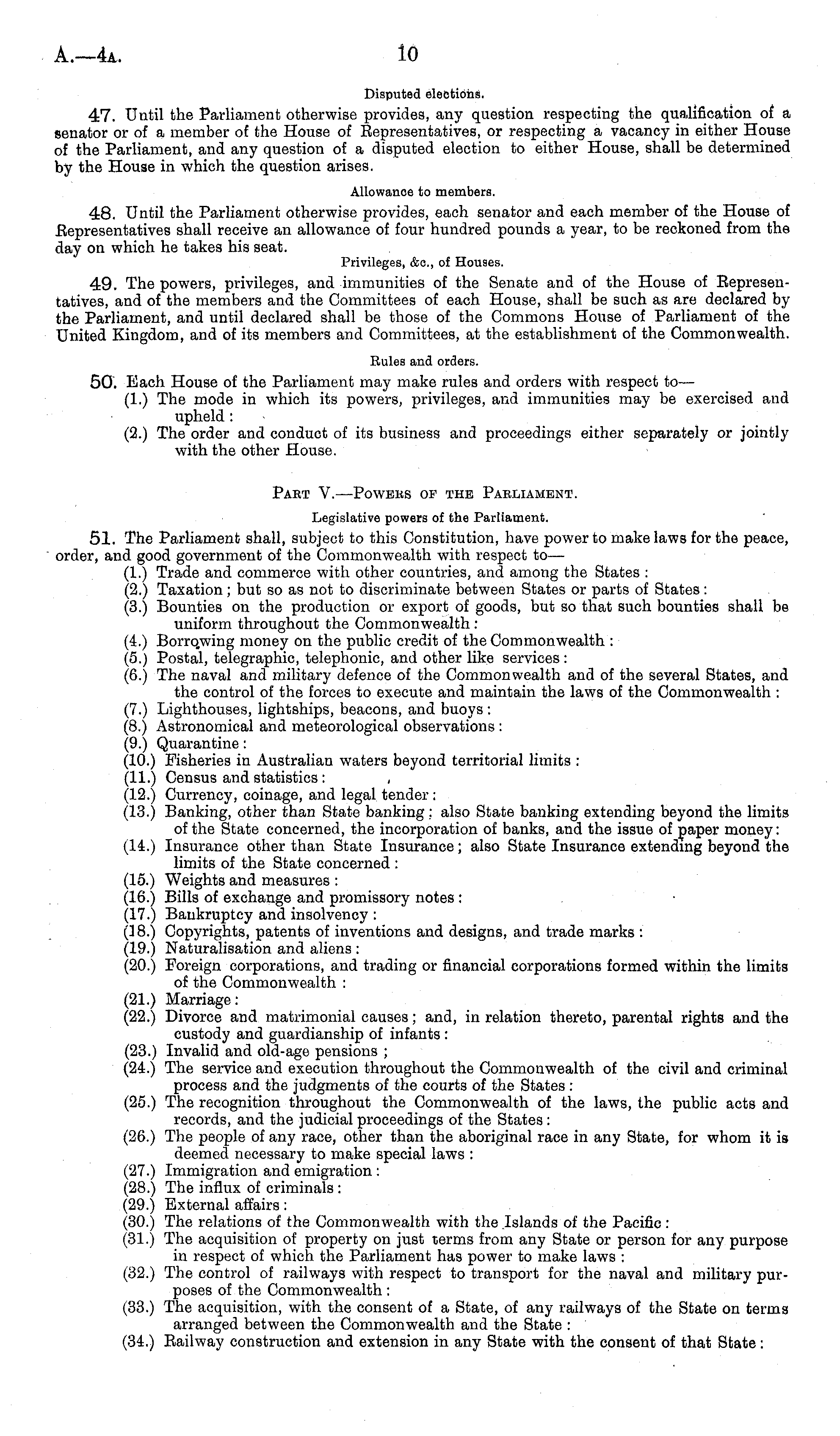 Disputed elections. 47. Until the Parliament otherwise provides, any question respecting the qualification of a senator or of a member of the House of Eepresentatives, or respecting a vacancy in either House of the Parliament, and any question of a disputed election to either House, shall be determined by the House in which the question arises. Allowance to members. 48. Until the Parliament otherwise provides, each senator and each member of the House of Eepresentatives shall receive an allowance of four hundred pounds a year, to be reckoned from the day on which he takes his seat. Privileges, &c, of Houses. 49. The powers, privileges, and immunities of the Senate and of the House of Eepresentatives, and of the members and the Committees of each House, shall be such as are declared by the Parliament, and until declared shall be those of the Commons House of Parliament of the United Kingdom, and of its members and Committees, at the establishment of the Commonwealth. Rules and orders. 50. Each House of the Parliament may make rules and orders with respect to— (1.) The mode in which its powers, privileges, and immunities may be exercised and upheld : (2.) The order and conduct of its business and proceedings either separately or jointly with the other House. Past V. —Powers of the Parliament. Legislative powers of the Parliament. 51. The Parliament shall, subject to this Constitution, have power to make laws for the peace, order, and good government of the Commonwealth with respect to— (1.) Trade and commerce with other countries, and among the States : (2.) Taxation ; but so as not to discriminate between States or parts of States : (3.) Bounties on the production or export of goods, but so that such bounties shall be uniform throughout the Commonwealth : (4.) Borrowing money on the public credit of the Commonwealth : (5.) Postal, telegraphic, telephonic, and other like services: (6.) The naval and military defence of the Commonwealth and of the several States, and the control of the forces to execute and maintain the laws of the Commonwealth : (7.) Lighthouses, lightships, beacons, and buoys : (8.) Astronomical and meteorological observations : (9.) Quarantine: (10.) Fisheries in Australian waters beyond territorial limits : (11.) Census and statistics : , (12.) Currency, coinage, and legal tender ; (13.) Banking, other than State banking; also State banking extending beyond the limits of the State concerned, the incorporation of banks, and the issue of paper money: (14.) Insurance other than State Insurance; also State Insurance extending beyond the limits of the State concerned : (15.) Weights and measures : (16.) Bills of exchange and promissory notes : (17.) Bankruptcy and insolvency : (18.) Copyrights, patents of inventions and designs, and trade marks : (19.) Naturalisation and aliens : (20.) Foreign corporations, and trading or financial corporations formed within the limits of the Commonwealth : (21.) Marriage: (22.) Divorce and matrimonial causes; and, in relation thereto, parental rights and the custody and guardianship of infants : (23.) Invalid and old-age pensions ; (24.) The service and execution throughout the Commonwealth of the civil and criminal process and the judgments of the courts of the States : (25.) The recognition throughout the Commonwealth of the laws, the public acts and records, and the judicial proceedings of the States : (26.) The people of any race, other than the aboriginal race in any State, for whom it is deemed necessary to make special laws : (27.) Immigration and emigration : (28.) The influx of criminals : (29.) External affairs: (30.) The relations of the Commonwealth with the Islands of the Pacific : (31.) The acquisition of property on just terms from any State or person for any purpose in respect of which the Parliament has power to make laws : (32.) The control of railways with respect to transport for the naval and military purposes of the Commonwealth: (33.) The acquisition, with the consent of a State, of any railways of the State on terms arranged between the Commonwealth and the State : (34.) Eailway construction and extension in any State with the consent of that State: