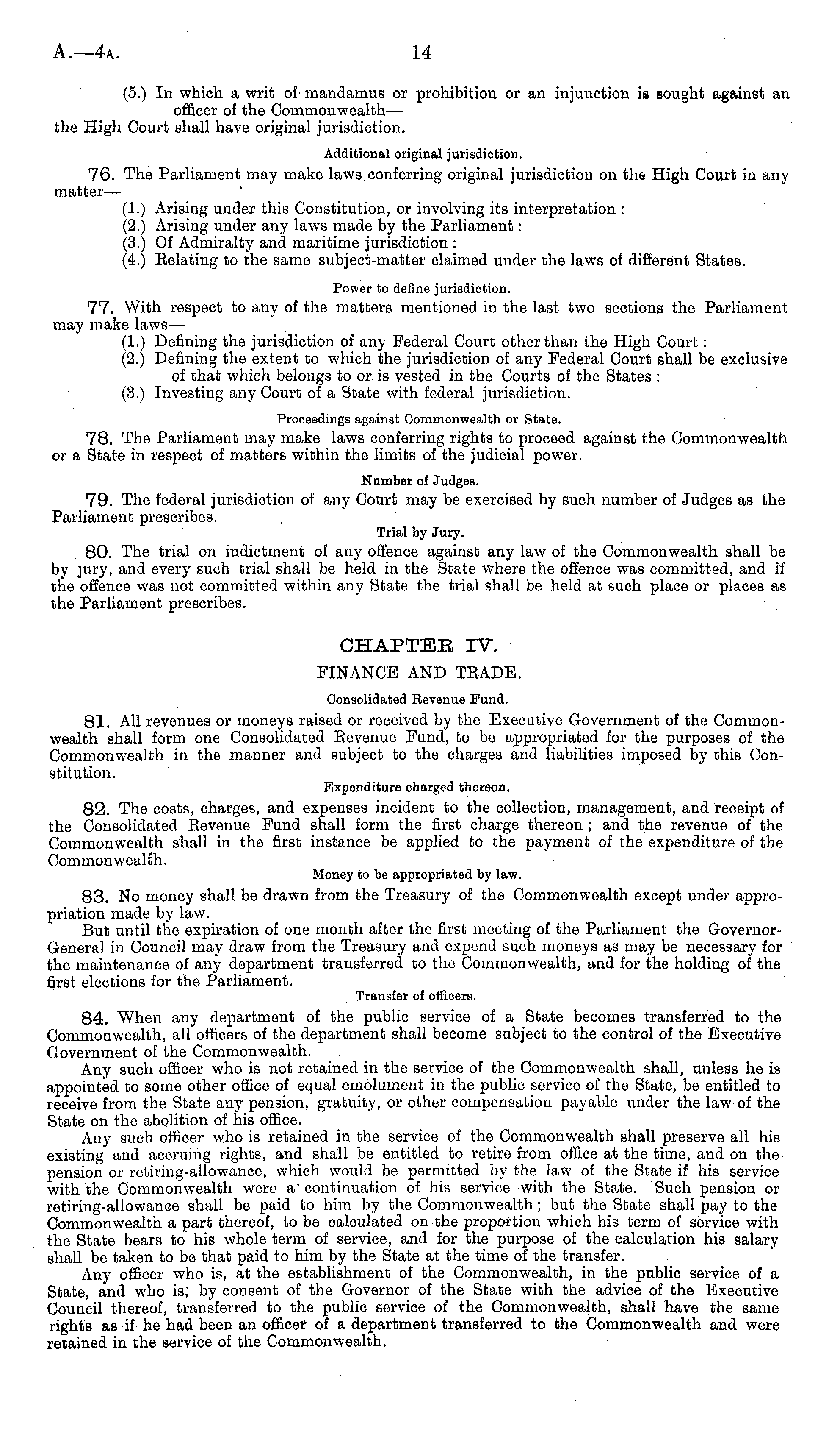 (5.) In which a writ of mandamus or prohibition or an injunction is sought against an officer of the Commonwealth — the High Court shall have original jurisdiction. Additional original jurisdiction. 76. The Parliament may make laws conferring original jurisdiction on the High Court in any matter— (1.) Arising under this Constitution, or involving its interpretation : (2.) Arising under any laws made by the Parliament: (3.) Of Admiralty and maritime jurisdiction : (4.) Eclating to the same subject-matter claimed under the laws of different States. Power to define jurisdiction. 77. With respect to any of the matters mentioned in the last two sections the Parliament may make laws— (1.) Defining the jurisdiction of any Federal Court other than the High Court: (2.) Defining the extent to which the jurisdiction of any Federal Court shall be exclusive of that which belongs to or. is vested in the Courts of the States : (3.) Investing any Court of a State with federal jurisdiction. Proceedings against Commonwealth or State. 78. The Parliament may make laws conferring rights to proceed against the Commonwealth or a State in respect of matters within the limits of the judicial power. Number of Judges. 79. The federal jurisdiction of any Court may be exercised by such number of Judges as the Parliament prescribes. Trial by Jury. 80. The trial on indictment of any offence against any law of the Commonwealth shall be by jury, and every such trial shall be held in the State where the offence was committed, and if the offence was not committed within any State the trial shall be held at such place or places as the Parliament prescribes. CHAPTEE IV. FINANCE AND TEADE. Consolidated Revenue Fund. 81. All revenues or moneys raised or received by the Executive Government of the Commonwealth shall form one Consolidated Eevenue Fund, to be appropriated for the purposes of the Commonwealth in the manner and subject to the charges and liabilities imposed by this Constitution. Expenditure charged thereon. 82. The costs, charges, and expenses incident to the collection, management, and receipt of the Consolidated Eevenue Fund shall form the first charge thereon; and the revenue of the Commonwealth shall in the first instance be applied to the payment of the expenditure of the Commonwealth. Money to be appropriated by law. 83. No money shall be drawn from the Treasury of the Commonwealth except under appropriation made by law. But until the expiration of one month after the first meeting of the Parliament the GovernorGeneral in Council may draw from the Treasury and expend such moneys as may be necessary for the maintenance of any department transferred to the Commonwealth, and for the holding of the first elections for the Parliament. Transfer of officers. 84. When any department of the public service of a State becomes transferred to the Commonwealth, all officers of the department shall become subject to the control of the Executive Government of the Commonwealth. Any such officer who is not retained in the service of the Commonwealth shall, unless he is appointed to some other office of equal emolument in the public service of the State, be entitled to receive from the State any pension, gratuity, or other compensation payable under the law of the State on the abolition of his office. Any such officer who is retained in the service of the Commonwealth shall preserve all his existing and accruing rights, and shall be entitled to retire from office at the time, and on the pension or retiring-allowance, which would be permitted by the law of the State if his service with the Commonwealth were a' continuation of his service with the State. Such pension or retiring-allowance shall be paid to him by the Commonwealth; but the State shall pay to the Commonwealth a part thereof, to be calculated on the proportion which his term of service with the State bears to his whole term of service, and for the purpose of the calculation his salary shall be taken to be that paid to him by the State at the time of the transfer. Any officer who is, at the establishment of the Commonwealth, in the public service of a State, and who is; by consent of the Governor of the State with the advice of the Executive Council thereof, transferred to the public service of the Commonwealth, shall have the same rights as if he had been an officer of a department transferred to the Commonwealth and were retained in the service of the Commonwealth.