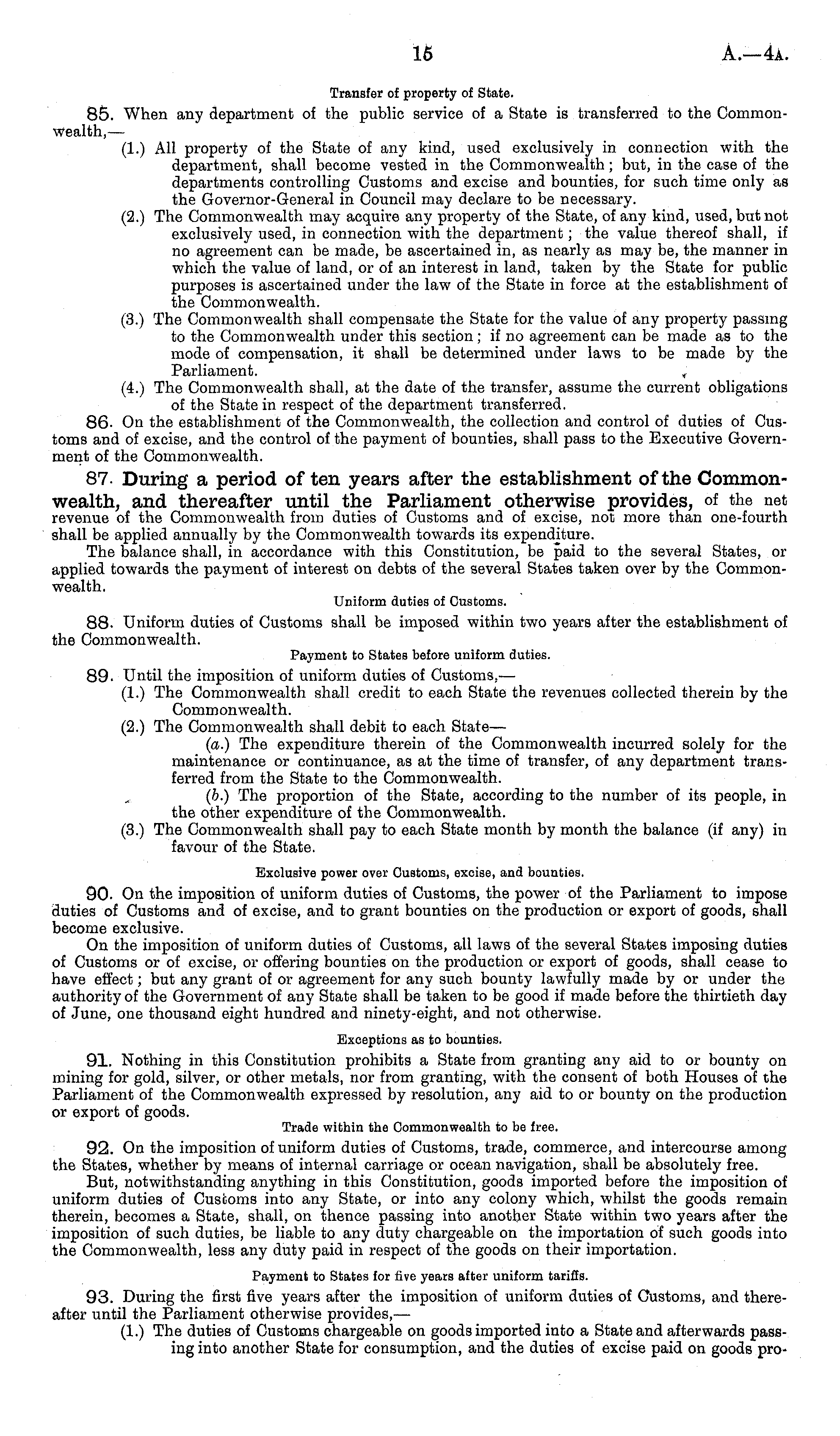 Transfer of property of State. 85. When any department of the public service of a State is transferred to the CommonWealth, — (1.) All property of the State of any kind, used exclusively in connection with the department, shall become vested in the Commonwealth; but, in the case of the departments controlling Customs and excise and bounties, for such time only as the Governor-General in Council may declare to be necessary. (2.) The Commonwealth may acquire any property of the State, of any kind, used, but not exclusively used, in connection with the department; the value thereof shall, if no agreement can be made, be ascertained in, as nearly as may be, the manner in which the value of land, or of an interest in land, taken by the State for public purposes is ascertained under the law of the State in force at the establishment of the Commonwealth. (3.) The Commonwealth shall compensate the State for the value of any property passing to the Commonwealth under this section ; if no agreement can be made as to the mode of compensation, it shall be determined under laws to be made by the Parliament. , (4.) The Commonwealth shall, at the date of the transfer, assume the current obligations of the State in respect of the department transferred. 86. On the establishment of the Commonwealth, the collection and control of duties of Customs and of excise, and the control of the payment of bounties, shall pass to the Executive Government of the Commonwealth. 87. During a period often years after the establishment of the Commonwealth, and thereafter until the Parliament otherwise provides, of the net revenue of the Commonwealth from duties of Customs and of excise, not more than one-fourth shall be applied annually by the Commonwealth towards its expenditure. The balance shall, in accordance with this Constitution, be paid to the several States, or applied towards the payment of interest on debts of the several States taken over by the Commonwealth. Uniform duties of Customs. 88. Uniform duties of Customs shall be imposed within two years after the establishment of the Commonwealth. Payment to States before uniform duties. 89. Until the imposition of uniform duties of Customs, — (1.) The Commonwealth shall credit to each State the revenues collected therein by the Commonwealth. (2.) The Commonwealth shall debit to each State— (a.) The expenditure therein of the Commonwealth incurred solely for the maintenance or continuance, as at the time of transfer, of any department transferred from the State to the Commonwealth. (b.) The proportion of the State, according to the number of its people, in the other expenditure of the Commonwealth. (3.) The Commonwealth shall pay to each State month by month the balance (if any) in favour of the State. Exclusive power over Customs, excise, and bounties. 90- On the imposition of uniform duties of Customs, the power of the Parliament to impose duties of Customs and of excise, and to grant bounties on the production or export of goods, shall become exclusive. On the imposition of uniform duties of Customs, all laws of the several States imposing duties of Customs or of excise, or offering bounties on the production or export of goods, shall cease to have effect; but any grant of or agreement for any such bounty lawfully made by or under the authority of the Government of any State shall be "taken to be good if made before the thirtieth day of June, one thousand eight hundred and ninety-eight, and not otherwise. Exceptions as to bounties. 91. Nothing in this Constitution prohibits a State from granting any aid to or bounty on mining for gold, silver, or other metals, nor from granting, with the consent of both Houses of the Parliament of the Commonwealth expressed by resolution, any aid to or bounty on the production or export of goods. Trade within the Commonwealth to be free. 92. On the imposition of uniform duties of Customs, trade, commerce, and intercourse among the States, whether by means of internal carriage or ocean navigation, shall be absolutely free. But, notwithstanding anything in this Constitution, goods imported before the imposition of uniform duties of Customs into any State, or into any colony which, whilst the goods remain therein, becomes a State, shall, on thence passing into another State within two years after the imposition of such duties, be liable to any duty chargeable on the importation of such goods into the Commonwealth, less any duty paid in respect of the goods on their importation. Payment to States for five years after uniform tariffs. 93. During the first five years after the imposition of uniform duties of Customs, and thereafter until the Parliament otherwise provides,— (1.) The duties of Customs chargeable on goods imported into a State and afterwards passing into another State for consumption, and the duties of excise paid on goods pro-