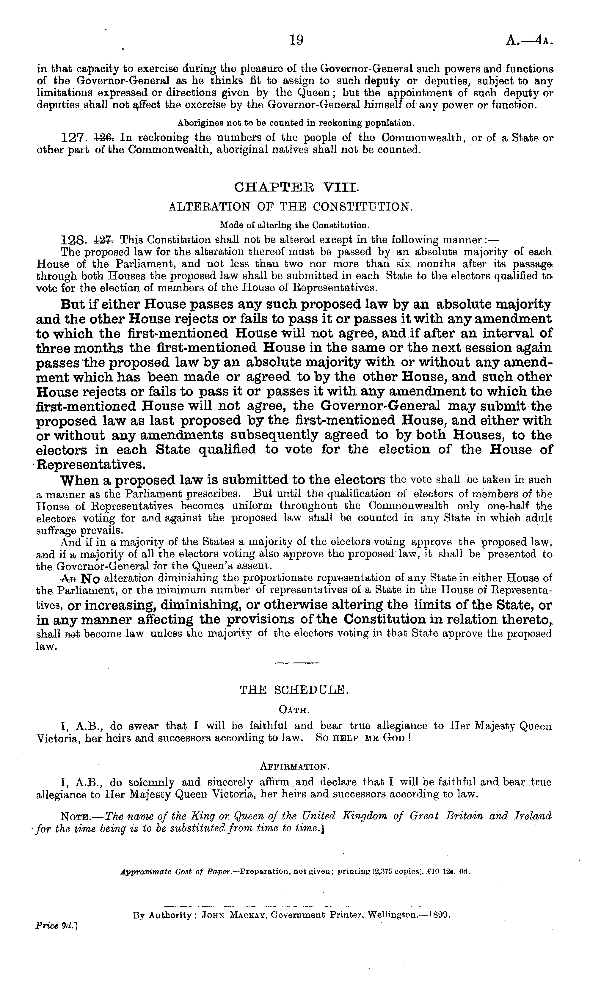 in that capacity to exercise during the pleasure of the Governor-General such powers and functions of the Governor-General as he thinks fit to assign to such deputy or deputies, subject to any limitations expressed or directions given by the Queen; but the appointment of such deputy or deputies shall not affect the exercise by the Governor-General himself of any power or function. Aborigines not to be oounted in reckoning population. 127- 43& In reckoning the numbers of the people of the Commonwealth, or of a State or other part of the Commonwealth, aboriginal natives shall not be counted. CHAPTEE VIII. ALTERATION OP THE CONSTITUTION. Mode of altering the Constitution. 128- iSrh This Constitution shall not be altered except in the following manner: — The proposed law for the alteration thereof must be passed by an absolute majority of each House of the Parliament, and not less than two nor more than six months after its passage through both Houses the proposed law shall be submitted in each State to the electors qualified to vote for the election of members of the House of Eepresentatives. But if either House passes any such proposed law by an absolute majority and the other House rejects or fails to pass it or passes it with any amendment to which the first-mentioned House will not agree, and if after an interval of three months the first-mentioned House in the same or the next session again passes the proposed law by an absolute majority with or without any amendment which has been made or agreed to by the other House, and such other House rejects or fails to pass it or passes it with any amendment to which the first-mentioned House will not agree, the Governor-General may submit the proposed law as last proposed by the first-mentioned House, and either with or without any amendments subsequently agreed to by both Houses, to the electors in each State qualified to vote for the election of the House of Representatives. When a proposed law is submitted to the electors the vote shall be taken in such a manner as the Parliament prescribes. But until the qualification of electors of members of the House of Representatives becomes uniform throughout the Commonwealth only one-half the electors voting for and against the proposed law shall be counted in any State in which adult suffrage prevails. And if in a majority of the States a majority of the electors voting approve the proposed law, and if a majority of all the electors voting also approve the proposed law, it shall be presented to the Governor-General for the Queen's assent. Aa No alteration diminishing the proportionate representation of any State in either House of the Parliament, or the minimum number of representatives of a State in the House of Representatives, or increasing, diminishing, or otherwise altering the limits of the State, or in any manner affecting the provisions of the Constitution in relation thereto, shall »»t become law unless the majority of the electors voting in that State approve the proposed law.