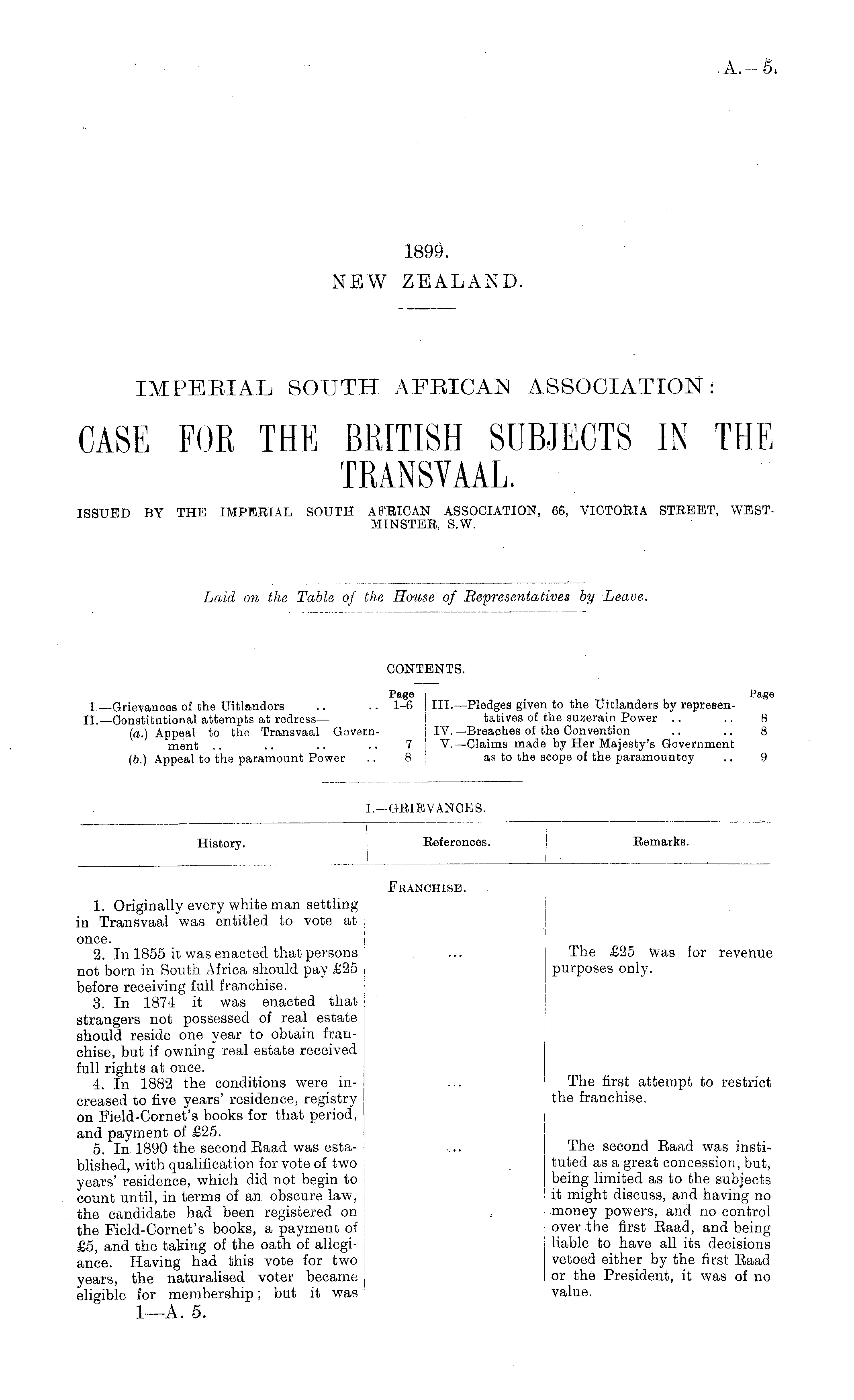 IMPERIAL SOUTH AFRICAN ASSOCIATION: CASE FOR THE BRITISH SUBJECTS IN THE TRANSVAAL. ISSUED BY THE IMPERIAL SOUTH AFRICAN ASSOCIATION, 66, VICTORIA STREET, WEST-MINSTER, S.W.