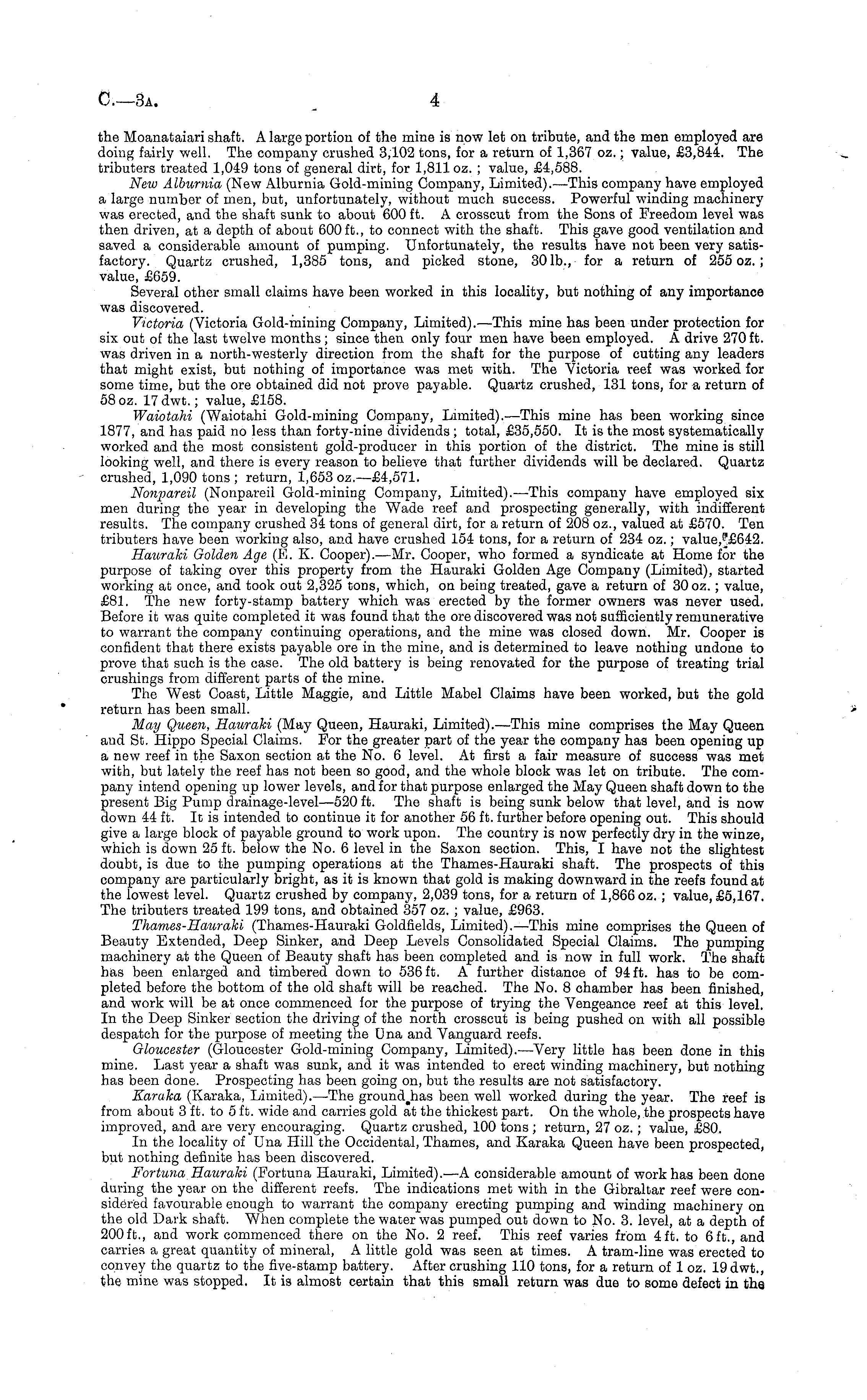 the Moanataiari shaft. A large portion of the mine is now let on tribute, and the men employed are doing fairly well. The company crushed 3,102 tons, for a return of 1,367 oz.; value, £3,844. The tributers treated 1,049 tons of general dirt, for 1,811 oz. ; value, £4,588. New Alburnia (New Alburnia Gold-mining Company, Limited). —This company have employed a large number of men, but, unfortunately, without much success. Powerful winding machinery was erected, and the shaft sunk to about 600 ft. A crosscut from the Sons of Freedom level was then driven, at a depth of about 600 ft., to connect with the shaft. This gave good ventilation and saved a considerable amount of pumping. Unfortunately, the results have not been very satisfactory. Quartz crushed, 1,385 tons, and picked stone, 301b., for a return of 255 oz. ; value, £659. Several other small claims have been worked in this locality, but nothing of any importance was discovered. Victoria (Victoria Gold-mining Company, Limited). —This mine has been under protection for six out of the last twelve months; since then only four men have been employed. A drive 270 ft. was driven in a north-westerly direction from the shaft for the purpose of cutting any leaders that might exist, but nothing of importance was met with. The Victoria reef was worked for some time, but the ore obtained did not prove payable. Quartz crushed, 131 tons, for a return of 58 oz. 17dwt.; value, £158. Waiotahi (Waiotahi Gold-mining Company, Limited). —This mine has been working since 1877, and has paid no less than forty-nine dividends ; total, £35,550. It is the most systematically worked and the most consistent gold-producer in this portion of the district. The mine is still looking well, and there is every reason to believe that further dividends will be declared. Quartz crushed, 1,090 tons ; return, 1,653 0z.—£4,571. Nonpareil (Nonpareil Gold-mining Company, Limited). —-This company have employed six men during the year in developing the Wade reef and prospecting generally, with indifferent results. The company crushed 34 tons of general dirt, for a return of 208 oz., valued at £570. Ten tributers have been working also, and have crushed 154 tons, for a return of 234 oz.; value,^£642. Hatiraki Golden Age (E. K. Cooper).—Mr. Cooper, who formed a syndicate at Home for the purpose of taking over this property from the Hauraki Golden Age Company (Limited), started working at once, and took out 2,325 tons, which, on being treated, gave a return of 30 oz.; value, £81. The new forty-stamp battery which was erected by the former owners was never used, Before it was quite completed it was found that the ore discovered was not sufficiently remunerative to warrant the company continuing operations, and the mine was closed down. Mr. Cooper is confident that there exists payable ore in the mine, and is determined to leave nothing undone to prove that such is the case. The old battery is being renovated for the purpose of treating trial crushings from different parts of the mine. The West Coast, Little Maggie, and Little Mabel Claims have been worked, but the gold return has been small. May Queen, Hauraki (May Queen, Hauraki, Limited). —This mine comprises the May Queen and St. Hippo Special Claims. For the greater part of the year the company has been opening up a new reef in the Saxon section at the No. 6 level. At first a fair measure of success was met with, but lately the reef has not been so good, and the whole block was let on tribute. The company intend opening up lower levels, and for that purpose enlarged the May Queen shaft down to the present Big Pump drainage-level—s2o ft. The shaft is being sunk below that level, and is now down 44 ft. It is intended to continue it for another 56 ft. further before opening out. This should give a large block of payable ground to work upon. The country is now perfectly dry in the winze, which is down 25 ft. below the No. 6 level in the Saxon section. This, I have not the slightest doubt, is due to the pumping operations at the Thames-Hauraki shaft. The prospects of this company are particularly bright, as it is known that gold is making downward in the reefs found at the lowest level. Quartz crushed by company, 2,039 tons, for a return of 1,866 oz.; value, £5,167. The tributers treated 199 tons, and obtained 357 oz. ; value, £963. Thames-Hauraki (Thames-Hauraki Goldfields, Limited). —This mine comprises the Queen of Beauty Extended, Deep Sinker, and Deep Levels Consolidated Special Claims. The pumping machinery at the Queen of Beauty shaft has been completed and is now in full work. The shaft has been enlarged and timbered down to 536 ft. A further distance of 94 ft. has to be completed before the bottom of the old shaft will be reached. The No. 8 chamber has been finished, and work will be at once commenced for the purpose of trying the Vengeance reef at this level. In the Deep Sinker section the driving of the north crosscut is being pushed on with all possible despatch for the purpose of meeting the Una and Vanguard reefs. Gloucester (Gloucester Gold-mining Company, Limited). —Very little has been done in this mine. Last year a shaft was sunk, and it was intended to erect winding machinery, but nothin" has been done. Prospecting has been going on, but the results are not satisfactory. Karaka (Karaka, Limited). —The groundJias been well worked during the year. The reef is from about 3 ft. to 5 ft. wide and carries gold at the thickest part. On the whole, the prospects have improved, and are very encouraging. Quartz crushed, 100 tons ; return, 27 oz. ; value, £80. In the locality of Una Hill the Occidental, Thames, and Karaka Queen have been prospected, but nothing definite has been discovered. Fortuna Hauraki (Fortuna Hauraki, Limited). —A considerable amount of work has been done during the year on the different reefs. The indications met with in the Gibraltar reef were considered favourable en