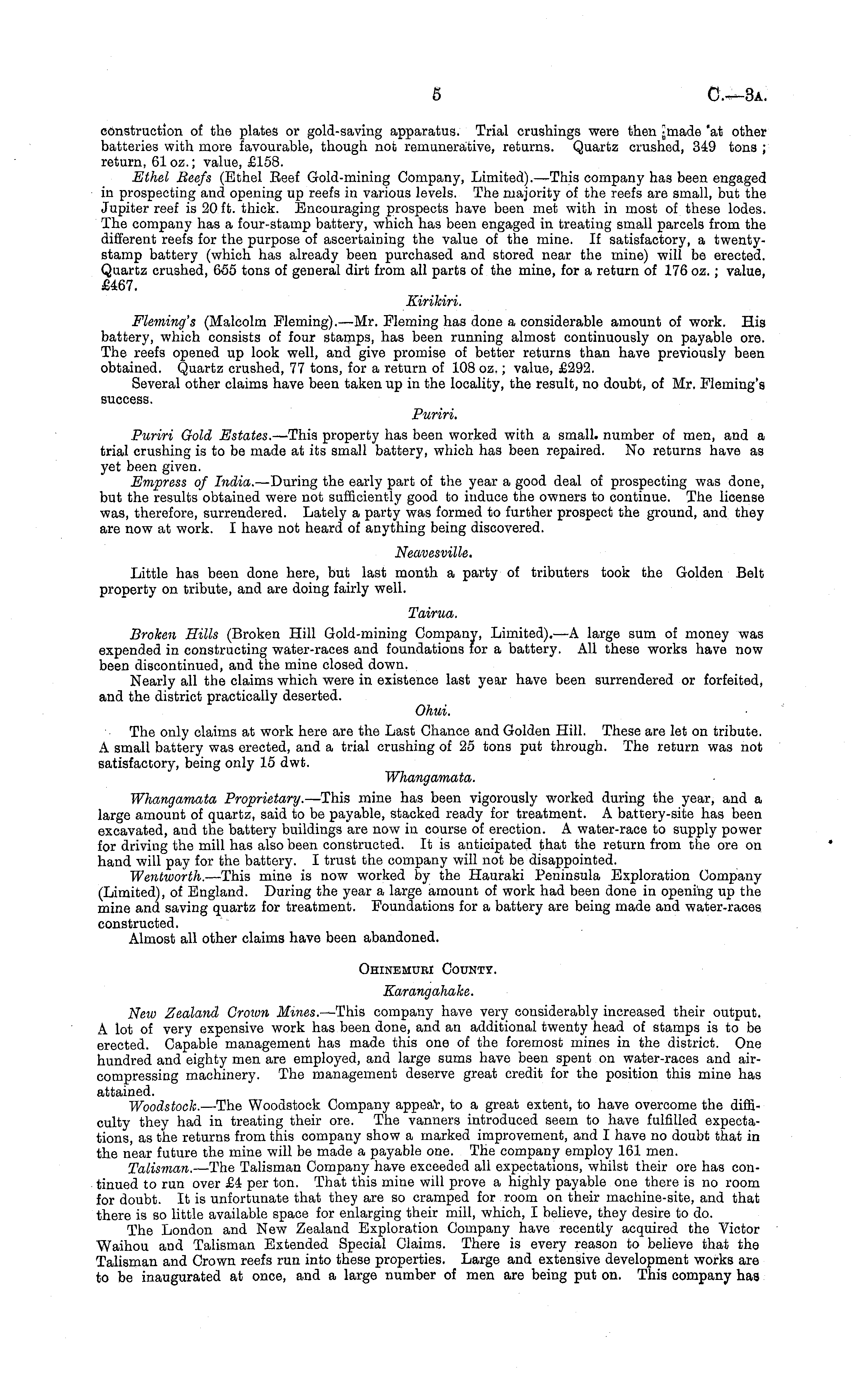 construction of the plates or gold-saving apparatus. Trial crushings were then -made "at other batteries with more favourable, though not remunerative, returns. Quartz crushed, 349 tons ; return, 61 oz.; value, £158. Ethel Beefs (Ethel Eeef Gold-mining Company, Limited). —This company has been engaged in prospecting and opening up reefs in various levels. The majority of the reefs are small, but the Jupiter reef is 20 ft. thick. Encouraging prospects have been met with in most of these lodes. The company has a four-stamp battery, which has been engaged in treating small parcels from the different reefs for the purpose of ascertaining the value of the mine. If satisfactory, a twentystamp battery (which has already been purchased and stored near the mine) will be erected. Quartz crushed, 665 tons of general dirt from all parts of the mine, for a return of 176 oz.; value, £467. Kirikiri. Fleming's (Malcolm Fleming).—Mr. Fleming has done a considerable amount of work. His battery, which consists of four stamps, has been running almost continuously on payable ore. The reefs opened up look well, and give promise of better returns than have previously been obtained. Quartz crushed, 77 tons, for a return of 108 oz.; value, £292. Several other claims have been taken up in the locality, the result, no doubt, of Mr. Fleming's success. Puriri. Puriri Gold Estates. —This property has been worked with a small, number of men, and a trial crushing is to be made at its small battery, which has been repaired. No returns have as yet been given. Empress of India. —During the early part of the year a good deal of prospecting was done, but the results obtained were not sufficiently good to induce the owners to continue. The license was, therefore, surrendered. Lately a party was formed to further prospect the ground, and they are now at work. I have not heard of anything being discovered. Neavesville. Little has been done here, but last month a party of tributers took the Golden Belt property on tribute, and are doing fairly well. Tairua. Broken Hills (Broken Hill Gold-mining Company, Limited). —A large sum of money was expended in constructing water-races and foundations for a battery. All these works have now been discontinued, and the mine closed down. Nearly all the claims which were in existence last year have been surrendered or forfeited, and the district practically deserted. Ohui. The only claims at work here are the Last Chance and Golden Hill. These are let on tribute. A small battery was erected, and a trial crushing of 25 tons put through. The return was not satisfactory, being only 15 dwt. Whangamata. Whangamata Proprietary. —This mine has been vigorously worked during the year, and a large amount of quartz, said to be payable, stacked ready for treatment. A battery-site has been excavated, and the battery buildings are now in course of erection. A water-race to supply power for driving the mill has also been constructed. It is anticipated that the return from the ore on hand will pay for the battery. I trust the company will not be disappointed. Wentworth. —-This mine is now worked by the Hauraki Peninsula Exploration Company (Limited), of England. During the year a large amount of work had been done in opening up the mine and saving quartz for treatment. Foundations for a battery are being made and water-races constructed. Almost all other claims have been abandoned. Ohinemuki County. Karangahake. New Zealand Crown Mines. —This company have very considerably increased their output. A lot of very expensive work has been done, and an additional twenty head of stamps is to be erected. Capable management has made this one of the foremost mines in the district. One hundred and eighty men are employed, and large sums have been spent on water-races and aircompressing machinery. The management deserve great credit for the position this mine has attained. Woodstock. —The Woodstock Company appeal, to a great extent, to have overcome the difficulty they had in treating their ore. The vanners introduced seem to have fulfilled expectations, as the returns from this company show a marked improvement, and I have no doubt that in the near future the mine will be made a payable one. The company employ 161 men. Talisman. —The Talisman Company have exceeded all expectations, whilst their ore has continued to run over £4 per ton. That this mine will prove a highly payable one there is no room for doubt. It is unfortunate that they are so cramped for room on their machine-site, and that there is so little available space for enlarging their mill, which, I believe, they desire to do. The London and New Zealand Exploration Company have recently acquired the Victor Waihou and Talisman Extended Special Claims. There is every reason to believe that the Talisman and Crown reefs run into these properties. Large and extensive development works are to be inaugurated at once, and a large number of men are being put on. This company has