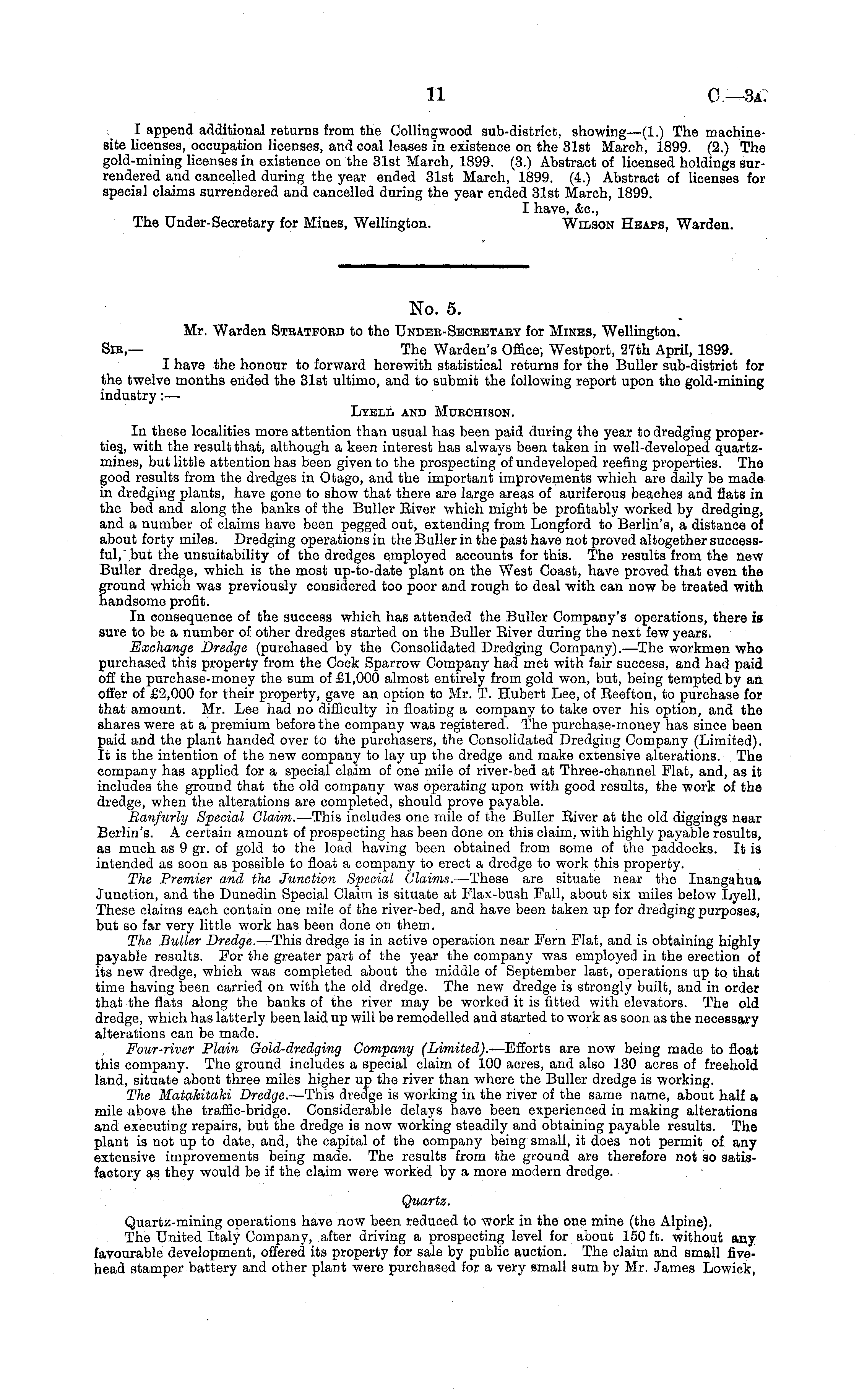 No. 5. Mr. Warden Stratfobd to the Undeb-Seceetaky for Mines, Wellington. Sic,— The Warden's Office; Westport, 27th April, 1899. I have the honour to forward herewith statistical returns for the Buller sub-district for the twelve months ended the 31st ultimo, and to submit the following report upon the gold-mining industry:— Ltell and Mubchison. In these localities more attention than usual has been paid during the year to dredging properties,, with the result that, although a keen interest has always been taken in well-developed quartzmines, but little attention has been given to the prospecting of undeveloped reefing properties. The good results from the dredges in Otago, and the important improvements which are daily be made in dredging plants, have gone to show that there are large areas of auriferous beaches and flats in the bed and along the banks of the Buller Eiver which might be profitably worked by dredging, and a number of claims have been pegged out, extending from Longford to Berlin's, a distance of about forty miles. Dredging operations in the Buller in the past have not proved altogether successful, but the unsuitability of the dredges employed accounts for this. The results from the new Buller dredge, which is the most up-to-date plant on the West Coast, have proved that even the ground which was previously considered too poor and rough to deal with can now be treated with handsome profit. In consequence of the success which has attended the Buller Company's operations, there is sure to be a number of other dredges started on the Buller Eiver during the next few years. Exchange Dredge (purchased by the Consolidated Dredging Company).—The workmen who purchased this property from the Cock Sparrow Company had met with fair success, and had paid off the purchase-money the sum of £1,000 almost entirely from gold won, but, being tempted by an offer of £2,000 for their property, gave an option to Mr. T. Hubert Lee, of Eeefton, to purchase for that amount. Mr. Lee had no difficulty in floating a company to take over his option, and the shares were at a premium before the company was registered. The purchase-money has since been paid and the plant handed over to the purchasers, the Consolidated Dredging Company (Limited). It is the intention of the new company to lay up the dredge and make extensive alterations. The company has applied for a special claim of one mile of river-bed at Three-channel Flat, and, as it includes the ground that the old company was operating upon with good results, the work of the dredge, when the alterations are completed, should prove payable. Banfurly Special Claim.- —This includes one mile of the Buller Eiver at the old diggings near Berlin's. A certain amount of prospecting has been done on this claim, with highly payable results, as much as 9 gr. of gold to the load having been obtained from some of the paddocks. It is intended as soon as possible to float a company to erect a dredge to work this property. The Premier and the Junction Special Claims. —These are situate near the Inangahua Junction, and the Dunedin Special Claim is situate at Flax-bush Fall, about six miles below Lyell, These claims each contain one mile of the river-bed, and have been taken up for dredging purposes, but so far very little work has been done on them. The Buller Dredge.— This dredge is in active operation near Fern Flat, and is obtaining highly payable results. For the greater part of the year the company was employed in the erection of its new dredge, which was completed about the middle of September last, operations up to that time having been carried on with the old dredge. The new dredge is strongly built, and in order that the flats along the banks of the river may be worked it is fitted with elevators. The old dredge, which has latterly been laid up will be remodelled and started to work as soon as the necessary alterations can be made. Four-river Plain Gold-dredging Company (Limited). —Efforts are now being made to float this company. The ground includes a special claim of 100 acres, and also 130 acres of freehold land, situate about three miles higher up the river than where the Buller dredge is working. The Matakitaki Dredge. —This dredge is working in the river of the same name, about half a mile above the traffic-bridge. Considerable delays have been experienced in making alterations and executing repairs, but the dredge is now working steadily and obtaining payable results. The plant is not up to date, and, the capital of the company being small, it does not permit of any extensive improvements being made. The results from the ground are therefore not so satisfactory as they would be if the claim were worked by a more modern dredge. Quartz. Quartz-mining operations have now been reduced to work in the one mine (the Alpine). The United Italy Company, after driving a prospecting level for about 150 ft. without any favourable development, offered its property for sale by public auction. The claim and small fivehead stamper battery and other plant were purchased for a very small sum by Mr. James Lowick,