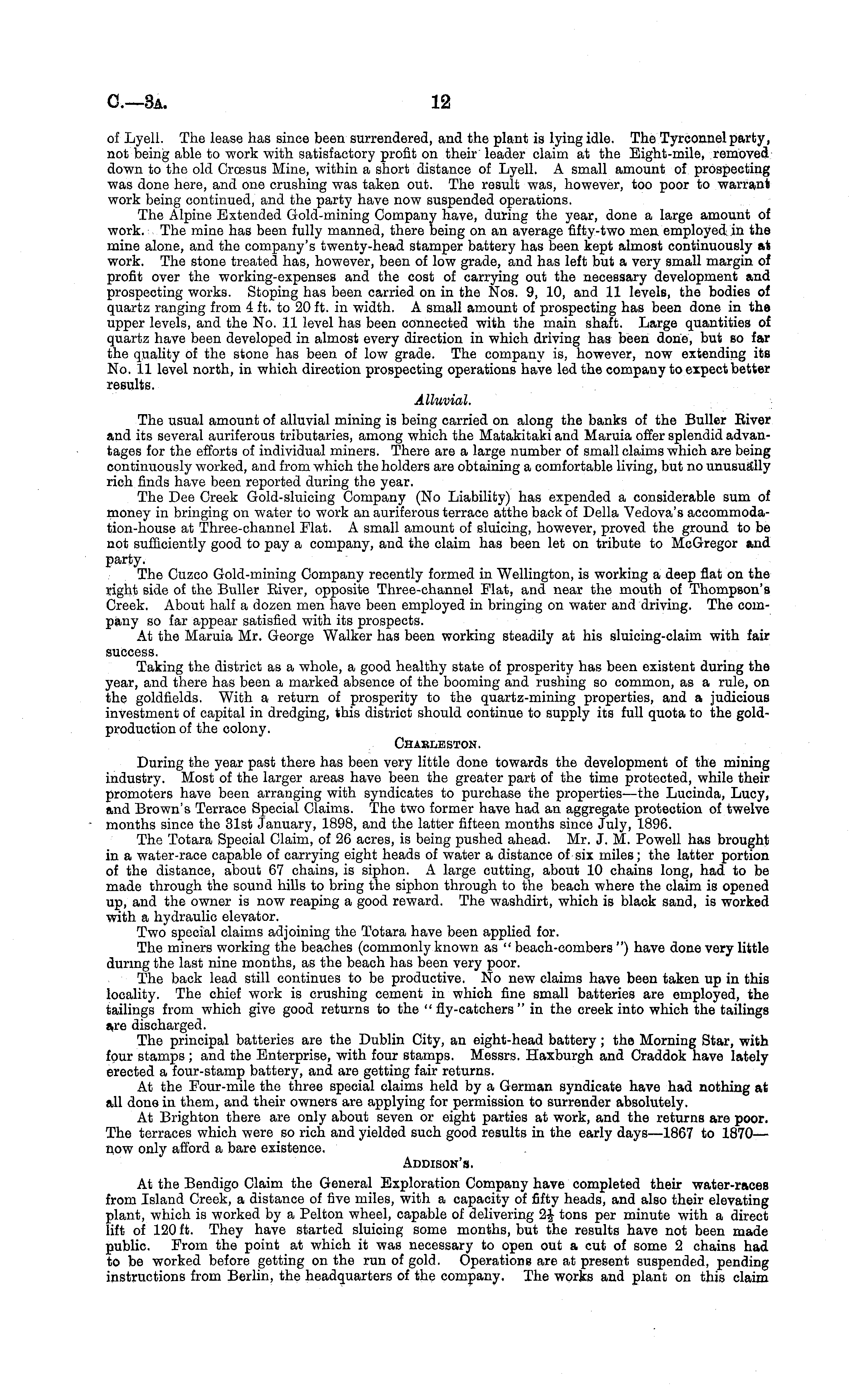 of Lyell. The lease has since been surrendered, and the plant is lying idle. The Tyrconnel party, not being able to work with satisfactory profit on their leader claim at the Bight-mile, removed down to the old Crcesus Mine, within a short distance of Lyell. A small amount of prospecting was done here, and one crushing was taken out. The result was, however, too poor to warrant work being continued, and the party have now suspended operations. The Alpine Extended Gold-mining Company have, during the year, done a large amount of work. The mine has been fully manned, there being on an average fifty-two men employed in the mine alone, and the company's twenty-head stamper battery has been kept almost continuously at work. The stone treated has, however, been of low grade, and has left but a very small margin of profit over the working-expenses and the cost of carrying out the necessary development and prospecting works. Stoping has been carried on in the Nos. 9, 10, and 11 levels, the bodies of quartz ranging from 4 ft. to 20 ft. in width. A small amount of prospecting has been done in the upper levels, and the No. 11 level has been connected with the main shaft. Large quantities of quartz have been developed in almost every direction in which driving has been done, but so far the quality of the stone has been of low grade. The company is, however, now extending its No. 11 level north, in which direction prospecting operations have led the company to expect better results. Alluvial. The usual amount of alluvial mining is being carried on along the banks of the Buller Biver and its several auriferous tributaries, among which the Matakitaki and Maruia offer splendid advantages for the efforts of individual miners. There are a large number of small claims which are being continuously worked, and from which the holders are obtaining a comfortable living, but no unusually rich finds have been reported during the year. The Dee Creek Gold-sluicing Company (No Liability) has expended a considerable sum of money in bringing on water to work an auriferous terrace atthe back of Delia Vedova's accommoda-tion-house at Three-channel Flat. A small amount of sluicing, however, proved the ground to be not sufficiently good to pay a company, and the claim has been let on tribute to McGregor and party. The Cuzco Gold-mining Company recently formed in Wellington, is working a deep fiat on the right side of the Buller Eiver, opposite Three-channel Flat, and near the mouth of Thompson's Creek. About half a dozen men have been employed in bringing on water and driving. The company so far appear satisfied with its prospects. At the Maruia Mr. George Walker has been working steadily at his sluicing-claim with fair success. Taking the district as a whole, a good healthy state of prosperity has been existent during the year, and there has been a marked absence of the booming and rushing so common, as a rule, on the goldfields. With a return of prosperity to the quartz-mining properties, and a judicious investment of capital in dredging, this district should continue to supply its full quota to the goldproduction of the colony. Charleston. During the year past there has been very little done towards the development of the mining industry. Most of the larger areas have been the greater part of the time protected, while their promoters have been arranging with syndicates to purchase the properties—the Lucinda, Lucy, and Brown's Terrace Special Claims. The two former have had an aggregate protection of twelve months since the 31st January, 1898, and the latter fifteen months since July, 1896. The Totara Special Claim, of 26 acres, is being pushed ahead. Mr. J. M. Powell has brought in a water-race capable of carrying eight heads of water a distance of six miles; the latter portion of the distance, about 67 chains, is siphon. A large cutting, about 10 chains long, had to be made through the sound hills to bring the siphon through to the beach where the claim is opened up, and the owner is now reaping a good reward. The washdirt, which is black sand, is worked with a hydraulic elevator. Two special claims adjoining the Totara have been applied for. The miners working the beaches (commonly known as " beach-combers ") have done very little during the last nine months, as the beach has been very poor. The back lead still continues to be productive. No new claims have been taken up in this locality. The chief work is crushing cement in which fine small batteries are employed, the tailings from which give good returns to the " fly-catchers " in the creek into which the tailings are discharged. The principal batteries are the Dublin City, an eight-head battery; the Morning Star, with four stamps ; and the Enterprise, with four stamps. Messrs. Haxburgh and Craddok have lately erected a four-stamp battery, and are getting fair returns. At the Four-mile the three special claims held by a German syndicate have had nothing at all done in them, and their owners are applying for permission to surrender absolutely. At Brighton there are only about seven or eight parties at work, and the returns are poor. The terraces which were so rich and yielded such good results in the early days—lß67 to 1870— now only afford a bare existence. Addison's. At the Bendigo Claim the General Exploration Company have completed their water-races from Island Creek, a distance of five miles, with a capacity of fifty heads, and also their elevating plant, which is worked by a Pelton wheel, capable of delivering 2J tons per minute with a direct lift of 120 ft. They have started sluicing some months, but the results have not been made public. From the point at which it was necessary to open out a cut of some 2 chains had to be worked before getting on the run of gold. Operations are at present suspended, pending instructions from Berlin, the headquarters of the company. The works and plant on this claim