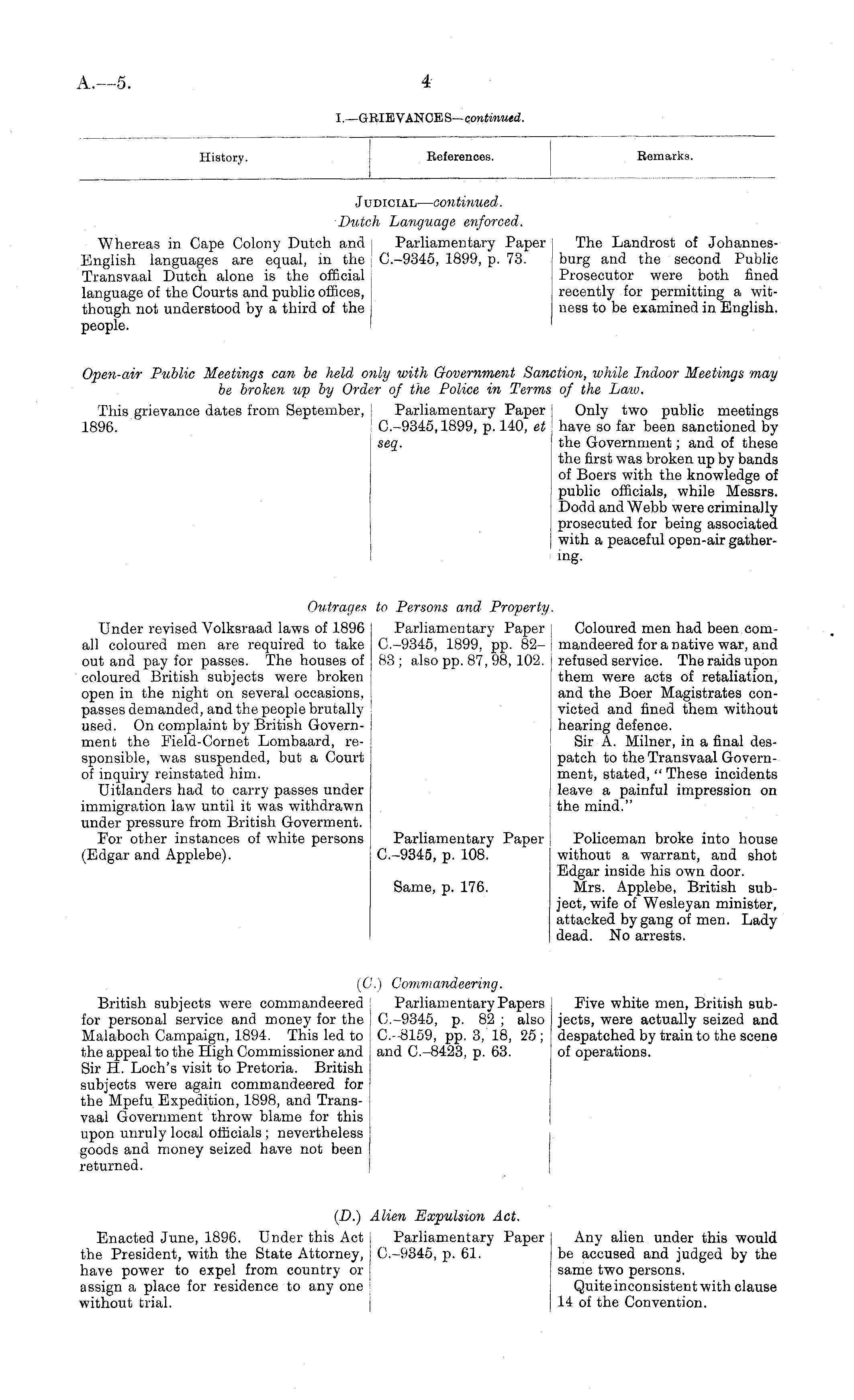 history. terences. ternari ks. Judicial — continued. Dutch Language enforced. Whereas in Cape Colony Dutch and Parliamentary Paper The Landrost of JohannesEnglish languages are equal, in the C.-9345, 1899, p. 73. burg and the second Public Transvaal Dutch alone is the official Prosecutor were both fined language of the Courts and public offices, recently for permitting a witthough not understood by a third of the ness to be examined in English, people. Open-air Public Meetings can be held only with Government Sanction, while Indoor Meetings may be broken up by Order of the Police in Terms of the Law. This grievance dates from September, ■ Parliamentary Paper I Only two public meetings 1896. I C.-9345,1899, p. 140, et have so far been sanctioned by seq. the Government; and of these the first was broken up by bands of Boers with the knowledge of public officials, while Messrs. Dodd and Webb were criminally prosecuted for being associated with a peaceful open-air gathering. Outrages to Persons and Property. Under revised Volksraad laws of 1896 Parliamentary Paper : Coloured men had been cornall coloured men are required to take C.-9345, 1899, pp. 82-; mandeered for a native war, and out and pay for passes. The houses of 83; also pp. 87, 98, 102. refused service. The raids upon coloured British subjects were broken | them were acts of retaliation, open in the night on several occasions, and the Boer Magistrates conpasses demanded, and the people brutally victed and fined them without used. On complaint by British Govern- hearing defence, ment the Field-Cornet Lombaard, re- Sir A. Milner, in a final dessponsible, was suspended, but a Court patch to the Transvaal Governof inquiry reinstated him. ment, stated, " These incidents Uitlanders had to carry passes under leave a painful impression on immigration law until it was withdrawn the mind." under pressure from British Goverment. For other instances of white persons Parliamentary Paper Policeman broke into house (Edgar and Applebe). C.-9345, p. 108. without a warrant, and shot Edgar inside his own door. Same, p. 176. Mrs. Applebe, British subject, wife of Wesleyan minister, attacked by gang of men. Lady dead. No arrests. (C.) Commandeering. British subjects were commandeered j Parliamentary Papers Five white men, British subfor personal service and money for the ; C.-9345, p. 82 ; also ] jects, were actually seized and Malaboch Campaign, 1894. This led to j C.--8159, pp.3, 18, 25; despatched by train to the scene the appeal to the High Commissioner and j and C.-8423, p. 63. of operations. Sir H. Loch's visit to Pretoria. British j subjects were again commandeered for the Mpefu Expedition, 1898, and Transvaal Government throw blame for this upon unruly local officials ; nevertheless goods and money seized have not been returned. (D.) Alien Expulsion Act. Enacted June, 1896. Under this Act I Parliamentary Paper j Any alien under this would the President, with the State Attorney, C.-9345, p. 61. i be accused and judged by the have power to expel from country or same two persons, assign a place for residence to any one Quite inconsistent with clause without trial. 14 of the Convention.