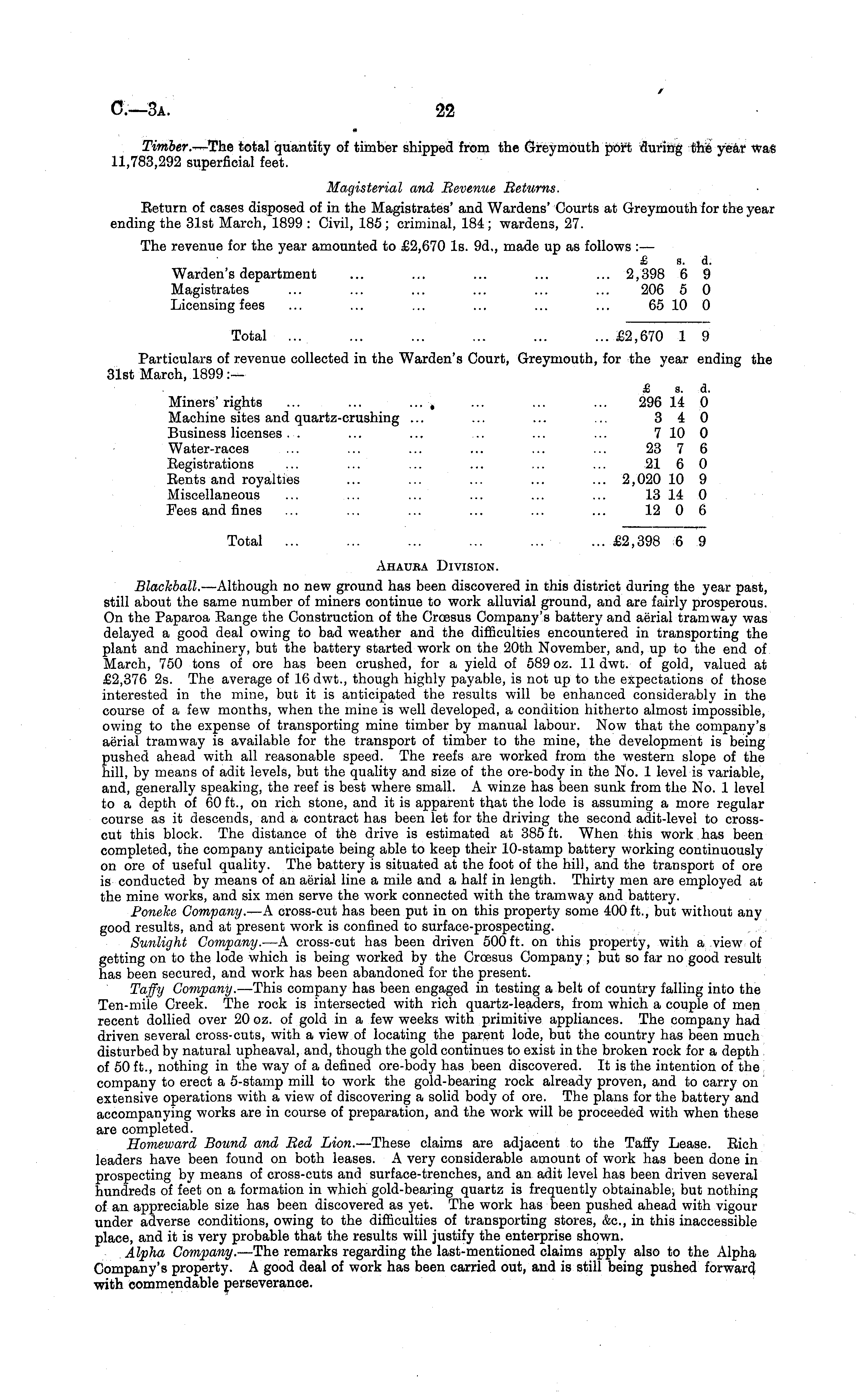 Timber. —r-The total quantity of timber shipped from the Greymouth port during the year was 11,783,292 superficial feet. Magisterial and Revenue Returns. Eeturn of cases disposed of in the Magistrates' and Wardens' Courts at Greymouth for the year ending the 31st March, 1899 : Civil, 185; criminal, 184; wardens, 27. The revenue for the year amounted to £2,670 Is. 9d,, made up as follows : — £ s. d. Warden's department ... ... ... ... ... 2,398 6 9 Magistrates ... ... ... ... ... ... 206 5 0 Licensing fees ... ... ... ... ... ... 65 10 0 Total ... ... ... ... ... ... £2,670 1 9 Particulars of revenue collected in the Warden's Court, Greymouth, for the year ending the 31st March, 1899 :— £ a. a. Miners'rights ... ... .... ... ... ... 296 14 0 Machine sites and quartz-crushing ... ... ... ... 340 Business licenses. . ... ... .. ... ... 7 10 0 Water-races ... ... ... ... ... ... 23 7 6 Registrations ... ... ... ... ... ... 21 6 0 Eents and royalties ... ... ... ... ... 2,020 10 9 Miscellaneous ... ... ... ... ... ... 13 14 0 Fees and fines ... ... ... ... ... ... 12 0 6 Total ... ... ... ... ... ... £2,398 6 9 Ahauba Division. Blackball. —Although no new ground has been discovered in this district during the year past, still about the same number of miners continue to work alluvial ground, and are fairly prosperous. On the Paparoa Bange the Construction of the Croesus Company's battery and aerial tramway was delayed a good deal owing to bad weather and the difficulties encountered in transporting the plant and machinery, but the battery started work on the 20th November, and, up to the end of March, 750 tons of ore has been crushed, for a yield of 589 oz. 11 dwt. of gold, valued at £2,376 2s. The average of 16 dwt., though highly payable, is not up to the expectations of those interested in the mine, but it is anticipated the results will be enhanced considerably in the course of a few months, when the mine is well developed, a condition hitherto almost impossible, owing to the expense of transporting mine timber by manual labour. Now that the company's aerial tramway is available for the transport of timber to the mine, the development is being pushed ahead with all reasonable speed. The reefs are worked from the western slope of the hill, by means of adit levels, but the quality and size of the ore-body in the No. 1 level is variable, and, generally speaking, the reef is best where small. A winze has been sunk from the No. 1 level to a depth of 60 ft., on rich stone, and it is apparent that the lode is assuming a more regular course as it descends, and a contract has been let for the driving the second adit-level to crosscut this block. The distance of the drive is estimated at 385 ft. When this work has been completed, the company anticipate being able to keep their 10-stamp battery working continuously on ore of useful quality. The battery is situated at the foot of the hill, and the transport of ore is conducted by means of an aerial line a mile and a half in length. Thirty men are employed at the mine works, and six men serve the work connected with the tramway and battery. Poneke Company. —A cross-cut has been put in on this property some 400 ft., but without any good results, and at present work is confined to surface-prospecting. Sunlight Company. —A cross-cut has been driven 500 ft. on this property, with a view of getting on to the lode which is being worked by the Croesus Company; but so far no good result has been secured, and work has been abandoned for the present. Taffy Company. —This company has been engaged in testing a belt of country falling into the Ten-mile Creek. The rock is intersected with rich quartz-leaders, from which a couple of men recent dollied over 20 oz. of gold in a few weeks with primitive appliances. The company had driven several cross-cuts, with a view of locating the parent lode, but the country has been much disturbed by natural upheaval, and, though the gold continues to exist in the broken rock for a depth of 50 ft., nothing in the way of a defined ore-body has been discovered. It is the intention of the company to erect a 5-stamp mill to work the gold-bearing rock already proven, and to carry on extensive operations with a view of discovering a solid body of ore. The plans for the battery and accompanying works are in course of preparation, and the work will be proceeded with when these are completed. Homeward Bound and Red Lion. —These claims are adjacent to the Taffy Lease. Rich leaders have been found on both leases. A very considerable amount of work has been done in prospecting by means of cross-cuts and surface-trenches, and an adit level has been driven several hundreds of feet on a formation in which gold-bearing quartz is frequently obtainable, but nothing of an appreciable size has been discovered as yet. The work has been pushed ahead with vigour under adverse conditions, owing to the difficulties of transporting stores, &c, in this inaccessible place, and it is very probable that the results will justify the enterprise shown. Alpha Company. —The remarks regarding the last-mentioned claims apply also to the Alpha Company's property. A good deal of work has been carried out, and is still being pushed forward, with commendable perseverance.
