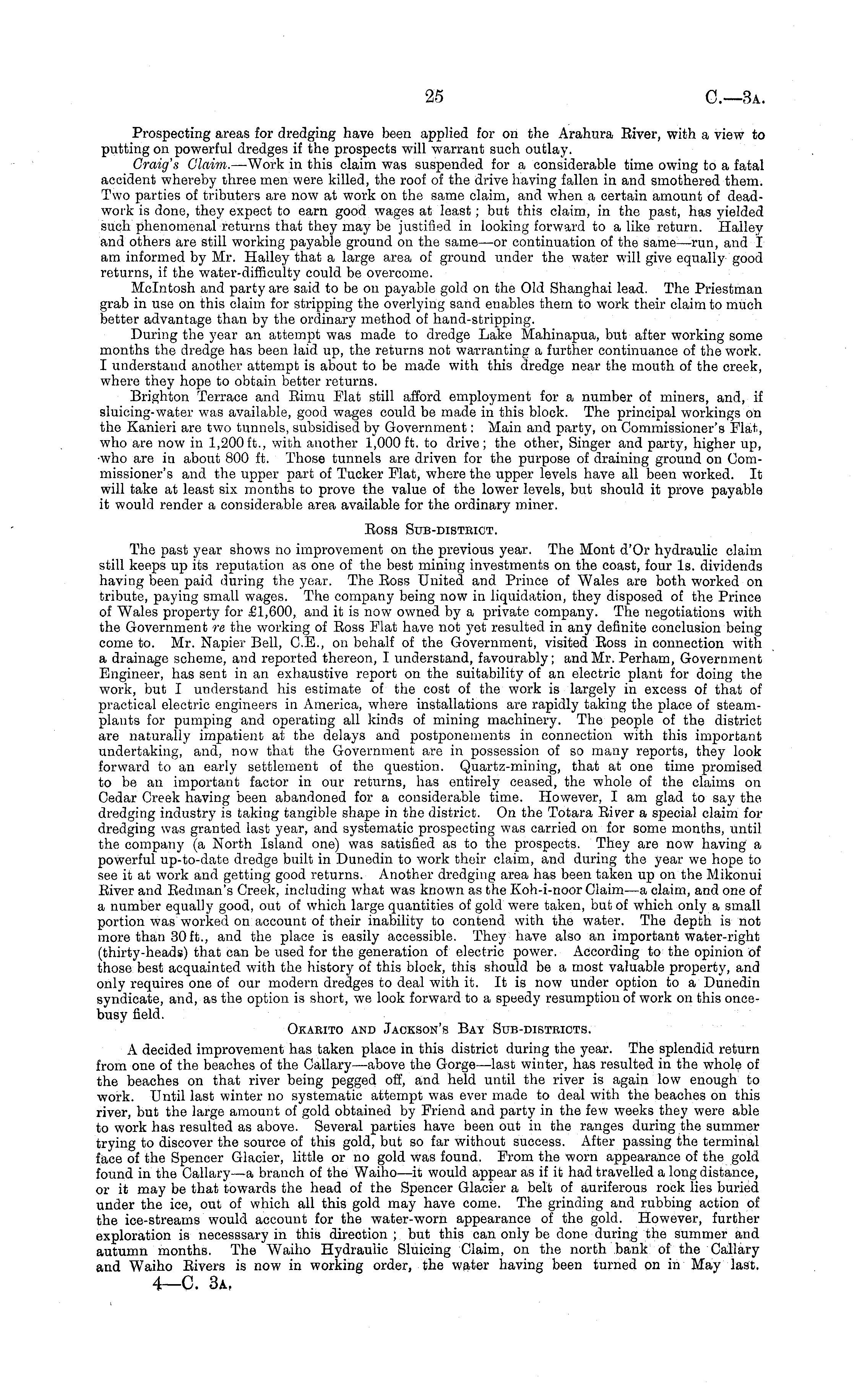 Prospecting areas for dredging have been applied for on the Arahura Eiver, with a view to putting on powerful dredges if the prospects will warrant such outlay. Craig's Claim. —Work in this claim was suspended for a considerable time owing to a fatal accident whereby three men were killed, the roof of the drive having fallen in and smothered them. Two parties of tributers are now at work on the same claim, and when a certain amount of deadwork is done, they expect to earn good wages at least; but this claim, in the past, has yielded such phenomenal returns that they may be justified in looking forward to a like return. Ilalley and others are still working payable ground on the same—or continuation of the same—run, and I am informed by Mr. Halley that a large area of ground under the water will give equally good returns, if the water-difficulty could be overcome. Mclntosh and party are said to be on payable gold on the Old Shanghai lead. The Priestman grab in use on this claim for stripping the overlying sand enables them to work their claim to much better advantage than by the ordinary method of hand-stripping. During the year an attempt was made to dredge Lake Mahinapua, but after working some months the dredge has been laid up, the returns not warranting a further continuance of the work. I understand another attempt is about to be made with this dredge near the mouth of the creek, where they hope to obtain better returns. Brighton Terrace and Eimu Plat still afford employment for a number of miners, and, if sluicing-water was available, good wages could be made in this block. The principal workings on the Kanieri are two tunnels, subsidised by Government: Main and party, on Commissioner's Flat, who are now in 1,200 ft., with another I,oooft. to drive; the other, Singer and party, higher up, •who are in about 800 ft. Those tunnels are driven for the purpose of draining ground on Commissioner's and the upper part of Tucker Flat, where the upper levels have all been worked. It will take at least six months to prove the value of the lower levels, but should it prove payable it would render a considerable area available for the ordinary miner. BOSS Suß-DISTBICT. The past year shows no improvement on the previous year. The Mont dOr hydraulic claim still keeps up its reputation as one of the best mining investments on the coast, four Is. dividends having been paid during the year. The Eoss United and Prince of Wales are both worked on tribute, paying small wages. The company being now in liquidation, they disposed of the Prince of Wales property for £1,600, and it is now owned by a private company. The negotiations with the Government re the working of Eoss Flat have not yet resulted in any definite conclusion being come to. Mr. Napier Bell, C.E., on behalf of the Government, visited Eoss in connection with a drainage scheme, and reported thereon, I understand, favourably; and Mr. Perham, Government Engineer, has sent in an exhaustive report on the suitability of an electric plant for doing the work, but I understand his estimate of the cost of the work is largely in excess of that of practical electric engineers in America, where installations are rapidly taking the place of steamplants for pumping and operating all kinds of mining machinery. The people of the district are naturally impatient at the delays and postponements in connection with this important undertaking, and, now that the Government are in possession of so many reports, they look forward to an early settlement of the question. Quartz-mining, that at one time promised to be an important factor in our returns, has entirely ceased, the whole of the claims on Cedar Creek having been abandoned for a considerable time. However, I am glad to say the dredging industry is taking tangible shape in the district. On the Totara Eiver a special claim for dredging was granted last year, and systematic prospecting was carried on for some months, until the company (a North Island one) was satisfied as to the prospects. They are now having a powerful up-to-date dredge built in Dunedin to work their claim, and during the year we hope to see it at work and getting good returns. Another dredging area has been taken up on the Mikonui Eiver and Eedman's Creek, including what was known as the Koh-i-noor Claim—a claim, and one of a number equally good, out of which large quantities of gold were taken, but of which only a small portion was worked on account of their inability to contend with the water. The depth is not more than 30 ft., and the place is easily accessible. They have also an important water-right (thirty-heads) that can be used for the generation of electric power. According to the opinion of those best acquainted with the history of this block, this should be a most valuable property, and only requires one of our modern dredges to deal with it. It is now under option to a Dunedin syndicate, and, as the option is short, we look forward to a speedy resumption of work on this oncebusy field. Okakito and Jackson's Bay Sub-disteicts. A decided improvement has taken place in this district during the year. The splendid return from one of the beaches of the Callary—above the Gorge—last winter, has resulted in the whole of the beaches on that river being pegged off, and held until the river is again low enough to work. Until last winter no systematic attempt was ever made to deal with the beaches on this river, but the large amount of gold obtained by Friend and party in the few weeks they were able to work has resulted as above. Several parties have been out in the ranges during the summer trying to discover the source of this gold, but so far without success. After passing the terminal face of the Spencer Glacier, little or no gold was found. From the worn appearance of the gold found in the Callary —a branch of the Waiho—it would appear as if it had travelled a long distance, or it may be that towards the head of the Spe