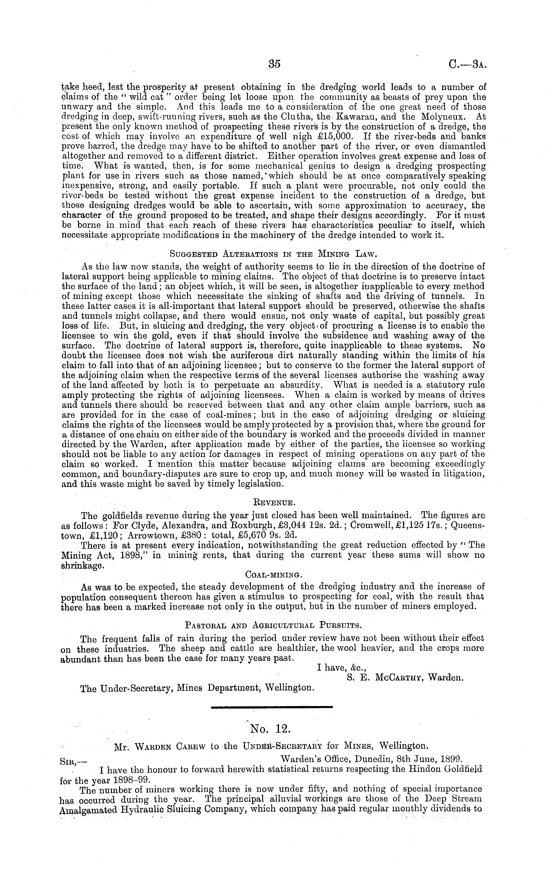 take heed, lest the prosperity at present obtaining in the dredging world leads to a number of claims of the " wild cat " order being let loose upon the community as. beasts of prey upon the unwary and the simple. And this leads me to a consideration of the one great need of those dredging in deep, swift-running rivers, such as the Clutha, the Kawarau, and the Molyneux. At present the only known method of prospecting these rivers is by the construction of a dredge, the cost of which may involve an expenditure of well nigh £15,000. If the river-beds and banks prove barred, the dredge may have to be shifted to another part of the river, or even dismantled altogether and removed to a different district. Either operation involves great expense and loss of time. What is wanted, then, is for some mechanical genius to design a dredging prospecting plant for use in rivers such as those named,"which should be at once comparatively speaking inexpensive, strong, and easily portable. If such a plant were procurable, not only could the river-beds be tested without the great expense incident to the construction of a dredge, but those designing dredges would be able to ascertain, with some approximation to accuracy, the character of the ground proposed to be treated, and shape their designs accordingly. For it must be borne in mind that each reach of these rivers has characteristics peculiar to itself, which necessitate appropriate modifications in the machinery of the dredge intended to work it. Suggested Alterations in the Mining Law. As the law now stands, the weight of authority seems to lie in the direction of the doctrine of lateral support being applicable to mining claims. The object of that doctrine is to preserve intact the surface of the land; an object which, it will be seen, is altogether inapplicable to every method of mining except those which necessitate the sinking of shafts and the driving of tunnels. In these latter cases it is all-important that lateral support should be preserved, otherwise the shafts and tunnels might collapse, and there would ensue, not only waste of capital, but possibly great loss of life. But, in sluicing and dredging, the very object of procuring a license is to enable the licensee to win the gold, even if that should involve the subsidence and washing away of the surface. The doctrine of lateral support is, therefore, quite inapplicable to these systems. No doubt the licensee does not wish the auriferous dirt naturally standing within the limits of his claim to fall into that of an adjoining licensee; but to conserve to the former the lateral support of the adjoining claim when the respective terms of the several licenses authorise the washing away of the land affected by both is to perpetuate an absurdity. What is needed is a statutory rule amply protecting the rights of adjoining licensees. When a claim is worked by means of drives and tunnels there should be reserved between that and any other claim ample barriers, such as are provided for in the case of coal-mines; but in the case of adjoining dredging or sluicing claims the rights of the licensees would be amply protected by a provision that, where the ground for a distance of one chain on either side of the boundary is worked and the proceeds divided in manner directed by the Warden, after application made by either of the parties, the licensee so working should not be liable to any action for damages in respect of mining operations on any part of the claim so worked. I mention this matter because adjoining claims are becoming exceedingly common, and boundary-disputes are sure to crop up, and much money will be wasted in litigation, and this waste might be saved by timely legislation. Revenue. The goldfields revenue during the year just closed has been well maintained. The figures are as follows : For Clyde, Alexandra, and Eoxburgh, £3,044 12s. 2d.; Cromwell, £1,125 175.; Queenstown, £1,120; Arrowtown, £380 : total, £5,670 9s. 2d. There is at present every indication, notwithstanding the great reduction effected by " The Mining Act, 1898," in mining rents, that during the current year these sums will show no shrinkage. Coal-mining. As was to.be expected, the steady development of the dredging industry and the increase of population consequent thereon has given a stimulus to prospecting for coal, with the result that there has been a marked increase not only in the output, but in the number of miners employed. Pastoral and Agricultural Pursuits. The frequent falls of rain during the period under review have not been without their effect on these industries. The sheep and cattle are healthier, the wool heavier, and the crops more abundant than has been the case for many years past. I have, &c, S. E. McCarthy, Warden. The Under-Secretary, Mines Department, Wellington.