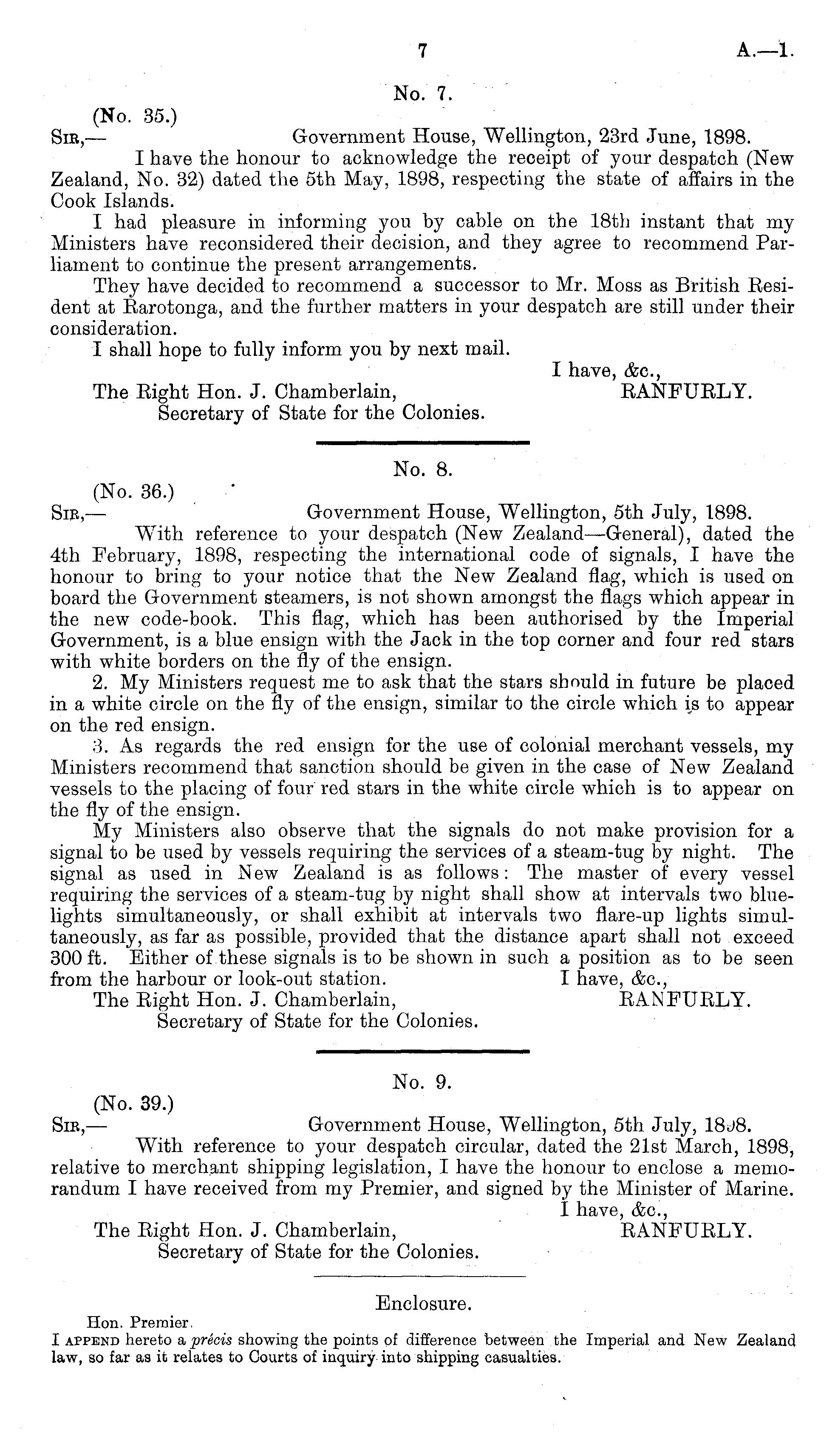 No. 8. (No. 36.) Sic, — Government House, Wellington, sth July, 1898. With reference to your despatch (New Zealand—General), dated the 4th February, 1898, respecting the international code of signals, I have the honour to bring to your notice that the New Zealand flag, which is used on board the Government steamers, is not shown amongst the flags which appear in the new code-book. This flag, which has been authorised by the Imperial Government, is a blue ensign with the Jack in the top corner and four red stars with white borders on the fly of the ensign. 2. My Ministers request me to ask that the stars should in future be placed in a white circle on the fly of the ensign, similar to the circle which is to appear on the red ensign. 3. As regards the red ensign for the use of colonial merchant vessels, my Ministers recommend that sanction should be given in the case of New Zealand vessels to the placing of four red stars in the white circle which is to appear on the fly of the ensign. My Ministers also observe that the signals do not make provision for a signal to be used by vessels requiring the services of a steam-tug by night. The signal as used in New Zealand is as follows: The master of every vessel requiring the services of a steam-tug by night shall show at intervals two bluelights simultaneously, or shall exhibit at intervals two flare-up lights simultaneously, as far as possible, provided that the distance apart shall not exceed 300 ft. Either of these signals is to be shown in such a position as to be seen from the harbour or look-out station. I have, &c, The Right Hon. J. Chamberlain, RANFURLY. Secretary of State for the Colonies.