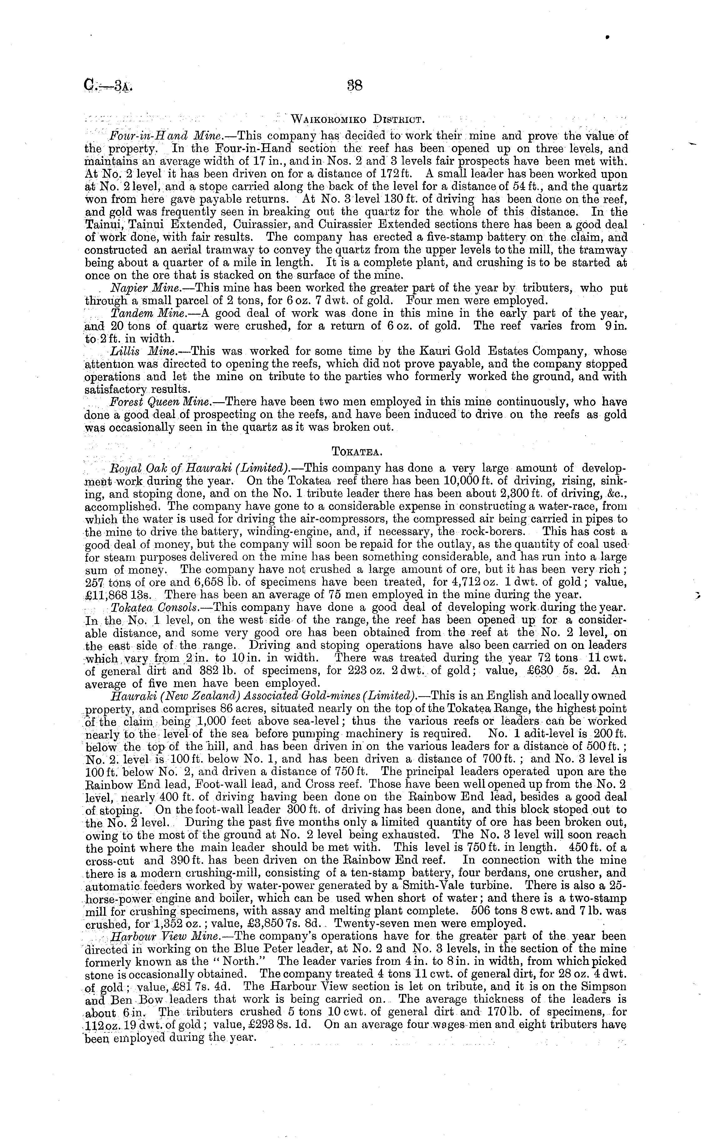 -' ■-•".'■.-■- Waikokomiko Disthict. ; ' ' Four-in-H and Mine. —This company has decided to work their mine and prove the value of the property. In the Pour-in-Hand section the reef has been opened up on three levels, and maintains an average width of 17 in., and in Nos. 2 and 3 levels fair prospects have been met with. At No.. 2 level it has been driven on for a distance of 172 ft. A small leader has been worked upon at No. 2 level, and a stope carried along the back of the level for a distance of 54 ft., and the quartz won from here gave payable returns. At No. 3 level 130 ft. of driving has been done on the reef, and gold was frequently seen in breaking out the quartz for the whole of this distance. In the Tainui, Tainui Extended, Cuirassier, and Cuirassier Extended sections there has been a good deal of work done, with fair results. The company has erected a five-stamp battery on the claim, and constructed an aerial tramway to convey the quartz from the upper levels to the mill, the tramway being about a quarter of a mile in length. It is a complete plant, and crushing is to be started at once on the ore that is stacked on the surface of the mine. Napier Mine. —This mine has been worked the greater part of the year by tributers, who put through a small parcel of 2 tons, for 6 oz. 7 dwt. of gold. Pour men were employed. Tandem Mine. —A good deal of work was done in this mine in the early part of the year, and 20 tons of quartz were crushed, for a return of 6 oz. of gold. The reef varies from 9 in. to 2ft. in width. Lillis Mine.— This was worked for some time by the Kauri Gold Estates Company, whose attention was directed to opening the reefs, which did not prove payable, and the company stopped operations and let the mine on tribute to the parties who formerly worked the ground, and with satisfactory results. Forest Queen Mine. —There have been two men employed in this mine continuously, who have done a good deal of prospecting on the reefs, and have been induced to drive ou the reefs as gold was occasionally seen in the quartz as it was broken out. Tokatba. Royal Oak of Hauraki (Limited). —This company has done a very large amount of development work during the year. On the Tokatea reef there has been 10,000 ft. of driving, rising, sinking, and stoping done, and on the No. 1 tribute leader there has been about 2,300 ft. of driving, &c, accomplished. The company have gone to a considerable expense in constructing a water-race, from which the water is used for driving the air-compressors, the compressed air being carried in pipes to the mine to drive the battery, winding-engine, and, if necessary, the rock-borers. This has cost a good deal of money, but the company will soon be repaid for the outlay, as the quantity of coal used for steam purposes delivered on the mine has been something considerable, and has run into a large sum of money. The company have not crushed a large amount of ore, but it has been very rich ; 257 tons of ore and 6,658 lb. of specimens have been treated, for 4,712 oz. 1 dwt. of gold ; value, £11,868 13s. There has been an average of 75 men employed in the mine during the year. Tokatea Consols. —This company have done a good deal of developing work during the year. In the. No. 1 level, on the west side of the range, the reef has been opened up for a considerable distance, and some very good ore has been obtained from the reef at the No. 2 level, on the east side of the range. Driving and stoping operations have also been carried on on leaders which,vary from 2in. to 10in. in width. There was treated during the year 72 tons llcwt. of general dirt and 382 lb. of specimens, for 223 oz. 2 dwt. of gold; value, £630 ss. 2d. An average of five men have been employed. Hauraki (New Zealand) Associated Gold-mines (Limited). —This is an English and locally owned property, and comprises 86 acres, situated nearly on the top of the Tokatea Bange, the highest point of the claim being 1,000 feet above sea-level; thus the various reefs or leaders can be worked nearly to the level of the sea before pumping machinery is required. No. 1 adit-level is 200 ft. below the top of the hill, and has been driven in on the various leaders for a distance of 500 ft. ; No. 2. level is 100 ft. below No. 1, and has been driven a distance of 700 ft. ; and No. 3 level is 100 ft. below No. 2, and driven a distance of 750 ft. The principal leaders operated upon are the Eainbow End lead, Poot-wall lead, and Cross reef. Those have been well opened up from the No. 2 level, nearly 400 ft. of driving having been done on the Eainbow End lead, besides a good deal of stoping. On the foot-wall leader 300 ft. of driving has been done, and this block stoped out to the No. 2 level. During the past five months only a limited quantity of ore has been broken out, owing to the most of the ground at No. 2 level being exhausted. The No. 3 level will soon reach the point where the main leader should be met with. This level is 750 ft. in length. 450 ft. of a cross-cut and 390 ft. has been driven on the Eainbow End reef. In connection with the mine there is a modern crushing-mill, consisting of a ten-stamp battery, four berdans, one crusher, and automatic feeders worked by water-power generated by a Smith-Vale turbine. There is also a 25----horse-power engine and boiler, which can be used when short of water; and there is a two-stamp mill for crushing specimens, with assay and melting plant complete. 506 tons 8 cwt. and 7 lb. was crushed, for 1,352 oz.; value, £3,850 7s. Bd. Twenty-seven men were employed. . . Harbour View Mine. —The company's operations have for the greater part of the year been directed in working on the Blue Peter leader, at No. 2 and No. 3 levels, in the section of the mine formerly known as the " North." The leader varies from 4in. to Bin. in width, from which picked stone isoccasionally obtained. The company treated 4 tons 11 cwt. of general dirt, for 28 oz. 4 dwt. of 