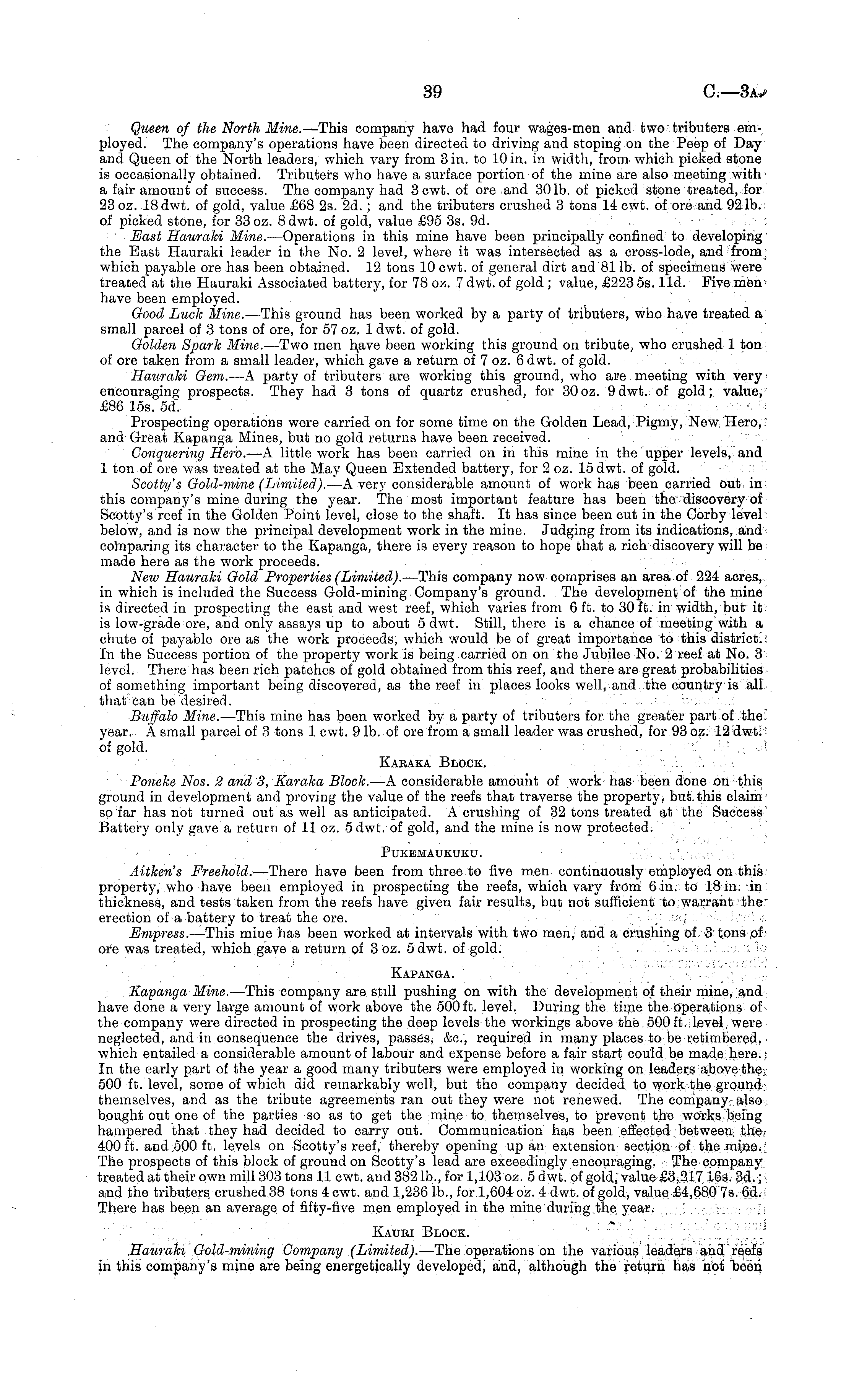 Queen of the North Mine. —This company have had four wages-men and two tributers employed. The company's operations have been directed to driving and stoping on the Peep of Day and Queen of the North leaders, which vary from 3 in. to 10 in. in width, from which picked stone is occasionally obtained. Tributers who have a surface portion of the mine are also meeting with a fair amount of success. The company had 3cwt. of ore and 301b. of picked stone treated, for 23 oz. 18 dwt. of gold, value £68 2s. 2d.; and the tributers crushed 3 tons 14 cwt. of ore and 921b. of picked stone, for 33 oz. Bdwt. of gold, value £95 3s. 9d. East Haurahi Mine. —Operations in this mine have been principally confined to developing the Bast Hauraki leader in the No. 2 level, where it was intersected as a cross-lode, and from which payable ore has been obtained. 12 tons 10 cwt. of general dirt and 81 lb. of specimens were treated at the Hauraki Associated battery, for 78 oz. 7 dwt. of gold ; value, £223 ss. lid. Five men have been employed. Good Luck Mine. —This ground has been worked by a party of tributers, who have treated a small parcel of 3 tons of ore, for 57 oz. 1 dwt. of gold. Golden Spark Mine. —Two men have been working this ground on tribute, who crushed 1 ton of ore taken from a small leader, which gave a return of 7 oz. 6 dwt. of gold. Hauraki Gem. —A party of tributers are working this ground, who are meeting with very encouraging prospects. They had 3 tons of quartz crushed, for 30oz. 9dwt. of gold; value, £86 15s. 6dL Prospecting operations were carried on for some time on the Golden Lead, Pigmy, New. Hero,. and Great Kapanga Mines, but no gold returns have been received. Conquering Hero. —A little work has been carried on in this mine in the upper levels, and 1 ton of ore was treated at the May Queen Extended battery, for 2 oz. 15 dwt. of gold. Scotty's Gold-mine (Limited). —A very considerable amount of work has been carried out in this company's mine during the year. The most important feature has been the discovery of Scotty's reef in the Golden Point level, close to the shaft. It has since been cut in the Corby level below, and is now the principal development work in the mine. Judging from its indications, and comparing its character to the Kapanga, there is every reason to hope that a rich discovery will be made here as the work proceeds. Neiv Hauraki Gold Properties (Limited). —This company now comprises an area of 224 acres, in which is included the Success Gold-mining Company's ground. The development of the mine is directed in prospecting the east and west reef, which varies from 6 ft. to 30 ft. in width, but is low-grade ore, and only assays up to about 5 dwt. Still, there is a chance of meetiDg with a chute of payable ore as the work proceeds, which would be of great importance to this district. In the Success portion of the property work is being carried on on the Jubilee No. 2 reef at No. 3 level. There has been rich patches of gold obtained from this reef, and there are great probabilities of something important being discovered, as the reef in places looks well, and the country is all that can be desired. -...■•■■. Buffalo Mine. —This mine has been worked by a party of tributers for the greater part.of the; year. A small parcel of 3 tons 1 cwt. 9 lb. of ore from a small leader was crushed, for 93 oz. 12 dwt.' of gold. . . . •->! Kabaka Block. Poneke Nos. 2 and 3, Karaka Block. —A considerable amount of work has been done on this ground in development and proving the value of the reefs that traverse the property, but this claim so far has not turned out as well as anticipated. A crushing of 32 tons treated at the Success Battery only gave a return of 11 oz. 5 dwt. of gold, and the mine is now protected; PUKEMAUKOKU. * Aitken's Freehold. —There have been from three to five men continuously employed on this ; property, who have been employed in prospecting the reefs, which vary from 6 in. to 18 in. in thickness, and tests taken from the reefs have given fair results, but not sufficient to warrant the" erection of a battery to treat the ore. .' • ; Empress. —This mine has been worked at intervals with two men, and a crushing of 3 tons of ore was treated, which gave a return of 3 oz. 5 dwt. of gold. Kapanga. Kapanga Mine. —This company are still pushing on with the development of their mine, and have done a very large amount of work above the 500 ft. level. During the time the operations, of the company were directed in prospecting the deep levels the workings above the 500 ft. level were neglected, and in consequence the drives, passes, &c, required in many places to be retimbered, which entailed a considerable amount of labour and expense before a fair start could be made here,; In the early part of the year a good many tributers were employed in working on leaders above the, 500 ft. level, some of which did remarkably well, but the company decided to work the ground themselves, and as the tribute agreements ran out they were not renewed. The company also, b.ought out one of the parties so as to get the mine to themselves, to prevent the works being hampered that they had decided to carry out. Communication has been effected between the; 400 ft. and .500 ft. levels on Scotty's reef, thereby opening up an extension section of the mine. The prospects of this block of ground on Scotty's lead are exceedingly encouraging, The company treated at their own mill 303 tons 11 cwt. and 382 lb., for 1,103 oz. 5 dwt. of gold, value £3,217 16s. 3d.; and the tributers crushed 38 tons 4 cwt. and 1,236 lb., for 1,604 oz. 4 dwt. of gold, value £4,680 7s. 6d. There has been an average of fifty-five men employed in the mine during the year. " \ Kaubi Block. 7 Hauraki Gold-mining Company (Limited). —The operations on the various leaders and "reefs in this company's mine are being energetically developed, and, although the return has not been