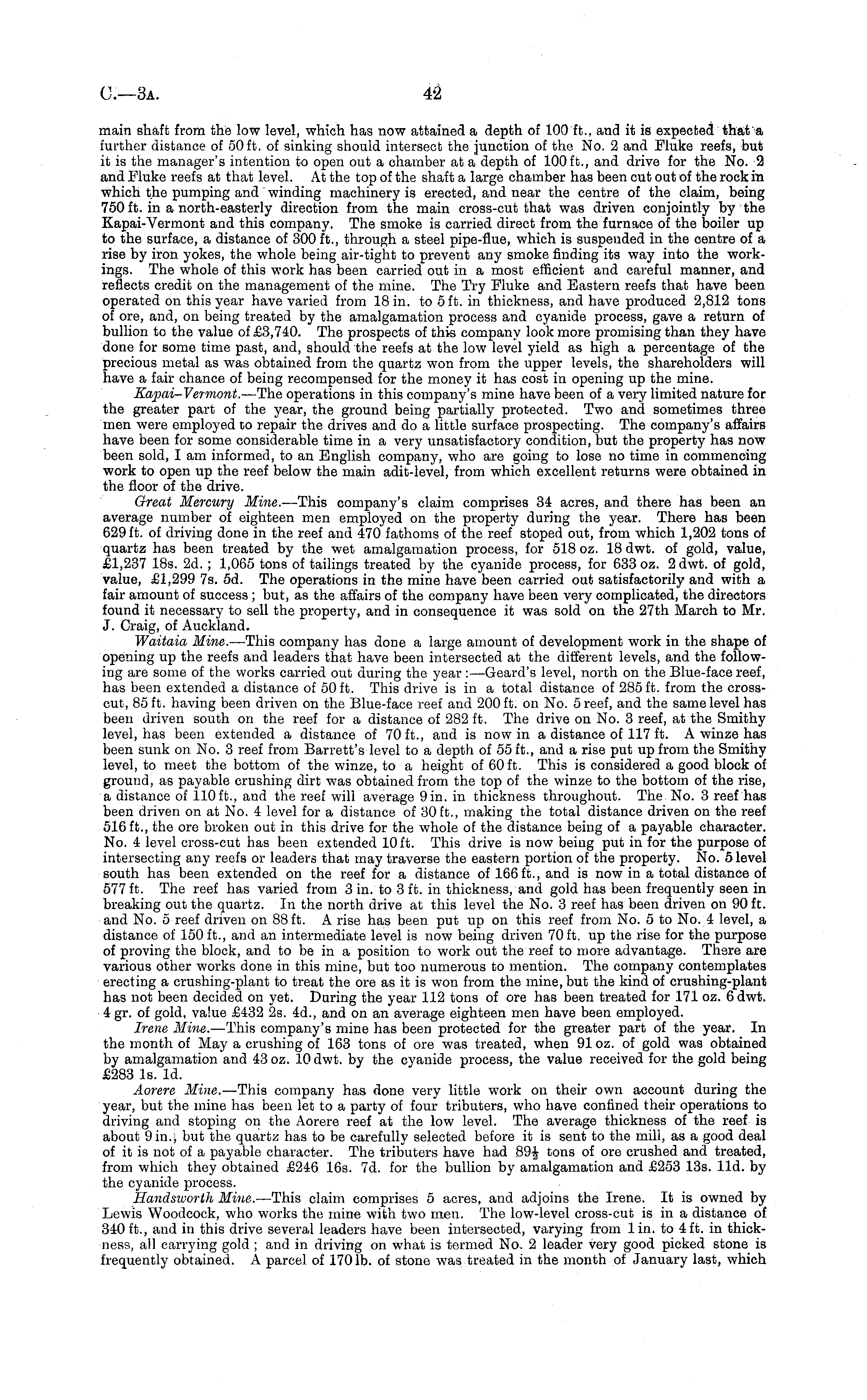 main shaft from the low level, which has now attained a depth of 100 ft., and it is expected thata further distance of 50 ft. of sinking should intersect the junction of the No. 2 and Fluke reefs, but it is the manager's intention to open out a chamber at a depth of 100 ft., and drive for the No. 2 and Fluke reefs at that level. At the top of the shaft a large chamber has been cut out of the rock in which the pumping and winding machinery is erected, and near the centre of the claim, being 750 ft. in a north-easterly direction from the main cross-cut that was driven conjointly by the Kapai-Vermont and this company. The smoke is carried direct from the furnace of the boiler up to the surface, a distance of 300 ft., through a steel pipe-flue, which is suspended in the centre of a rise by iron yokes, the whole being air-tight to prevent any smoke finding its way into the workings. The whole of this work has been carried out in a most efficient and careful manner, and reflects credit on the management of the mine. The Try Fluke and Eastern reefs that have been operated on this year have varied from 18 in. to 5 ft. in thickness, and have produced 2,812 tons of ore, and, on being treated by the amalgamation process and cyanide process, gave a return of bullion to the value of £3,740. The prospects of this company look more promising than they have done for some time past, and, should the reefs at the low level yield as high a percentage of the precious metal as was obtained from the quartz won from the upper levels, the shareholders will have a fair chance of being recompensed for the money it has cost in opening up the mine. Kapai-Vermont.- —The operations in this company's mine have been of a very limited nature for the greater part of the year, the ground being partially protected. Two and sometimes three men were employed to repair the drives and do a little surface prospecting. The company's affairs have been for some considerable time in a very unsatisfactory condition, but the property has now been sold, I am informed, to an English company, who are going to lose no time in commencing work to open up the reef below the main adit-level, from which excellent returns were obtained in the floor of the drive. Great Mercury Mine. —This company's claim comprises 34 acres, and there has been an average number of eighteen men employed on the property during the year. There has been 629 ft. of driving done in the reef and 470 fathoms of the reef stoped out, from which 1,202 tons of quartz has been treated by the wet amalgamation process, for 518 oz. 18 dwt. of gold, value, £1,237 18s. 2d. ; 1,065 tons of tailings treated by the cyanide process, for 633 oz. 2 dwt. of gold, value, £1,299 7s. sd. The operations in the mine have been carried out satisfactorily and with a fair amount of success ; but, as the affairs of the company have been very complicated, the directors found it necessary to sell the property, and in consequence it was sold on the 27th March to Mr. J. Craig, of Auckland. Waitaia Mine. —This company has done a large amount of development work in the shape of opening up the reefs and leaders that have been intersected at the different levels, and the following are some of the works carried out during the year : —Geard's level, north on the Blue-face reef, has been extended a distance of 50 ft. This drive is in a total distance of 285 ft. from the crosscut, 85 ft. having been driven on the Blue-face reef and 200 ft. on No. 5 reef, and the same level has been driven south on the reef for a distance of 282 ft. The drive on No. 3 reef, at the Smithy level, has been extended a distance of 70 ft., and is now in a distance of 117 ft. A winze has been sunk on No. 3 reef from Barrett's level to a depth of 55 ft., and a rise put up from the Smithy level, to meet the bottom of the winze, to a height of 60 ft. This is considered a good block of ground, as payable crushing dirt was obtained from the top of the winze to the bottom of the rise, a distance of 110 ft., and the reef will average 9 in. in thickness throughout. The No. 3 reef has been driven on at No. 4 level for a distance of 30 ft., making the total distance driven on the reef 516 ft., the ore broken out in this drive for the whole of the distance being of a payable character. No. 4 level cross-cut has been extended 10 ft. This drive is now being put in for the purpose of intersecting any reefs or leaders that may traverse the eastern portion of the property. No. 5 level south has been extended on the reef for a distance of 166 ft., and is now in a total distance of 577 ft. The reef has varied from 3 in. to 3 ft. in thickness, and gold has been frequently seen in breaking out the quartz. In the north drive at this level the No. 3 reef has been driven on 90 ft. and No. 5 reef driven on 88 ft. A rise has been put up on this reef from No. sto No. 4 level, a distance of 150 ft., and an intermediate level is now being driven 70 ft. up the rise for the purpose of proving the block, and to be in a position to work out the reef to more advantage. There are various other works done in this mine, but too numerous to mention. The company contemplates erecting a crushing-plant to treat the ore as it is won from the mine, but the kind of crushing-plant has not been decided on yet. During the year 112 tons of ore has been treated for 171 oz. 6 dwt. 4 gr. of gold, value £432 2s. 4d., and on an average eighteen men have been employed. Irene Mine. —This company's mine has been protected for the greater part of the year. In the month of May a crushing of 163 tons of ore was treated, when 91 oz. of gold was obtained by amalgamation and 43 oz. 10 dwt. by the cyanide process, the value received for the gold being £283 Is. Id. Aorere Mine. —This company has done very little work on their own account during the year, but the mine has been let to a party of four tributers, who have confined their operations to driving and stoping on the Aorer