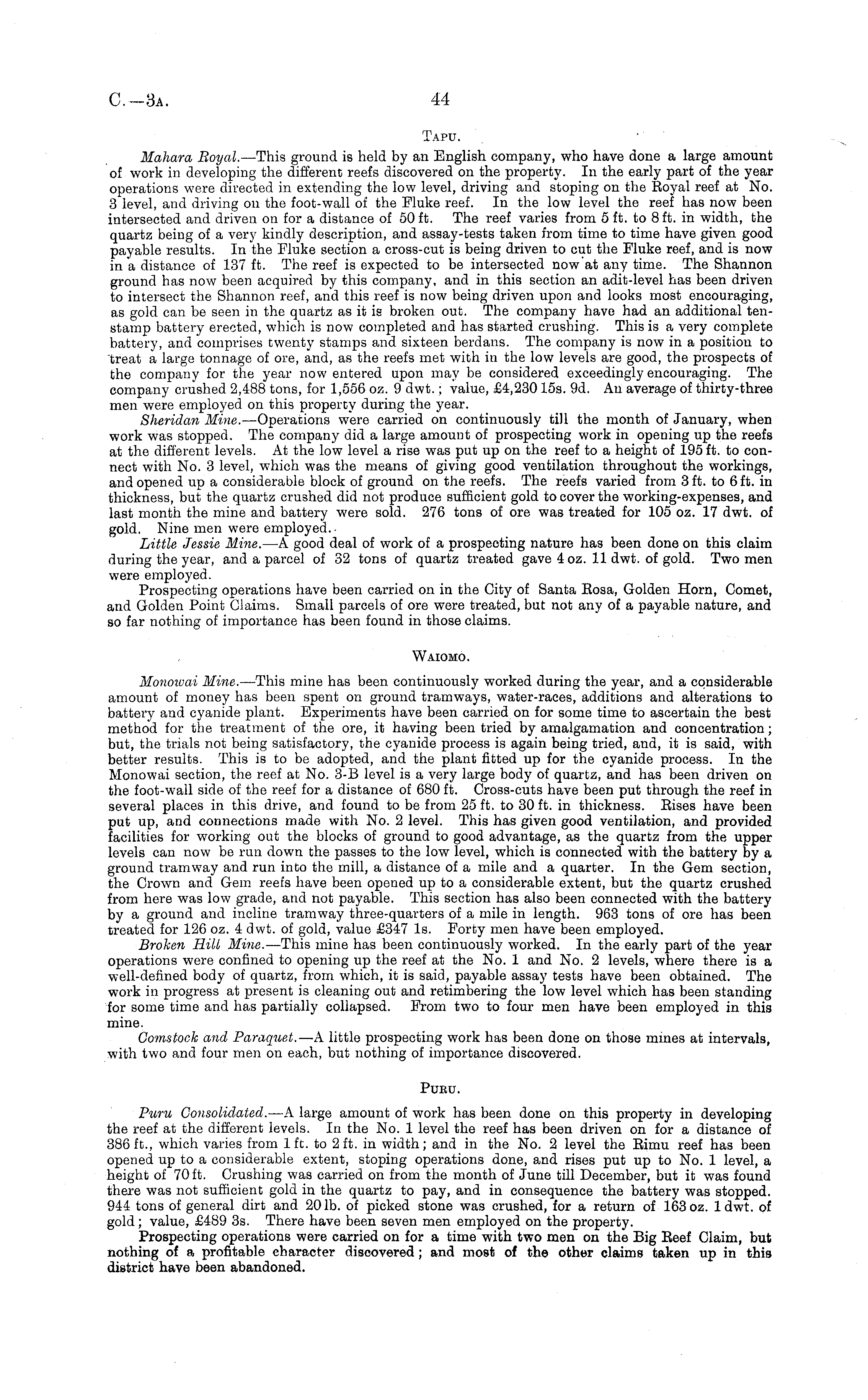 Tapu. Mahara Boyal. —This ground is held by an English company, who have done a large amount of work in developing the different reefs discovered on the property. In the early part of the year operations were directed in extending the low level, driving and stoping on the Eoyal reef at No. 3 level, and driving on the foot-wall of the Fluke reef. In the low level the reef has now been intersected and driven on for a distance of 50 ft. The reef varies from 5 ft. to 8 ft. in width, the quartz being of a very kindly description, and assay-tests taken from time to time have given good payable results. In the Fluke section a cross-cut is being driven to cut the Fluke reef, and is now in a distance of 137 ft. The reef is expected to be intersected now at any time. The Shannon ground has now been acquired by this company, and in this section an adit-level has been driven to intersect the Shannon reef, and this reef is now being driven upon and looks most encouraging, as gold can be seen in the quartz as it is broken out. The company have had an additional tenstamrj battery erected, which is now completed and has started crushing. This is a very complete battery, and comprises twenty stamps and sixteen berdans. The company is now in a position to treat a large tonnage of ore, and, as the reefs met with in the low levels are good, the prospects of the company for the year now entered upon may be considered exceedingly encouraging. The company crushed 2,488 tons, for 1,556 oz. 9 dwt.; value, £4,230 15s. 9d. An average of thirty-three men were employed on this property during the year. Sheridan Mine. —Operations were carried on continuously till the month of January, when work was stopped. The company did a large amount of prospecting work in opening up the reefs at the different levels. At the low level a rise was put up on the reef to a height of 195 ft. to connect with No. 3 level, which was the means of giving good ventilation throughout the workings, and opened up a considerable block of ground on the reefs. The reefs varied from 3 ft. to 6 ft. in thickness, but the quartz crushed did not produce sufficient gold to cover the working-expenses, and last month the mine and battery were sold. 276 tons of ore was treated for 105 oz. 17 dwt. of gold. Nine men were employed.. Little Jessie Mine. —A good deal of work of a prospecting nature has been done on this claim during the year, and a parcel of 32 tons of quartz treated gave 4 oz. 11 dwt. of gold. Two men were employed. Prospecting operations have been carried on in the City of Santa Eosa, Golden Horn, Comet, and Golden Point Claims. Small parcels of ore were treated, but not any of a payable nature, and so far nothing of importance has been found in those claims. Waiomo. Monowai Mine. —This mine has been continuously worked during the year, and a considerable amount of money has been spent on ground tramways, water-races, additions and alterations to battery and cyanide plant. Experiments have been carried on for some time to ascertain the best method for the treatment of the ore, it having been tried by amalgamation and concentration; but, the trials not being satisfactory, the cyanide process is again being tried, and, it is said, with better results. This is to be adopted, and the plant fitted up for the cyanide process. In the Monowai section, the reef at No. 3-B level is a very large body of quartz, and has been driven on the foot-wall side of the reef for a distance of 680 ft. Cross-cuts have been put through the reef in several places in this drive, and found to be from 25 ft. to 30 ft. in thickness. Eises have been put up, and connections made with No. 2 level. This has given good ventilation, and provided facilities for working out the blocks of ground to good advantage, as the quartz from the upper levels can now be run down the passes to the low level, which is connected with the battery by a ground tramway and run into the mill, a distance of a mile and a quarter. In the Gem section, the Crown and Gem reefs have been opened up to a considerable extent, but the quartz crushed from here was low grade, and not payable. This section has also been connected with the battery by a ground and incline tramway three-quarters of a mile in length. 963 tons of ore has been treated for 126 oz. 4 dwt. of gold, value £347 Is. Forty men have been employed. Broken Hill Mine. —This mine has been continuously worked. In the early part of the year operations were confined to opening up the reef at the No. 1 and No. 2 levels, where there is a well-defined body of quartz, from which, it is said, payable assay tests have been obtained. The work in progress at present is cleaning out and retimbering the low level which has been standing for some time and has partially collapsed. From two to four men have been employed in this mine. Gomstock and Paraquet. —A little prospecting work has been done on those mines at intervals, with two and four men on each, but nothing of importance discovered. Pueu. Puru Consolidated. —A large amount of work has been done on this property in developing the reef at the different levels. In the No. 1 level the reef has been driven on for a distance of 386 ft., which varies from lft. to 2ft. in width; and in the No. 2 level the Eimu reef has been opened up to a considerable extent, stoping operations done, and rises put up to No. 1 level, a height of 70 ft. Crushing was carried on from the month of June till December, but it was found there was not sufficient gold in the quartz to pay, and in consequence the battery was stopped. 944 tons of general dirt and 201b. of picked stone was crushed, for a return of 163 oz. ldwt. of gold; value, £489 3s. There have been seven men employed on the property. Prospecting operations were carried on for a time with two men on the Big Eeef Claim, but nothing of a profitable character discovered; and most of the other claims taken up in this district have been abandoned.