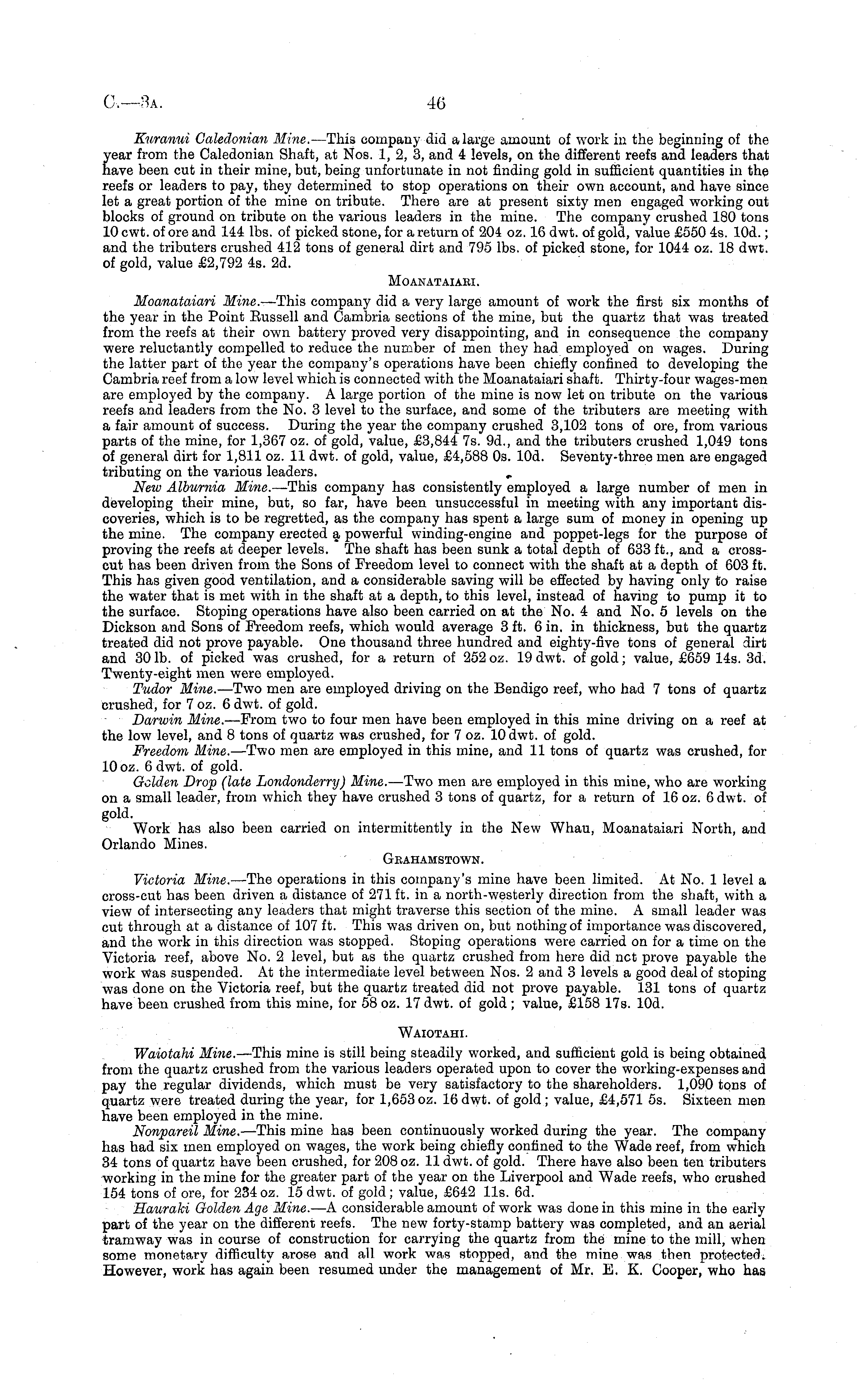 Kuranui Caledonian Mine. —This company did a large amount of work in the beginning of the year from the Caledonian Shaft, at Nos. 1, 2, 3, and 4 levels, on the different reefs and leaders that have been cut in their mine, but, being unfortunate in not finding gold in sufficient quantities in the reefs or leaders to pay, they determined to stop operations on their own account, and have since let a great portion of the mine on tribute. There are at present sixty men engaged working out blocks of ground on tribute on the various leaders in the mine. The company crushed 180 tons 10 ewt. of ore and 144 lbs. of picked stone, for a return of 204 oz. 16 dwt. of gold, value £550 4s. 10d.; and the tributers crushed 412 tons of general dirt and 795 lbs. of picked stone, for 1044 oz. 18 dwt. of gold, value £2,792 4s. 2d. MOANATAIABI. Moanataiari .Mime.—This company did a very large amount of work the first six months of the year in the Point Eussell and Cambria sections of the mine, but the quartz that was treated from the reefs at their own battery proved very disappointing, and in consequence the company were reluctantly compelled to reduce the number of men they had employed on wages. During the latter part of the year the company's operations have been chiefly confined to developing the Cambria reef from a low level which is connected with the Moanataiari shaft. Thirty-four wages-men are employed by the company. A large portion of the mine is now let on tribute on the various reefs and leaders from the No. 3 level to the surface, and some of the tributers are meeting with a fair amount of success. During the year the company crushed 3,102 tons of ore, from various parts of the mine, for 1,367 oz. of gold, value, £3,844 7s. 9d., and the tributers crushed 1,049 tons of general dirt for 1,811 oz. 11 dwt. of gold, value, £4,588 os. 10d. Seventy-three men are engaged tributing on the various leaders. , New Alburnia Mine. —This company has consistently employed a large number of men in developing their mine, but, so far, have been unsuccessful in meeting with any important discoveries, which is to be regretted, as the company has spent a large sum of money in opening up the mine. The company erected a powerful winding-engine and poppet-legs for the purpose of proving the reefs at deeper levels. The shaft has been sunk a total depth of 633 ft., and a crosscut has been driven from the Sons of Freedom level to connect with the shaft at a depth of 603 ft. This has given good ventilation, and a considerable saving will be effected by having only to raise the water that is met with in the shaft at a depth, to this level, instead of having to pump it to the surface. Stoping operations have also been carried on at the No. 4 and No. 5 levels on the Dickson and Sons of Freedom reefs, which would average 3 ft. 6 in. in thickness, but the quartz treated did not prove payable. One thousand three hundred and eighty-five tons of general dirt and 30 lb. of picked was crushed, for a return of 252 oz. 19 dwt. of gold; value, £659 14s. 3d. Twenty-eight men were employed. Tudor Mine. —Two men are employed driving on the Bendigo reef, who had 7 tons of quartz crushed, for 7 oz. 6 dwt. of gold. Darwin Mine. —From two to four men have been employed in this mine driving on a reef at the low level, and 8 tons of quartz was crushed, for 7 oz. 10 dwt. of gold. Freedom Mine. —Two men are employed in this mine, and 11 tons of quartz was crushed, for 10 oz. 6 dwt. of gold. Golden Drop (late Londonderry) Mine. —Two men are employed in this mine, who are working on a small leader, from which they have crushed 3 tons of quartz, for a return of 16 oz. 6 dwt. of gold. Work has also been carried on intermittently in the New Whau, Moanataiari North, and Orlando Mines. Geahamstown. Victoria Mine. —The operations in this company's mine have been limited. At No. 1 level a cross-cut has been driven a distance of 271 ft. in a north-westerly direction from the shaft, with a view of intersecting any leaders that might traverse this section of the mine. A small leader was cut through at a distance of 107 ft. This was driven on, but nothing of importance was discovered, and the work in this direction was stopped. Stoping operations were carried on for a time on the Victoria reef, above No. 2 level, but as the quartz crushed from here did net prove payable the work Was suspended. At the intermediate level between Nos. 2 and 3 levels a good deal of stoping was done on the Victoria reef, but the quartz treated did not prove payable. 131 tons of quartz have been crushed from this mine, for 58 oz. 17 dwt. of gold ; value, £158 17s. 10d. Waiotahi. Waiotahi Mine. —This mine is still being steadily worked, and sufficient gold is being obtained from the quartz crushed from the various leaders operated upon to cover the working-expenses and pay the regular dividends, which must be very satisfactory to the shareholders. 1,090 tons of quartz were treated during the year, for 1,653 oz. 16 dwt. of gold; value, £4,571 ss. Sixteen men have been employed in the mine. Nonpareil Mine.— This mine has been continuously worked during the year. The company has had six men employed on wages, the work being chiefly confined to the Wade reef, from which 34 tons of quartz have been crushed, for 208 oz. 11 dwt. of gold. There have also been ten tributers working in the mine for the greater part of the year on the Liverpool and Wade reefs, who crushed 154 tons of ore, for 234 oz. 15 dwt. of gold; value, £642 11s. 6d. Hauraki Golden Age Mine. —A considerable amount of work was done in this mine in the early part of the year on the different reefs. The new forty-stamp battery was completed, and an aerial tramway was in course of construction for carrying the quartz from the mine to the mill, when some monetary difficulty arose and all work was stopped, and the mine was then protected. However, work has again been resumed under the management of Mr
