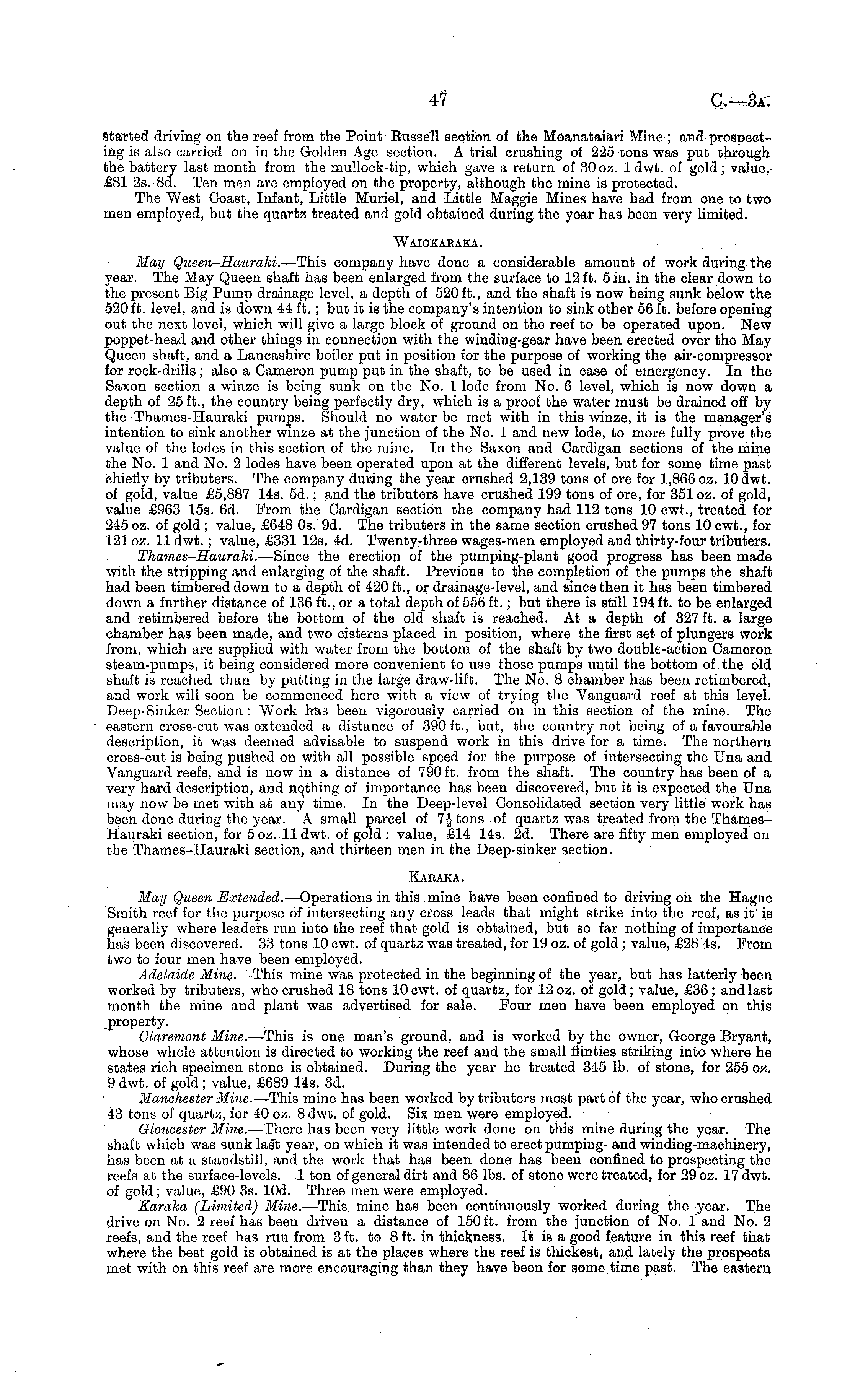 Started driving on the reef from the Point Russell section of the Moanataiari Mine•; and prospecting is also carried on in the Golden Age section. A trial crushing of 2:25 tons was put through the battery last month from the mullock-tip, which gave a return of 30 oz. 1 dwt. of gold; value, £81 2s. Bd. Ten men are employed on the property, although the mine is protected. The West Coast, Infant, Little Muriel, and Little Maggie Mines have had from one to two men employed, but the quartz treated and gold obtained during the year has been very limited. Waiokakaka. May Queen-Hauraki.— -This company have done a considerable amount of work during the year. The May Queen shaft has been enlarged from the surface to 12 ft. 5 in. in the clear down to the present Big Pump drainage level, a depth of 520 ft., and the shaft is now being sunk below the 520 ft. level, and is down 44 ft.; but it is the company's intention to sink other 56 ft. before opening out the next level, which will give a large block of ground on the reef to be operated upon. New poppet-head and other things in connection with the winding-gear have been erected over the May Queen shaft, and a Lancashire boiler put in position for the purpose of working the air-compressor for rock-drills; also a Cameron pump put in the shaft, to be used in case of emergency. In the Saxon section a winze is being sunk on the No. I lode from No. 6 level, which is now down a depth of 25 ft., the country being perfectly dry, which is a proof the water must be drained off by the Thames-Hauraki pumps. Should no water be met with in this winze, it is the manager's intention to sink another winze at the junction of the No. 1 and new lode, to more fully prove the value of the lodes in this section of the mine. In the Saxon and Cardigan sections of the mine the No. 1 and No. 2 lodes have been operated upon at the different levels, but for some time past chiefly by tributers. The company during the year crushed 2,139 tons of ore for 1,866 oz. 10 dwt. of gold, value £5,887 14s. 5d.; and the tributers have crushed 199 tons of ore, for 351 oz. of gold, value £963 15s. 6d. From the Cardigan section the company had 112 tons 10 cwt., treated for 245 oz. of gold; value, £648 os. 9d. The tributers in the same section crushed 97 tons 10 cwt., for 121 oz. 11 dwt.; value, £331 12s. 4d. Twenty-three wages-men employed and thirty-four tributers. Thames-Hauraki.Since the erection of the pumping-plant good progress has been made with the stripping and enlarging of the shaft. Previous to the completion of the pumps the shaft had been timbered down to a depth of 420 ft., or drainage-level, and since then it has been timbered down a further distance of 136 ft., or a total depth of 556 ft.; but there is still 194 ft. to be enlarged and retimbered before the bottom of the old shaft is reached. At a depth of 327 ft. a large chamber has been made, and two cisterns placed in position, where the first set of plungers work from, which are supplied with water from the bottom of the shaft by two double-action Cameron steam-pumps, it being considered more convenient to use those pumps until the bottom of the old shaft is reached than by putting in the large draw-lift. The No. 8 chamber has been retimbered, and work will soon be commenced here with a view of trying the Vanguard reef at this level. Deep-Sinker Section : Work has been vigorously carried on in this section of the mine. The eastern cross-cut was extended a distance of 390 ft., but, the country not being of a favourable description, it was deemed advisable to suspend work in this drive for a time. The northern cross-cut is being pushed on with all possible speed for the purpose of intersecting the Una and Vanguard reefs, and is now in a distance of 790 ft. from the shaft. The country has been of a very hard description, and nothing of importance has been discovered, but it is expected the Una may now be met with at any time. In the Deep-level Consolidated section very little work has been done during the year. A small parcel of 7J tons of quartz was treated from the ThamesHauraki section, for 5 oz. 11 dwt. of gold : value, £14 14s. 2d. There are fifty men employed on the Thames-Hauraki section, and thirteen men in the Deep-sinker section. Kaeaka. May Queen Extended. —Operations in this mine have been confined to driving on the Hague Smith reef for the purpose of intersecting any cross leads that might strike into the reef, as if is generally where leaders run into the reef that gold is obtained, but so far nothing of importance has been discovered. 33 tons 10 cwt. of quartz was treated, for 19 oz. of gold; value, £28 4s. From two to four men have been employed. Adelaide .Miwe.—This mine was protected in the beginning of the year, but has latterly been worked by tributers, who crushed 18 tons 10 cwt. of quartz, for 12 oz. of gold; value, £36; and last month the mine and plant was advertised for sale. Four men have been employed on this property. Claremont Mine. —This is one man's ground, and is worked by the owner, George Bryant, whose whole attention is directed to working the reef and the small flinties striking into where he states rich specimen stone is obtained. During the yeax he treated 345 lb. of stone, for 255 oz. 9 dwt. of gold ; value, £689 14s. 3d. Manchester Mine. —This mine has been worked by tributers most part of the year, who crushed 43 tons of quartz, for 40 oz. 8 dwt. of gold. Six men were employed. Gloucester Mine. —There has been very little work done on this mine during the year. The shaft which was sunk last year, on which it was intended to erect pumping- and winding-machinery, has been at a standstill, and the work that has been done has been confined to prospecting the reefs at the surface-levels. 1 ton of general dirt and 86 lbs. of stone were treated, for 29 oz. 17 dwt. of gold; value, £90 3s. 10d. Three men were employed. ■ Karaka (Limited) Mine. —This mine has been contin
