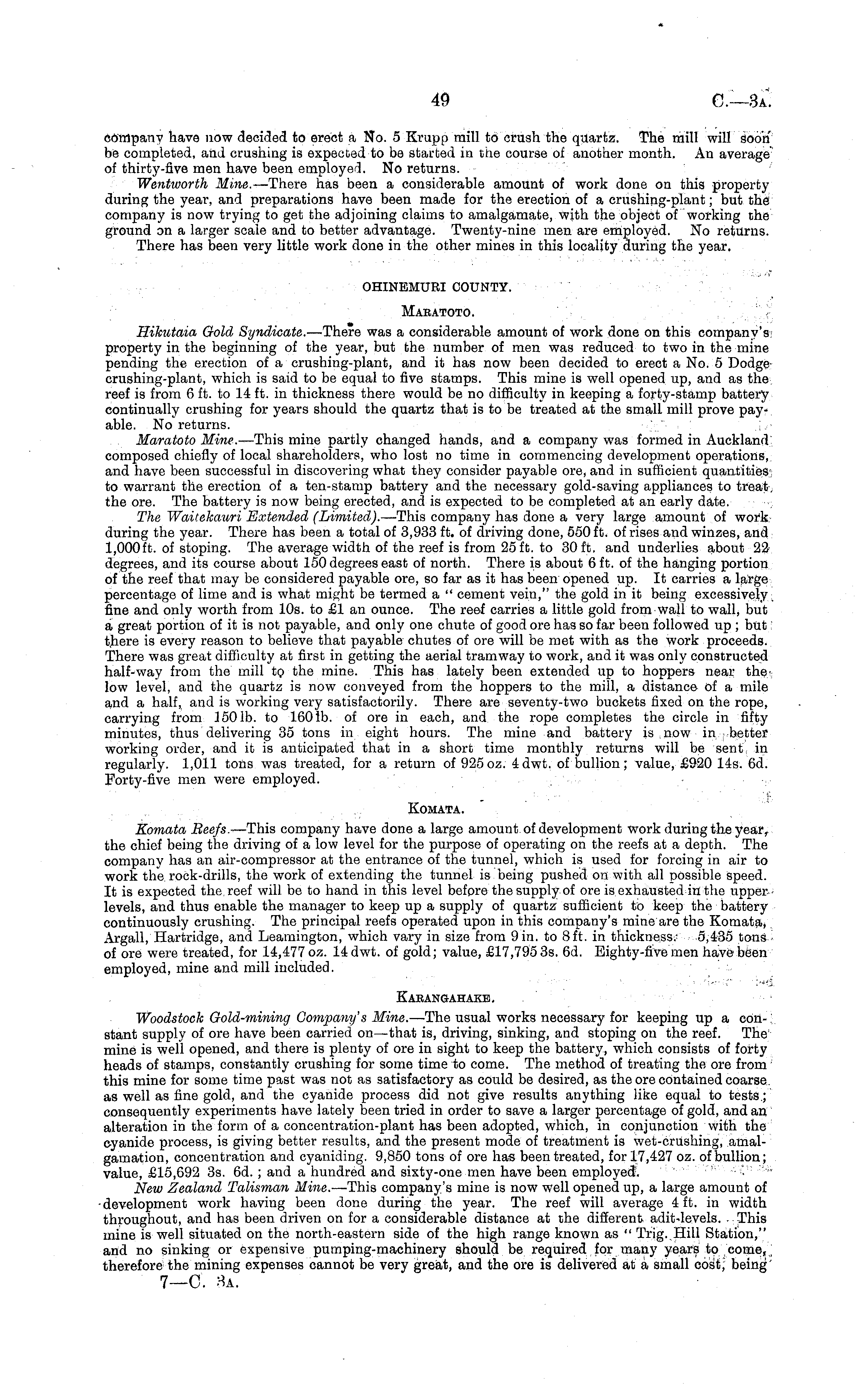 company have now decided to erect a No. 5 Krupp mill to crush the quartz. The mill will Soon be completed, and crushing is expected to be started ia the couree of another month. An average of thirty-five men have been employed. No returns. Wentworth Mine. —There has been a considerable amount of work done on this property during the year, and preparations have been made for the erection of a crushing-plant; but the company is now trying to get the adjoining claims to amalgamate, with the object of working the ground on a larger scale and to better advantage. Twenty-nine men are employed. No returns. There has been very little work done in the other mines in this locality during the year. OHINEMURI COUNTY. Maeatoto. r Hikutaia Gold Syndicate. —There was a considerable amount of work done on this company's: property in the beginning of the year, but the number of men was reduced to two in the mine pending the erection of a crushing-plant, and it has now been decided to erect a No. 5 Dodge crushing-plant, which is said to be equal to five stamps. This mine is well opened up, and as the, reef is from 6 ft. to 14 ft. in thickness there would be no difficulty in keeping a forty-stamp battery continually crushing for years should the quartz that is to be treated at the small mill prove payable. No returns. .;,•■■ Maratoto Mine. —This mine partly changed hands, and a company was formed in Auckland composed chiefly of local shareholders, who lost no time in commencing development operations, and have been successful in discovering what they consider payable ore, and in sufficient quantities; to warrant the erection of a ten-stamp battery and the necessary gold-saving appliances to treat, the ore. The battery is now being erected, and is expected to be completed at an early date. The Waitekauri Extended (Limited). —-This company has done a very large amount of work during the year. There has been a total of 3,933 ft. of driving done, 550 ft. of rises and winzes, and I,oooft. of stoping. The average width of the reef is from 25 ft. to 30 ft. and underlies about 22 degrees, and its course about 150 degrees east of north. There is about 6 ft. of the hanging portion of the reef that may be considered payable ore, so far as it has been opened up. It carries a large percentage of lime and is what might be termed a " cement vein," the gold in it being excessively fine and only worth from 10s. to £1 an ounce. The reef carries a little gold from wall to wall, but a. great portion of it is not payable, and only one chute of good ore has so far been followed up ; but i there is every reason to believe that payable chutes of ore will be met with as the work proceeds. There was great difficulty at first in getting the aerial tramway to work, and it was only constructed half-way from the mill t<? the mine. This has lately been extended up to hoppers near the> low level, and the quartz is now conveyed from the hoppers to the mill, a distance of a mile and a half, and is working very satisfactorily. There are seventy-two buckets fixed on the rope, carrying from 1501b. to 1601b. of ore in each, and the rope completes the circle in fifty minutes, thus delivering 35 tons in eight hours. The mine and battery is now in ; better working order, and it is anticipated that in a short time monthly returns will be sent in regularly. 1,011 tons was treated, for a return of 925 oz. 4dwt. of bullion; value, £920 14s. 6d. Forty-five men were employed. . -.-,.■ f KOMATA. Komata Beefs. —This company have done a large amount of development work during the year, the chief being the driving of a low level for the purpose of operating on the reefs at a depth. The company has an air-compressor at the entrance of the tunnel, which is used for forcing in air to work the. rock-drills, the work of extending the tunnel is being pushed on with all possible speed. It is expected the. reef will be to hand in this level before the supply of ore is exhausted in the upper levels, and thus enable the manager to keep up a supply of quartz sufficient to keep the battery continuously crushing. The principal reefs operated upon in this company's mine are the Komata, Argall, Hartridge, and Leamington, which vary in size from 9 in. to 8 ft. in thickness.: 5,435 tons of ore were treated, for 14,477 oz. 14dwt. of gold; value, £17,795 3s. 6d. Eighty-five men have been employed, mine and mill included. Kaeangahake. Woodstock Gold-mining Company's Mine. —The usual works necessary for keeping up a con- 1 stant supply of ore have been carried on—that is, driving, sinking, and stoping on the reef. The : mine is well opened, and there is plenty of ore in sight to keep the battery, which consists of forty heads of stamps, constantly crushing for some time to come. The method of treating the ore from this mine for some time past was not as satisfactory as could be desired, as the ore contained coarse, as well as fine gold, and the cyanide process did not give results anything like equal to tests,; consequently experiments have lately been tried in order to save a larger percentage of gold, and an alteration in the form of a concentration-plant has been adopted, which, in conjunction with the cyanide process, is giving better results, and the present mode of treatment is wet-crushing, amalgamation, concentration and cyaniding. 9,850 tons of ore has been treated, for 17,427 oz. of bullion; value, £15,692 3s. 6d. ; and a hundred and sixty-one men have been employed. ■""' - *. ■ '■■ New Zealand Talisman Mine.— This company's mine is now well opened up, a large amount of development work having been done during the year. The reef will average 4 ft. in width throughout, and has been driven on for a considerable distance at the different This mine is well situated on the north-eastern side of the high range known as " Trig..Hill Station," and no sinking or expensive pumping-machinery should be required for many years to come, therefor