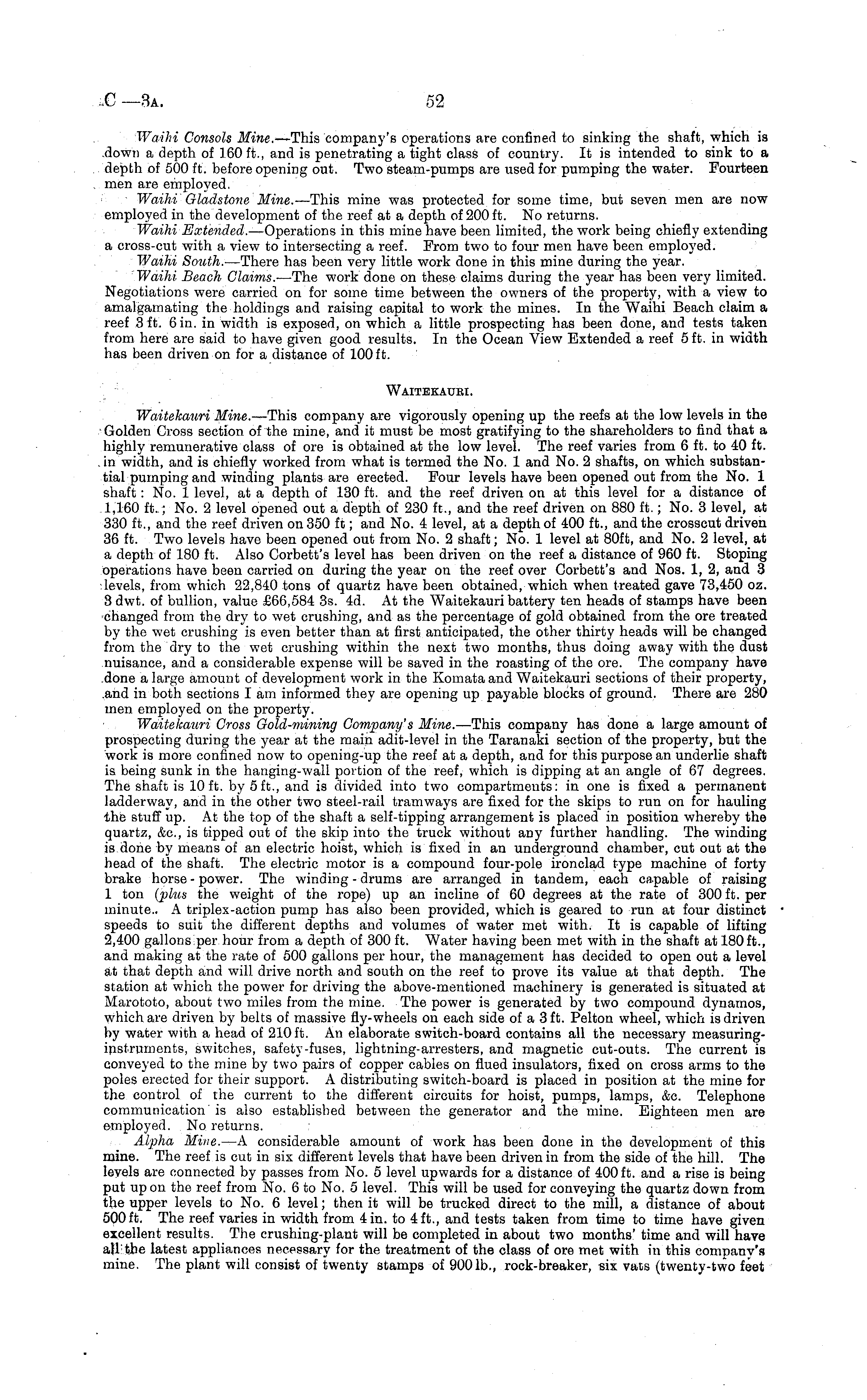Waihi Consols Mine. —This company's operations are confined to sinking the shaft, which is .down a depth of 160 ft., and is penetrating a tight class of country. It is intended to sink to a depth of 500 ft. before opening out. Two steam-pumps are used for pumping the water. Fourteen men are employed. Waihi Gladstone Mine. —-This mine was protected for some time, but seven men are now employed in the development of the reef at a depth of 200 ft. No returns. Waihi Extended.— Operations in this mine have been limited, the work being chiefly extending a cross-cut with a view to intersecting a reef. Prom two to four men have been employed. Waihi South.- —There has been very little work done in this mine during the year. Waihi Beach Claims. —The work done on these claims during the year has been very limited. Negotiations were carried on for some time between the owners of the property, with a view to amalgamating the holdings and raising capital to work the mines. In the Waihi Beach claim a reef 3 ft. 6 in. in width is exposed, on which a little prospecting has been done, and tests taken from here are said to have given good results. In the Ocean View Extended a reef 5 ft. in width has been driven on for a distance of 100 ft. Waitekaubi. ■ ■ . .■ . Waitekauri Mine. —This company are vigorously opening up the reefs at the low levels in the Golden Cross section of the mine, and it must be most gratifying to the shareholders to find that a highly remunerative class of ore is obtained at the low level. The reef varies from 6 ft. to 40 ft. in width, and is chiefly worked from what is termed the No. 1 and No. 2 shafts, on which substantial pumping and winding plants are erected. Four levels have been opened out from the No. 1 shaft: No. 1 level, at a depth of 130 ft. and the reef driven on at this level for a distance of 1,160 ft.; No. 2 level opened out a depth of 230 ft., and the reef driven on 880 ft.; No. 3 level, at 330 ft., and the reef driven on 350 ft; and No. 4 level, at a depth of 400 ft., and the crosscut driven 36 ft. Two levels have been opened out from No. 2 shaft; No. 1 level at 80ft, and No. 2 level, at a depth of 180 ft. Also Corbett's level has been driven on the reef a distance of 960 ft. Stoping operations have been carried on during the year on the reef over Corbett's and Nos. 1, 2, and 3 : levels, from which 22,840 tons of quartz have been obtained, which when treated gave 73,450 oz. 8 dwt. of bullion, value £66,584 3s. 4d. At the Waitekauri battery ten heads of stamps have been changed from the dry to wet crushing, and as the percentage of gold obtained from the ore treated by the wet crushing is even better than at first anticipated, the other thirty heads will be changed from the dry to the wet crushing within the next two months, thus doing away with the dust nuisance, and a considerable expense will be saved in the roasting of the ore. The company have done a large amount of development work in the Komata and Waitekauri sections of their property, .and in both sections lam informed they are opening up payable blocks of ground. There are 280 men employed on the property. Waitekauri Gross Gold-mining Company' s Mine. —This company has done a large amount of prospecting during the year at the main adit-level in the Taranaki section of the property, but the work is more confined now to opening-up the reef at a depth, and for this purpose an underlie shaft is being sunk in the hanging-wall portion of the reef, which is dipping at an angle of 67 degrees. The shaft is 10 ft. by sft., and is divided into two compartments: in one is fixed a permanent ladderway, and in the other two steel-rail tramways are fixed for the skips to run on for hauling the stuff up. At the top of the shaft a self-tipping arrangement is placed in position whereby the quartz, &c, is tipped out of the skip into the truck without any further handling. The winding is doiie by means of an electric hoist, which is fixed in an underground chamber, cut out at the head of the shaft. The electric motor is a compound four-pole ironclad type machine of forty brake horse - power. The winding - drums are arranged in tandem, each capable of raising 1 ton (plus the weight of the rope) up an incline of 60 degrees at the rate of 300 ft. per minute.. A triplex-action pump has also been provided, which is geared to run at four distinct speeds to suit the different depths and volumes of water met with. It is capable of lifting 2,400 gallons per hour from a depth of 300 ft. Water having been met with in the shaft at 180 ft., and making at the rate of 500 gallons per hour, the management has decided to open out a level at that depth and will drive north and south on the reef to prove its value at that depth. The station at which the power for driving the above-mentioned machinery is generated is situated at Marototo, about two miles from the mine. The power is generated by two compound dynamos, which are driven by belts of massive fly-wheels on each side of a 3 ft. Pelton wheel, which is driven by water with a head of 210 ft. An elaborate switch-board contains all the necessary measuringinstruments, switches, safety-fuses, lightning-arresters, and magnetic cut-outs. The current is conveyed to the mine by two pairs of copper cables on flued insulators, fixed on cross arms to the poles erected for their support. A distributing switch-board is placed in position at the mine for the control of the current to the different circuits for hoist, pumps, lamps, &c. Telephone communication' is also established between the generator and the mine. Eighteen men are employed. No returns. Alpha Mine. —A considerable amount of work has been done in the development of this mine. The reef is cut in six different levels that have been driven in from the side of the hill. The levels are connected by passes from No. 5 level upwards for a distance of 400 ft. and a rise is being put up on the reef from No. 6to No. 5 level. This