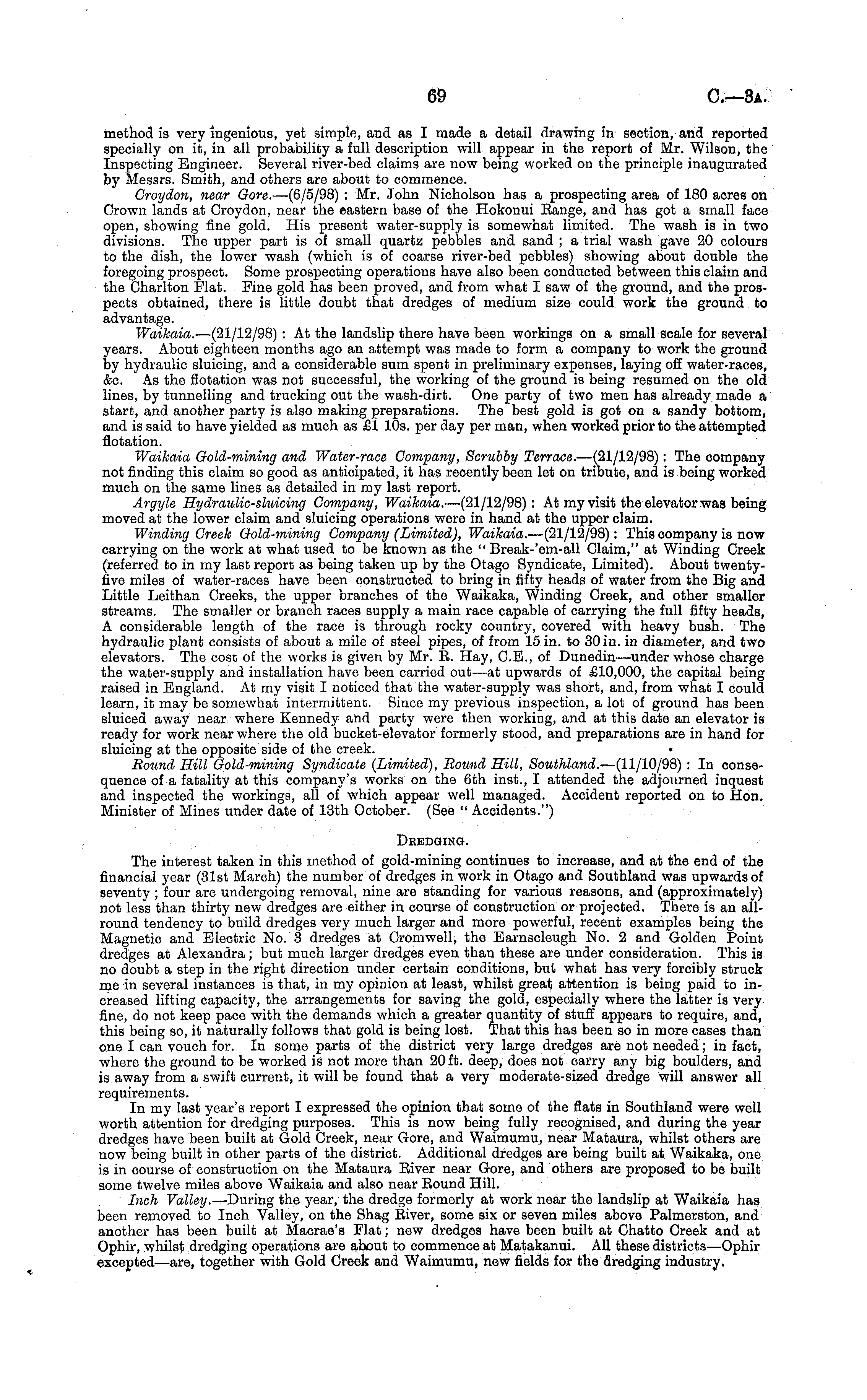 method is very ingenious, yet simple, and as I made a detail drawing in section, and reported specially on it, in all probability a full description will appear in the report of Mr. Wilson, the Inspecting Engineer. Several river-bed claims are now being worked on the principle inaugurated by Messrs. Smith, and others are about to commence. Croydon, near Gore. —(6/5/98) : Mr. John Nicholson has a prospecting area of 180 acres on Crown lands at Croydon, near the eastern base of the Hokonui Eange, and has got a small face open, showing fine gold. His present water-supply is somewhat limited. The wash is in two divisions. The upper part is of small quartz pebbles and sand ; a trial wash gave 20 colours to the dish, the lower wash (which is of coarse river-bed pebbles) showing about double the foregoing prospect. Some prospecting operations have also been conducted between this claim and the Charlton Flat. Fine gold has been proved, and from what I saw of the ground, and the prospects obtained, there is little doubt that dredges of medium size could work the ground to advantage. Waikaia. —(2l/12/98) : At the landslip there have been workings on a small scale for several years. About eighteen months ago an attempt was made to form a company to work the ground by hydraulic sluicing, and a considerable sum spent in preliminary expenses, laying off water-races, &c. As the flotation was not successful, the working of the ground is being resumed on the old lines, by tunnelling and trucking out the wash-dirt. One party of two men has already made a start, and another party is also making preparations. The best gold is got on a sandy bottom, and is said to have yielded as much as £1 10s. per day per man, when worked prior to the attempted flotation. Waikaia Gold-mining and Water-race Company, Scrubby Terrace. —(2l/12/98): The company not finding this claim so good as anticipated, it has recently been let on tribute, and is being worked much on the same lines as detailed in my last report. Argyle Hydraulic-sluicing Company, Waikaia. —(2l/12/98): At my visit the elevator was being moved at the lower claim and sluicing operations were in hand at the upper claim. Winding Creek Gold-mining Company (Limited), Waikaia. —(2l/12/98): This company is now carrying on the work at what used to be known as the " Break-em-all Claim," at Winding Creek (referred to in my last report as being taken up by the Otago Syndicate, Limited). About twentyfive miles of water-races have been constructed to bring in fifty heads of water from the Big and Little Leithan Creeks, the upper branches of the Waikaka, Winding Creek, and other smaller streams. The smaller or branch races supply a main race capable of carrying the full fifty heads, A considerable length of the race is through rocky country, covered with heavy bush. The hydraulic plant consists of about a mile of steel pipes, of from 15 in. to 30 in. in diameter, and two elevators. The cost of the works is given by Mr. E. Hay, C.8., of Dunedin—under whose charge the water-supply and installation have been carried out —at upwards of £10,000, the capital being raised in England. At my visit I noticed that the water-supply was short, and, from what I could learn, it may be somewhat intermittent. Since my previous inspection, a lot of ground has been sluiced away near where Kennedy and party were then working, and at this date an elevator is ready for work near where the old bucket-elevator formerly stood, and preparations are in hand for sluicing at the opposite side of the creek. Bound Hill Gold-mining Syndicate (Limited), Bound Hill, Southland. —(ll/10/98) : In consequence of a fatality at this company's works on the 6th inst., I attended the adjourned inquest and inspected the workings, all of which appear well managed. Accident reported on to Hon. Minister of Mines under date of 13th October. (See " Accidents.") Dbedging. The interest taken in this method of gold-mining continues to increase, and at the end of the financial year (31st March) the number of dredges in work in Otago and Southland was upwards of seventy ; four are undergoing removal, nine are standing for various reasons, and (approximately) not less than thirty new dredges are either in course of construction or projected. There is an allround tendency to build dredges very much larger and more powerful, recent examples being the Magnetic and Electric No. 3 dredges at Cromwell, the Earnscleugh No. 2 and Golden Point dredges at Alexandra ; but much larger dredges even than these are under consideration. This is no doubt a step in the right direction under certain conditions, but what has very forcibly struck me in several instances is that, in my opinion at least, whilst great attention is being paid to increased lifting capacity, the arrangements for saving the gold, especially where the latter is very fine, do not keep pace with the demands which a greater quantity of stuff appears to require, and, this being so, it naturally follows that gold is being lost. That this has been so in more cases than one I can vouch for. In some parts of the district very large dredges are not needed; in fact, where the ground to be worked is not more than 20 ft. deep, does not carry any big boulders, and is away from a swift current, it will be found that a very moderate-sized dredge will answer all requirements. In my last year's report I expressed the opinion that some of the flats in Southland were well worth attention for dredging purposes. This is now being fully recognised, and during the year dredges have been built at Gold Creek, near Gore, and Waimumu, near Mataura, whilst others are now being built in other parts of the district. Additional dredges are being built at Waikaka, one is in course of construction on the Mataura Eiver near Gore, and others are proposed to be built some twelve miles above Waikaia and also near Bound Hill. Inch Valley. —During the year, the dredge formerly at work near 