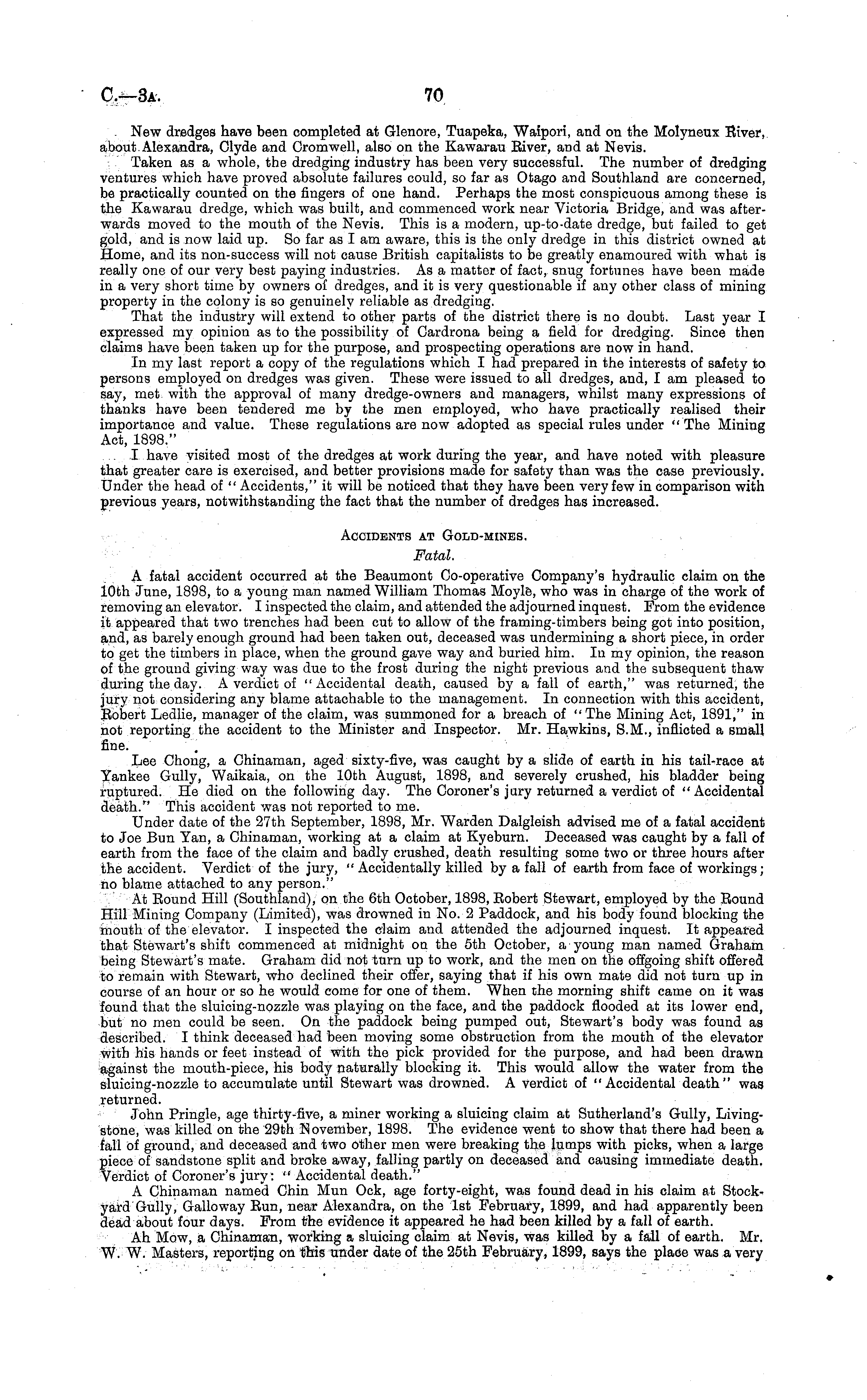 . New dredges have been completed at Glenore, Tuapeka, Waipori, and on the Molyneux River, about.Alexandra, Clyde and Cromwell, also on the Kawarau River, and at Nevis. Taken as a whole, the dredging industry has been very successful. The number of dredging ventures which have proved absolute failures could, so far as Otago and Southland are concerned, be practically counted on the fingers of one hand. Perhaps the most conspicuous among these is the Kawarau dredge, which was built, and commenced work near Victoria Bridge, and was afterwards moved to the mouth of the Nevis. This is a modern, up-to-date dredge, but failed to get gold, and is now laid up. So far as lam aware, this is the only dredge in this district owned at Home, and its non-success will not cause British capitalists to be greatly enamoured with what is really one of our very best paying industries. As a matter of fact, snug fortunes have been made in a very short time by owners of dredges, and it is very questionable if any other class of mining property in the colony is so genuinely reliable as dredging. That the industry will extend to other parts of the district there is no doubt. Last year I expressed my opinion as to the possibility of Cardrona being a field for dredging. Since then claims have been taken up for the purpose, and prospecting operations are now in hand. In my last report a copy of the regulations which I had prepared in the interests of safety to persons employed on dredges was given. These were issued to all dredges, and, lam pleased to say, met with the approval of many dredge-owners and managers, whilst many expressions of thanks have been tendered me by the men employed, who have practically realised their importance and value. These regulations are now adopted as special rules under " The Mining Act, 1898." ..-.-, I have visited most of the dredges at work during the year, and have noted with pleasure that greater care is exercised, and better provisions made for safety than was the case previously. Under the head of " Accidents," it will be noticed that they have been very few in comparison with previous years, notwithstanding the fact that the number of dredges has increased. Accidents at Gold-mines. Fatal. A fatal accident occurred at the Beaumont Co-operative Company's hydraulic claim on the 10th June, 1898, to a young man named William Thomas Moyle, who was in charge of the work of removing an elevator. I inspected the claim, and attended the adjourned inquest. From the evidence it appeared that two trenches had been cut to allow of the framing-timbers being got into position, and, as barely enough ground had been taken out, deceased was undermining a short piece, in order to get the timbers in place, when the ground gave way and buried him. Iα my opinion, the reason of the ground giving way was due to the frost during the night previous and the subsequent thaw during the day. A verdict of "Accidental death, caused by a fall of earth," was returned, the jury not considering any blame attachable to the management. In connection with this accident, Robert Ledlie, manager of the claim, was summoned for a breach of "The Mining Act, 1891," in not reporting the accident to the Minister and Inspector. Mr. Hawkins, S.M., inflicted a small fine. Lee Chong, a Chinaman, aged sixty-five, was caught by a slide of earth in his tail-race at Yankee Gully, Waikaia, on the 10th August, 1898, and severely crushed, his bladder being ruptured. He died on the following day. The Coroner's jury returned a verdict of "Accidental death." This accident was not reported to me. Under date of the 27th September, 1898, Mr. Warden Dalgleish advised me of a fatal accident to Joe Bun Van, a Chinaman, working at a claim at Kyeburn. Deceased was caught by a fall of earth from the face of the claim and badly crushed, death resulting some two or three hours after the accident. Verdict of the jury, "Accidentally killed by a fall of earth from face of workings; no blame attached to any person." At Round Hill (Southland), on the 6th October, 1898, Robert Stewart, employed by the Round Hill Mining Company (Limited), was drowned in No. 2 Paddock, and his body found blocking the mouth of the elevator. I inspected the claim and attended the adjourned inquest. It appeared that Stewart's shift commenced at midnight on the sth October, a young man named Graham being Stewart's mate. Graham did not turn up to work, and the men on the offgoing shift offered to remain with Stewart, who declined their offer, saying that if his own mate did not turn up in course of an hour or so he would come for one of them. When the morning shift came on it was found that the sluicing-nozzle was playing on the face, and the paddock flooded at its lower end, but no men could be seen. On the paddock being pumped out, Stewart's body was found as described. I think deceased had been moving some obstruction from the mouth of the elevator with his hands or feet instead of with the pick provided for the purpose, and had been drawn against the mouth-piece, his body naturally blocking it. This would allow the water from the sluicing-nozzle to accumulate until Stewart was drowned. A verdict of "Accidental death" was returned. John Pringle, age thirty-five, a miner working a sluicing claim at Sutherland's Gully, Livingstone, was killed on the 29th November, 1898. The evidence went to show that there had been a fall of ground, and deceased and two other men were breaking the lumps with picks, when a large piece of sandstone split and broke away, falling partly on deceased and causing immediate death. Verdict of Coroner's jury: " Accidental death." A Chinaman named Chin Mun Ock, age forty-eight, was found dead in his claim at Stockyard Gully, Galloway Run, near Alexandra, on the Ist February, 1899, and had apparently been dead about four days. From the evidence it appeared he had been killed by a fall of earth. Ah Mow, a Chinaman, working a sluicing claim at Nevis, was ki