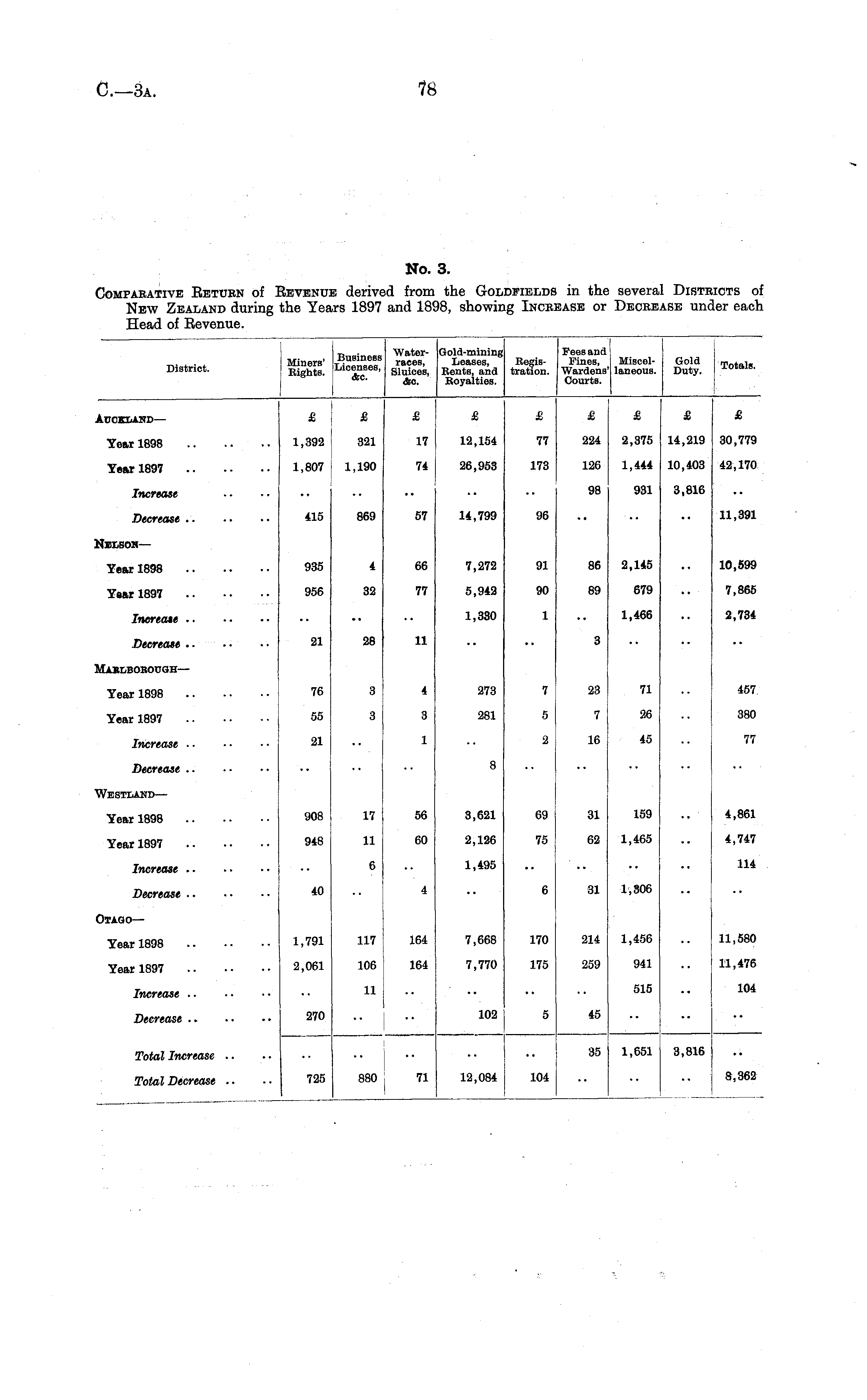 No. 3. Comparative Return of Revenue derived from the Goldfields in the several Districts of New Zealand during the Years 1897 and 1898, showing Increase or Decrease under each Head of Revenue.