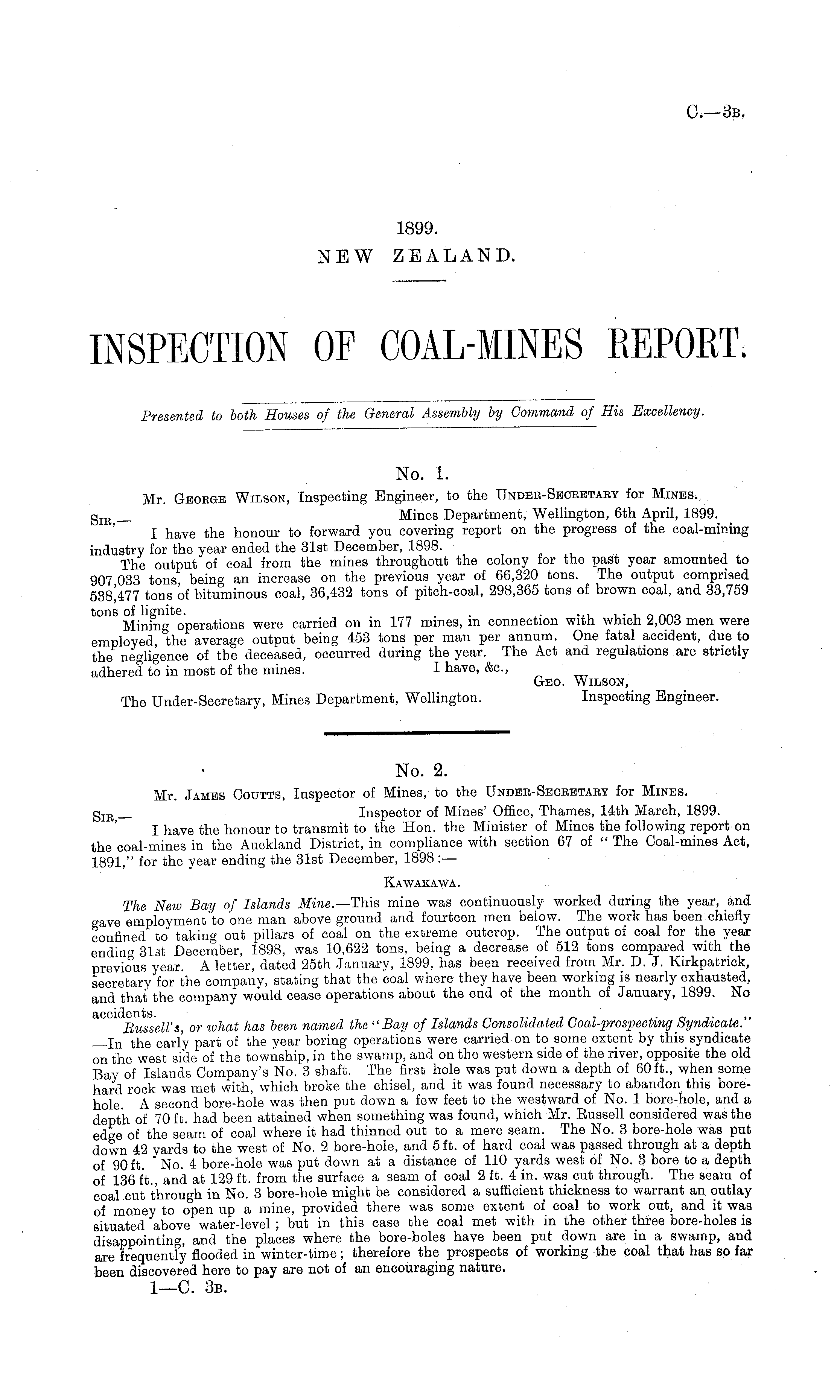 No. 2. Mr. James Ooutts, Inspector of Mines, to the Under- Secretary for Mines. g IR Inspector of Mines' Office, Thames, 14th March, 1899. I have the honour to transmit to the Hon. the Minister of Mines the following report on the coal-mines in the Auckland District, in compliance with section 67 of " The Coal-mines Act, 1891," for the year ending the 31st December, 1898 :— Kawakawa. The Nezu Bay of Islands Mine. —This mine was continuously worked during the year, and gave employment to one man above ground and fourteen men below. The work has been chiefly confined to taking out pillars of coal on the extreme outcrop. The output of coal for the year endin" 31st December, 1898, was 10,622 tons, being a decrease of 512 tons compared with the previous year. A letter, dated 25th January, 1899, has been received from Mr. D. J. Kirkpatrick, secretary for the company, stating that the coal where they have been working is nearly exhausted, and that the company would cease operations about the end of the month of January, 1899. No Russell's, or what has been named the "Bay of Islands Consolidated Goal-prospecting Syndicate." j n t he early part of the year boring operations were carried on to some extent by this syndicate on the west side of the township, in the swamp, and on the western side of the river, opposite the old Bay of Islands Company's No. 3 shaft. The first hole was put down a depth of 60 ft., when some hard rock was met which broke the chisel, and it was found necessary to abandon this borehole. A second bore-hole was then put down a few feet to the westward of No. 1 bore-hole, and a depth of 70 ft. had been attained when something was found, which Mr. Eussell considered was the edge of the seam of coal where it had thinned out to a mere seam. The No. 3 bore-hole was put down 42 yards to the west of No. 2 bore-hole, and 5 ft. of hard coal was passed through at a depth of 90 ft. " No. 4 bore-hole was put down at a distance of 110 yards west of No. 3 bore to a depth of 136 ft., and at 129 ft. from the surface a seam of coal 2 ft. 4 in. was cut through. The seam of coal cut through in No. 3 bore-hole might be considered a sufficient thickness to warrant an outlay of money to open up a mine, provided there was some extent of coal to work out, and it was situated above water-level ; but in this case the coal met with in the other three bore-holes is disappointing, and the places where the bore-holes have been put down are in a swamp, and are frequently flooded in winter-time; therefore the prospects of working the coal that has so far been discovered here to pay are not of an encouraging nature.