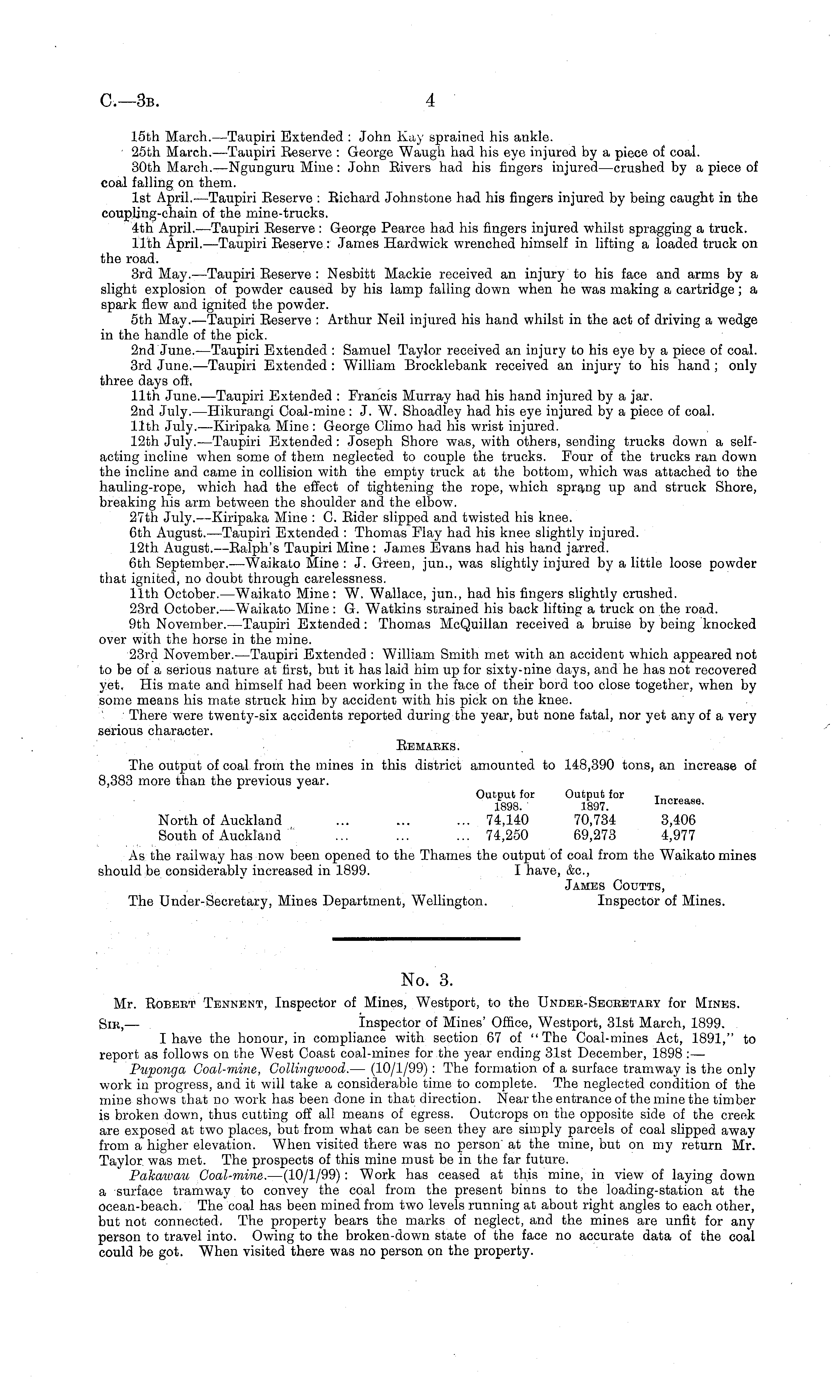 No. 3. Mr. Eobbet Tennent, Inspector of Mines, Westport, to the Under-Secretary for Mikes. Sir, — Inspector of Mines' Office, Westport, 31st March, 1899. I have the honour, in compliance with section 67 of "The Coal-mines Act, 1891," to report as follows on the West Coast coal-mines for the year ending 31st December, 1898 : — Puponga Coal-mine, Golli'iigwood. — (10/1/99) : The formation of a surface tramway is the only work in progress, and it will take a considerable time to complete. The neglected condition of the mine shows that no work has been done in that direction. Near the entrance of the mine the timber is broken down, thus cutting off all means of egress. Outcrops on the opposite side of the creek are exposed at two places, but from what can be seen they are simply parcels of coal slipped away from a higher elevation. When visited there was no person at the mine, but on my return Mr. Taylor was met. The prospects of this mine must be in the far future. Paka/ivau Goal-mine. —(10/1/99) : Work has ceased at this mine, in view of laying down a surface tramway to convey the coal from the present binns to the loading-station at the ocean-beach. The coal has been mined from two levels running at about right angles to each other, but not connected. The property bears the marks of neglect, and the mines are unfit for any person to travel into. Owing to the broken-down state of the face no accurate data of the coal could be got. When visited there was no person on the property.