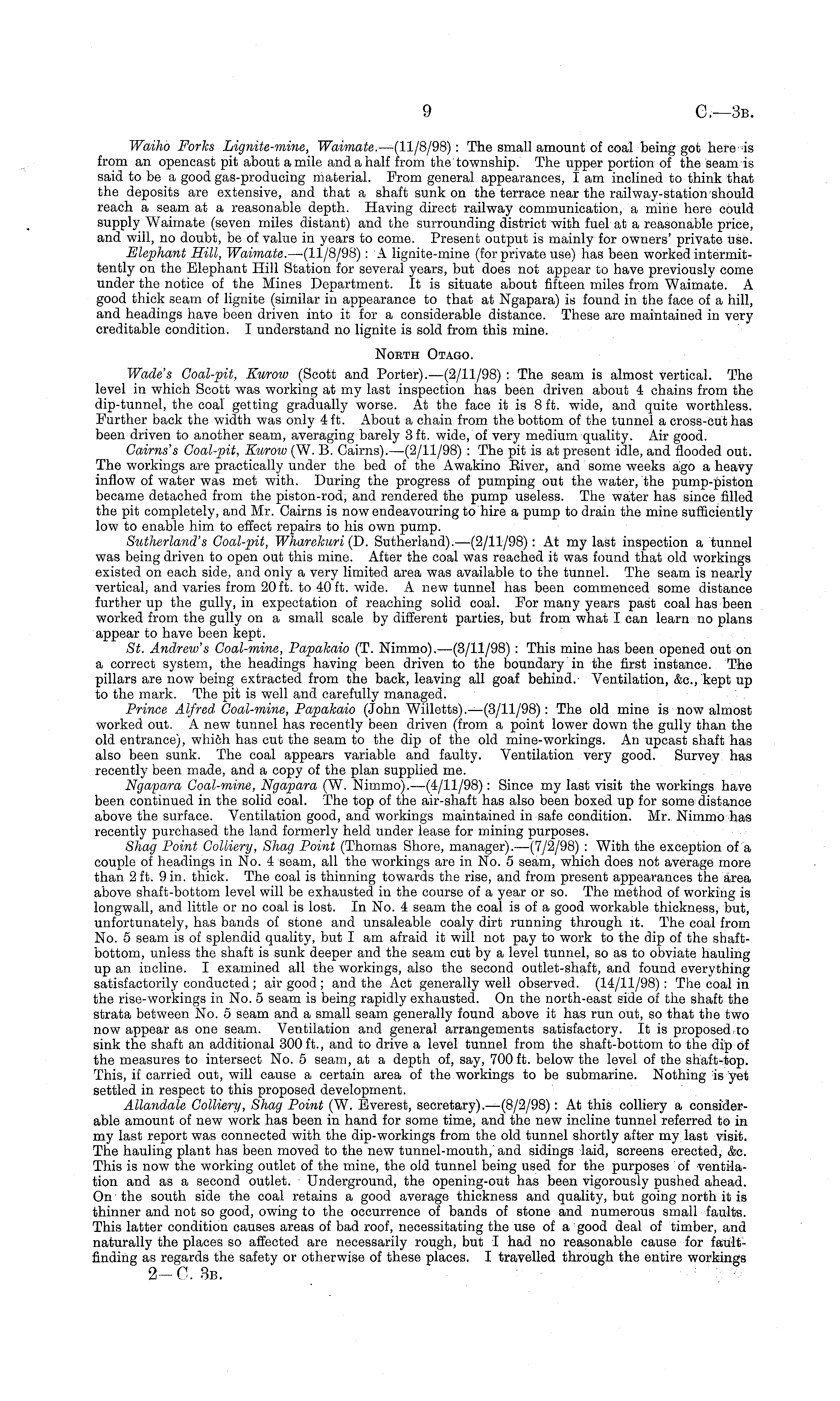 Waiho Forks Lignite-mine, Waimate. —(ll/8/98): The small amount of coal being got hefeis from an opencast pit about a mile and a half from the township. The upper portion of the seam is said to be a good gas-producing material. From general appearances, lam inclined to think that the deposits are extensive, and that a shaft sunk on the terrace near the railway-station should reach a seam at a reasonable depth. Having direct railway communication, a mine here could supply Waimate (seven miles distant) and the surrounding district with fuel at a reasonable price, and will, no doubt, be of value in years to come. Present output is mainly for owners' private use. Elephant Hill, Waimate. —-(11/8/98): A lignite-mine (for private use) has been worked intermittently on the Elephant Hill Station for several years, but does not appear to have previously come under the notice of the Mines Department. It is situate about fifteen miles from Waimate. A good thick seam of lignite (similar in appearance to that at Ngapara) is found in the face of a hill, and headings have been driven into it for a considerable distance. These are maintained in very creditable condition. I understand no lignite is sold from this mine. Noeth Otago. Wade's Goal-pit, Kurow (Scott and Porter). —(2/11/98) : The seam is almost vertical. The level in which Scott was working at my last inspection has been driven about 4 chains from the dip-tunnel, the coal getting gradually worse. At the face it is 8 ft. wide, and quite worthless. Further back the width was only 4 ft. About a chain from the bottom of the tunnel a cross-cut has been driven to another seam, averaging barely 3 ft. wide, of very medium quality. Air good. Cairns's Goal-pit, Kurow (W. B. Cairns). —(2/11/98) : The pit is at present idle, and flooded out. The workings are practically under the bed of the Awakino River, and some weeks ago a heavy inflow of water was met with. During the progress of pumping out the water, the pump-piston became detached from the piston-rod, and rendered the pump useless. The water has since filled the pit completely, and Mr. Cairns is now endeavouring to hire a pump to drain the mine sufficiently low to enable him to effect repairs to his own pump. Sutherland's Goal-pit, WhareJcuri (D. Sutherland). —(2/11/98): At my last inspection a tunnel was being driven to open out this mine. After the coal was reached it was found that old workings existed on each side, and only a very limited area was available to the tunnel. The seam is nearly vertical, and varies from 20 ft. to 40 ft. wide. A new tunnel has been commenced some distance further up the gully, in expectation of reaching solid coal. For many years past coal has been worked from the gully on a small scale by different parties, but from what I can learn no plans appear to have been kept. St. Andrew's Coal-mine, Papakaio (T. Nimmo). —(3/11/98) : This mine has been opened out on a correct system, the headings having been driven to the boundary in the first instance. The pillars are now being extracted from the back, leaving all goaf behind.- Ventilation, &c, kept up to the mark. The pit is well and carefully managed. Prince Alfred Goal-mine, Papakaio (John Willetts).—(3/11/98): The old mine is now almost worked out. A new tunnel has recently been driven (from a point lower down the gully than the old entrance), which has cut the seam to the dip of the old mine-workings. An upcast shaft has also been sunk. The coal appears variable and faulty. Ventilation very good. Survey has recently been made, and a copy of the plan supplied me. Ngapara Goal-mine, Ngapara (W. Nimmo). —(4/11/98): Since my last visit the workings have been continued in the solid coal. The top of the air-shaft has also been boxed up for some distance above the surface. Ventilation good, and workings maintained in safe condition. Mr. Nimmo has recently purchased the land formerly held under lease for mining purposes. Shag Point Colliery, Shag Point (Thomas Shore, manager). —(7/2/98) : With the exception of a couple of headings in No. 4 seam, all the workings are in No. 5 seam, which does not average more than 2 ft. 9 in. thick. The coal is thinning towards the rise, and from present appearances the area above shaft-bottom level will be exhausted in the course of a year or so. The method of working is longwall, and little or no coal is lost. In No. 4 seam the coal is of a good workable thickness, but, unfortunately, has bands of stone and unsaleable coaly dirt running through it. The coal from No. 5 seam is of splendid quality, but I am afraid it will not pay to work to the dip of the shaftbottom, unless the shaft is sunk deeper and the seam cut by a level tunnel, so as to obviate hauling up an incline. I examined all the workings, also the second outlet-shaft, and found everything satisfactorily conducted ; air good ; and the Act generally well observed. (14/11/98) : The coal in the rise-workings in No. 5 seam is being rapidly exhausted. On the north-east side of the shaft the strata between No. 5 seam and a small seam generally found above it has run out, so that the two now appear as one seam. Ventilation and general arrangements satisfactory. It is proposed to sink the shaft an additional 300 ft., and to drive a level tunnel from the shaft-bottom to the dip of the measures to intersect No. 5 seam, at a depth of, say, 700 ft. below the level of the shaft-top. This, if carried out, will cause a certain area of the workings to be submarine. Nothing is yet settled in respect to this proposed development. Allandale Colliery, Shag Point (W. Everest, secretary).—(B/2/98): At this colliery a considerable amount of new work has been in hand for some time, and the new incline tunnel referred to in my last report was connected with the dip-workings from the old tunnel shortly after my last visit. The hauling plant has been moved to the new tunnel-mouth,'and sidings laid, screens erected, &c. This is now the work