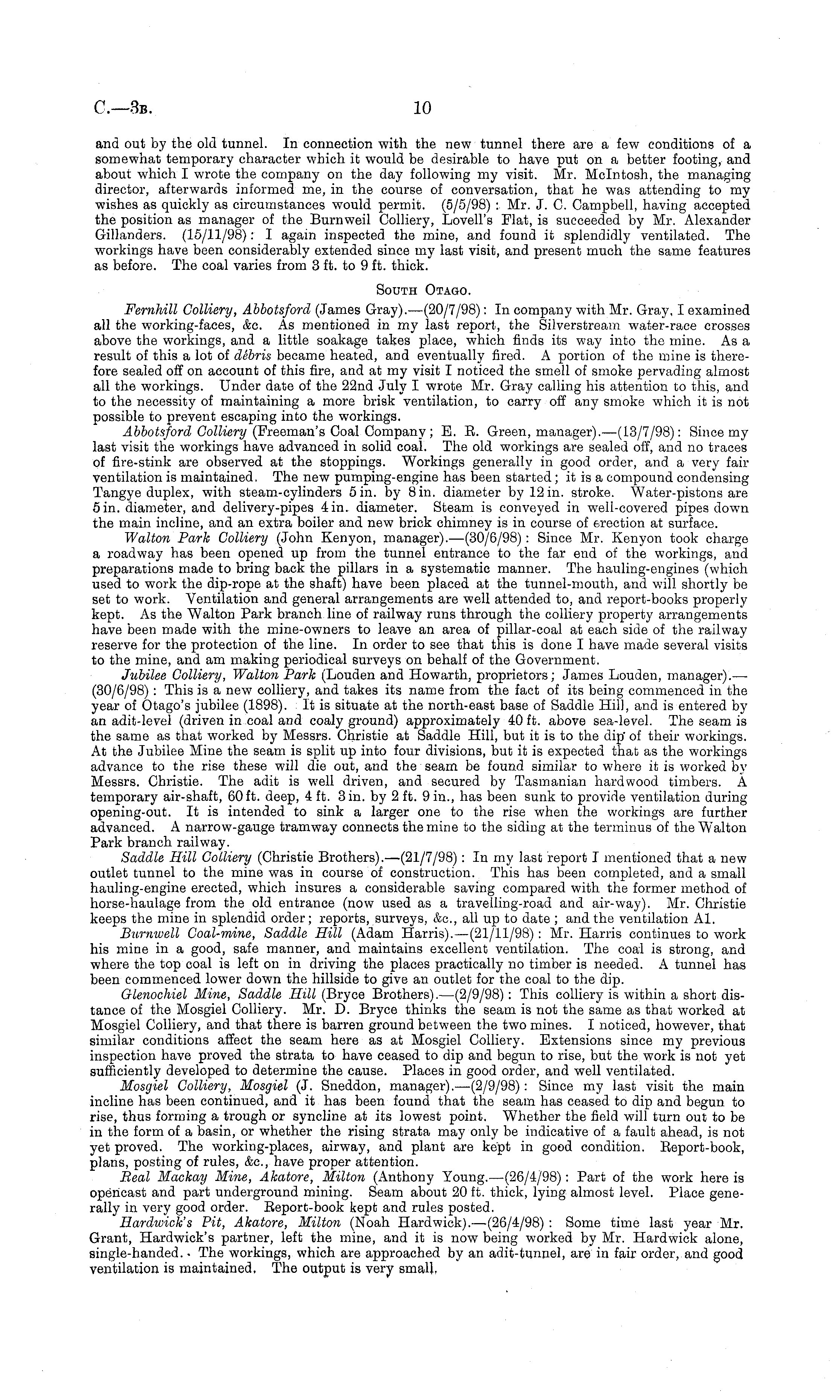 and out by the old tunnel. In connection with the new tunnel there are a few conditions of a somewhat temporary character which it would be desirable to have put on a better footing, and about which I wrote the company on the day following my visit. Mr. Mclntosh, the managing director, afterwards informed me, in the course of conversation, that he was attending to my wishes as quickly as circumstances would permit. (5/5/98) : Mr. J. C. Campbell, having accepted the position as manager of the Burnweil Colliery, Lovell's Plat, is succeeded by Mr. Alexander Gillanders. (15/11/98) : I again inspected the mine, and found it splendidly ventilated. The workings have been considerably extended since my last visit, and present much the same features as before. The coal varies from 3 ft. to 9 ft. thick. South Otago. Fernhill Colliery, Abbotsford (James Gray).—(2o/7/98): In company with Mr. Gray, I examined all the working-faces, &c. As mentioned in my last report, the Silverstream water-race crosses above the workings, and a little soakage takes place, which finds its way into the mine. As a result of this a lot of debris became heated, and eventually fired. A portion of the mine is therefore sealed off on account of this fire, and at my visit I noticed the smell of smoke pervading almost all the workings. Under date of the 22nd July I wrote Mr. Gray calling his attention to this, and to the necessity of maintaining a more brisk ventilation, to carry off any smoke which it is not possible to prevent escaping into the workings. Abbotsford Colliery (Freeman's Coal Company ; E. E. Green, manager). —(13/7/98): Since my last visit the workings have advanced in solid coal. The old workings are sealed off, and no traces of fire-stink are observed at the stoppings. Workings generally in good order, and a very fair ventilation is maintained. The new pumping-engine has been started; it is a compound condensing Tangye duplex, with steam-cylinders 5 in. by 8 in. diameter by 12 in. stroke. Water-pistons are 5 in. diameter, and delivery-pipes 4 in. diameter. Steam is conveyed in well-covered pipes down the main incline, and an extra boiler and new brick chimney is in course of erection at surface. Walton Park Colliery (John Kenyon, manager).—(3o/6/98): Since Mr. Kenyon took charge a roadway has been opened up from the tunnel entrance to the far end of the workings, and preparations made to bring back the pillars in a systematic manner. The hauling-engines (which used to work the dip-rope at the shaft) have been placed at the tunnel-mouth, and will shortly be set to work. Ventilation and general arrangements are well attended to, and report-books properly kept. As the Walton Park branch line of railway runs through the colliery property arrangements have been made with the mine-owners to leave an area of pillar-coal at each side of the railway reserve for the protection of the line. In order to see that this is done I have made several visits to the mine, and am making periodical surveys on behalf of the Government. Jubilee Colliery, Walton Park (Louden and Howarth, proprietors; James Louden, manager).— (30/6/98): This is a new colliery, and takes its name from the fact of its being commenced in the year of Otago's jubilee (1898). It is situate at the north-east base of Saddle Hill, and is entered by an adit-level (driven in coal and coaly ground) approximately 40 ft. above sea-level. The seam is the same as that worked by Messrs. Christie at Saddle Hill, but it is to the dip of their workings. At the Jubilee Mine the seam is split up into four divisions, but it is expected that as the workings advance to the rise these will die out, and the seam be found similar to where it is worked by Messrs. Christie. The adit is well driven, and secured by Tasmanian hardwood timbers. A temporary air-shaft, 60 ft. deep, 4 ft. 3 in. by 2 ft. 9 in., has been sunk to provide ventilation during opening-out. It is intended to sink a larger one to the rise when the workings are further advanced. A narrow-gauge tramway connects the mine to the siding at the terminus of the Walton Park branch railway. Saddle Hill Colliery (Christie Brothers). —(21/7/98): In my last report I mentioned that a new outlet tunnel to the mine was in course of construction. This has been completed, and a small hauling-engine erected, which insures a considerable saving compared with the former method of horse-haulage from the old entrance (now used as a travelling-road and air-way). Mr. Christie keeps the mine in splendid order; reports, surveys, &c, all up to date ; and the ventilation Al. Burnweil Goal-mine, Saddle Hill (Adam Harris). —(21/11/98): Mr. Harris continues to work his mine in a good, safe manner, and maintains excellent ventilation. The coal is strong, and where the top coal is left on in driving the places practically no timber is needed. A tunnel has been commenced lower down the hillside to give an outlet for the coal to the dip. Glenochiel Mine, Saddle Hill (Bryce Brothers). —(2/9/98): This colliery is within a short distance of the Mosgiel Colliery. Mr. D. Bryce thinks the seam is not the same as that worked at Mosgiel Colliery, and that there is barren ground between the two mines. I noticed, however, that similar conditions affect the seam here as at Mosgiel Colliery. Extensions since my previous inspection have proved the strata to have ceased to dip and begun to rise, but the work is not yet sufficiently developed to determine the cause. Places in good order, and well ventilated. Mosgiel Colliery, Mosgiel (J. Sneddon, manager).—(2/9/98): Since my last visit the main incline has been continued, and it has been found that the seam has ceased to dip and begun to rise, thus forming a trough or syncline at its lowest point. Whether the field will turn out to be in the form of a basin, or whether the rising strata may only be indicative of a fault ahead, is not yet proved. The working-places, airway, and plant are kept in g