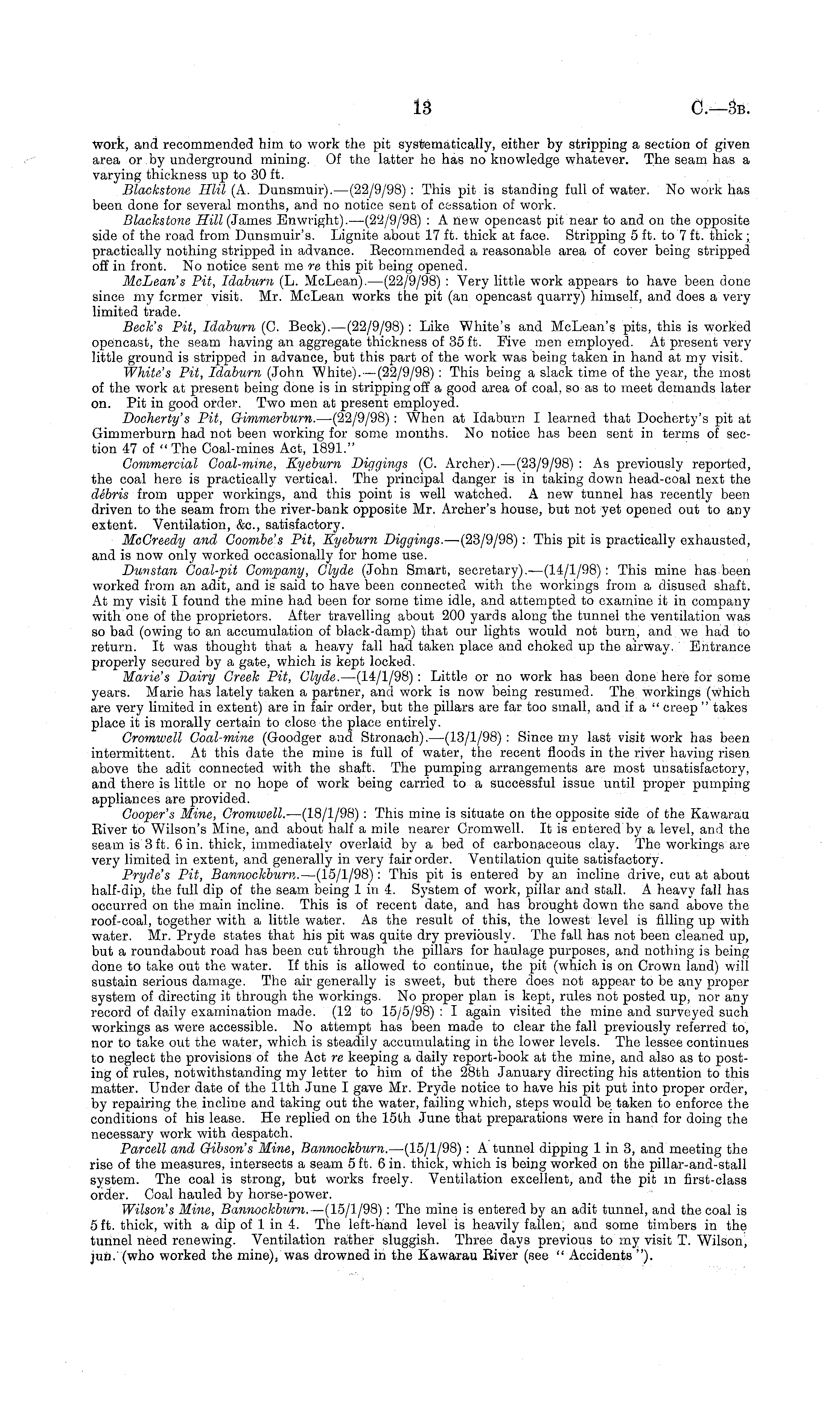 work, and recommended him to work the pit systematically, either by stripping a section of given area or by underground mining. Of the latter he has no knowledge whatever. The seam has a varying thickness up to 30 ft. Blackstone Hlil (A. Dunsmuir). —(22/9/98) : This pit is standing full of water. No work has been done for several months, and no notice sent of cessation of work. Blackstone Hill (James Enwright).—(22/9/98) : A new opencast pit near to and on the opposite side of the road from Dunsmuir's. Lignite about 17 ft. thick at face. Stripping 5 ft. to 7 ft. thick • practically nothing stripped in advance. Recommended a reasonable area of cover being stripped off in front. No notice sent me re this pit being opened. McLean's Pit, Idaburn (L. McLean). —(22/9/98) : Very little work appears to have been done since my former visit. Mr. McLean works the pit (an opencast quarry) himself, and does a very limited trade. Beck's Pit, Idaburn (C. Beck). —(22/9/98): Like White's and McLean's pits, this is worked opencast, the seam having an aggregate thickness of 35 ft. Five men employed. At present very little ground is stripped in advance, but this part of the work was being taken in hand at my visit. White's Pit, Idaburn (John White). —(22/9/98) : This being a slack time of the year, the most of the work at present being done is in stripping off a good area of coal., so as to meet demands later on. Pit in good order. Two men at present employed. Docherty's Pit, Gimmerburn. —(22/9/98) : When at Idaburn I learned that Docherty's pit at Gimmerburn had not been working for some months. No notice has been sent in terms of section 47 of "The Coal-mines Act, 1891." Commercial Goal-mine, Kyeburn Diggings (C. Archer). —(23/9/98) : As previously reported, the coal here is practically vertical. The principal danger is in taking down head-coal next the debris from upper workings, and this point is well watched. A new tunnel has recently been driven to the seam from the river-bank opposite Mr. Archer's house, but not yet opened out to any extent. Ventilation, &c, satisfactory. McCreedy and Goombe's Pit, Kyeburn Diggings. —(23/9/98) : This pit is practically exhausted, and is now only worked occasionally for home use. Duvstan Goal-pit Company, Clyde (John Smart, secretary). —(14/1/98): This mine has been worked from an adit, and is said to have been connected with the workings from a disused shaft. At my visit I found the mine had been for some time idle, and attempted to examine it in company with one of the proprietors. After travelling about 200 yards along the tunnel the ventilation was so bad (owing to an accumulation of black-damp) that our lights would not burn, and we had to return. It was thought that a heavy fall had taken place and choked up the airway. Entrance properly secured by a gate, which is kept locked. Marie's Dairy Greek Pit, Clyde. —(l 4/1/98) : Little or no work has been done here for some years. Marie has lately taken a partner, and work is now being resumed. The workings (which are very limited in extent) are in fair order, but the pillars are far too small, and if a " creep " takes place it is morally certain to close the place entirely. Cromwell Coal-mine (Goodger and Stronach). —(13/1/98) : Since my last visit work has been intermittent. At this date the mine is full of water, the recent floods in the river having risen above the adit connected with the shaft. The pumping arrangements are most unsatisfactory, and there is little or no hope of work being carried to a successful issue until proper pumping appliances are provided. Cooper's Mine, Cromwell. —(lß/1/98) : This mine is situate on the opposite side of the Kawarau Eiver to Wilson's Mine, and about half a mile nearer Cromwell. It is entered by a level, and the seam is 3 ft. 6 in. thick, immediately overlaid by a bed of carbonaceous clay. The workings are very limited in extent, and generally in very fair order. Ventilation quite satisfactory. Pryde's Pit, Bannockburn. —(ls/1/98) : This pit is entered by an incline drive, cut at about half-dip, the full dip of the seam being lin 4. System of work, pillar and stall. A heavy fall has occurred on the main incline. This is of recent date, and has brought down the sand above the roof-coal, together with a little water. As the result of this, the lowest level is filling up with water. Mr. Pryde states that his pit was quite dry previously. The fall has not been cleaned up, but a roundabout road has been cut through the pillars for haulage purposes, and nothing is being done to take out the water. If this is allowed to continue, the pit (which is on Crown land) will sustain serious damage. The air generally is sweet, but there does not appear to be any proper system of directing it through the workings. No proper plan is kept, rules not posted up, nor any record of daily examination made. (12 to 15/5/98) : I again visited the mine and surveyed such workings as were accessible. No attempt has been made to clear the fall previously referred to, nor to take out the water, which is steadily accumulating in the lower levels. The lessee continues to neglect the provisions of the Act re keeping a daily report-book at the mine, and also as to posting of rules, notwithstanding my letter to him of the 28th January directing his attention to this matter. Under date of the 11th June I gave Mr. Pryde notice to have his pit put into proper order, by repairing the incline and taking out the water, failing which, steps would be taken to enforce the conditions of his lease. He replied on the 15th June that preparations were in hand for doing the necessary work with despatch. Parcell and Gibson's Mine, Bannockburn. —(ls/1/98): A tunnel dipping 1 in 3, and meeting the rise of the measures, intersects a seam 5 ft. 6 in. thick, which is being worked on the pillar-and-stall system. The coal is strong, but works freely. Ventilation excellent, and the pit in first-class ord