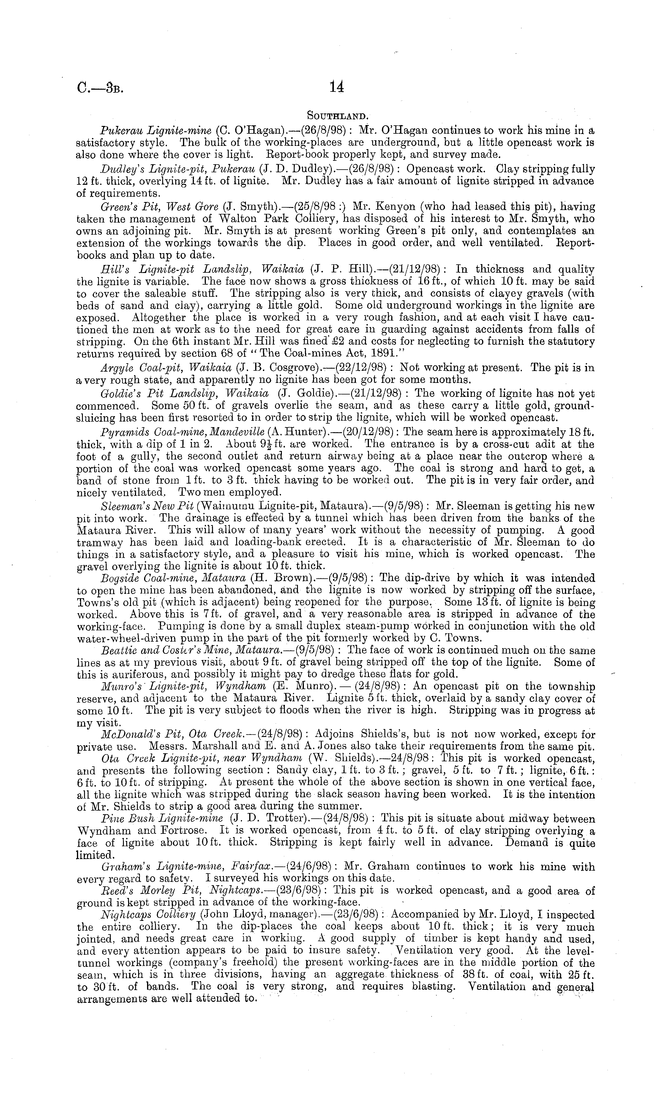 Southland. Pukerau Lignite-mine (C. O'Hagan).—(26/8/98): Mr. O'Hagan continues to work his mine in a satisfactory style. The bulk of the working-places are underground, but a little opencast work is also done where the cover is light. Eeport-book properly kept, and survey made. Dudley's Lignite-fit, Pukerau (J. D. Dudley).—(26/8/98) : Opencast work. Clay stripping fully 12 ft. thick, overlying 14 ft. of lignite. Mr. Dudley has a fair amount of lignite stripped in advance of requirements. Green's Pit, West Gore (J. Smyth).—(2s/8/98 :) Mr. Kenyon (who had leased this pit), having taken the management of "Walton Park Colliery, has disposed of his interest to Mr. Smyth, who owns an adjoining pit. Mr. Smyth is at present working Green's pit only, and contemplates an extension of the workings towards the dip. Places in good order, and well ventilated. Beportbooks and plan up to date. Rill's Lignite-pit Landslip, Waikaia (J. P. Hill). —(21/12/98) : In thickness and quality the lignite is variable. The face now shows a gross thickness of 16 ft., of which 10 ft. may be said to cover the saleable stuff. The stripping also is very thick, and consists of clayey gravels (with beds of sand and clay), carrying a little gold. Some old underground workings in the lignite are exposed. Altogether the place is worked in a very rough fashion, and at each visit I have cautioned the men at work as to the need for great care in guarding against accidents from falls of stripping. On the 6th instant Mr. Hill was fined £2 and costs for neglecting to furnish the statutory returns required by section 68 of " The Coal-mines Act, 1891." Argyle Goal-pit, Waikaia (J. B. Cosgrove).—(22/12/98) : Not working at present. The pit is in a very rough state, and apparently no lignite has been got for some months. Goldie's Pit Landslip, Waikaia (J. Goldie). —(21/12/98) : The working of lignite has not yet commenced. Some 50 ft. of gravels overlie the seam, and as these carry a little gold, groundsluicing has been first resorted to in order to strip the lignite, which will be worked opencast. Pyramids Goal-mine, Mandeville (A. Hunter). —(20/12/98): The seam here is approximately 18 ft. thick, with a dip of lin 2. About 9 J- ft. are worked. The entrance is by a cross-cut adit at the foot of a gully, the second outlet and return airway being at a place near the outcrop where a portion of the coal was worked opencast some years ago. The coal is strong and hard to get, a band of stone from 1 ft. to 3 ft. thick having to be worked out. The pit is in very fair order, and nicely ventilated. Two men employed. Sleeman's Neiu Pit (Waimumu Lignite-pit, Mataura). —(9/5/98) : Mr. Sleeman is getting his new pit into work. The drainage is effected by a tunnel which has been driven from the banks of the Mataura Eiver. This will allow of many years' work without the necessity of pumping. A good tramway has been laid and loading-banli erected. It is a characteristic of Mr. Sleeman to do things in a satisfactory style, and a pleasure to visit his mine, which is worked opencast. The gravel overlying the lignite is about 10 ft. thick. Bogside Coal-mine, Mataura (H. Brown). —(9/5/98): The dip-drive by which it was intended to open the mine has been abandoned, and the lignite is now worked by stripping off the surface, Towns's old pit (which is adjacent) being reopened for the purpose. Some 13 ft. of lignite is being worked. Above this is 7 ft. of gravel, and a very reasonable area is stripped in advance of the working-face. Pumping is done by a small duplex steam-pump worked in conjunction with the old water-wheel-driven pump in the part of the pit formerly worked by C. Towns. Beattie and Gosttr's Mine, Mataura. —(9/5/98) : The face of work is continued much on the same lines as at my previous visit, about 9 ft. of gravel being stripped off the top of the lignite. Some of this is auriferous, and possibly it might pay to dredge these flats for gold. Munro's Lignite-pit, Wyndham (E. Munro). — (24/8/98): An opencast pit on the township reserve, and adjacent to the Mataura Eiver. Lignite 5 ft. thick, overlaid by a sandy clay cover of some 10 ft. The pit is very subject to floods when the river is high. Stripping was in progress at my visit. McDonald's Pit, Ota Greek. — (24/8/98) : Adjoins Shields's, but is not now worked, except for private use. Messrs. Marshall and B. and A. Jones also take their requirements from the same pit. Ota Creek Lignite-pit, near Wyndham (W. Shields). —24/8/98: This pit is worked opencast, and presents the following section: Sandy clay, 1 ft. to 3 ft. ; gravel, 5 ft. to 7 ft.; lignite, 6 ft. : 6 ft. to 10 ft. of stripping. At present the whole of the above section is shown in one vertical face, all the lignite which was stripped during the slack season having been worked. It is the intention of Mr. Shields to strip a good area during the summer. Pine Bush Lignite-mine (J. D. Trotter). —(24/8/98) : This pit is situate about midway between Wyndham and Fortrose. It is worked opencast, from 4 ft. to 5 ft. of clay stripping overlying a face of lignite about 10 ft. thick. Stripping is kept fairly well in advance. Demand is quite limited. Graham's Lignite-mine, Fairfax. —(24/6/98): Mr. Graham continues to work his mine with every regard to safety. I surveyed his workings on this date. Heed's Morley Pit, Nightcaps. —(23/6/98): This pit is worked opencast, and a good area of ground is kept stripped in advance of the working-face. Nightcaps Colliery (John Lloyd, manager).—(23/6/98) : Accompanied by Mr. Lloyd, I inspected the entire colliery. In the dip-places the coal keeps about 10ft. thick; it is very much jointed, and needs great care in working. A good supply of timber is kept handy and used, and every attention appears to be paid to insure safety. Ventilation very good. At the leveltunnel workings (company's freehold) the present working-faces are in the middle portion of the seam, which is in three