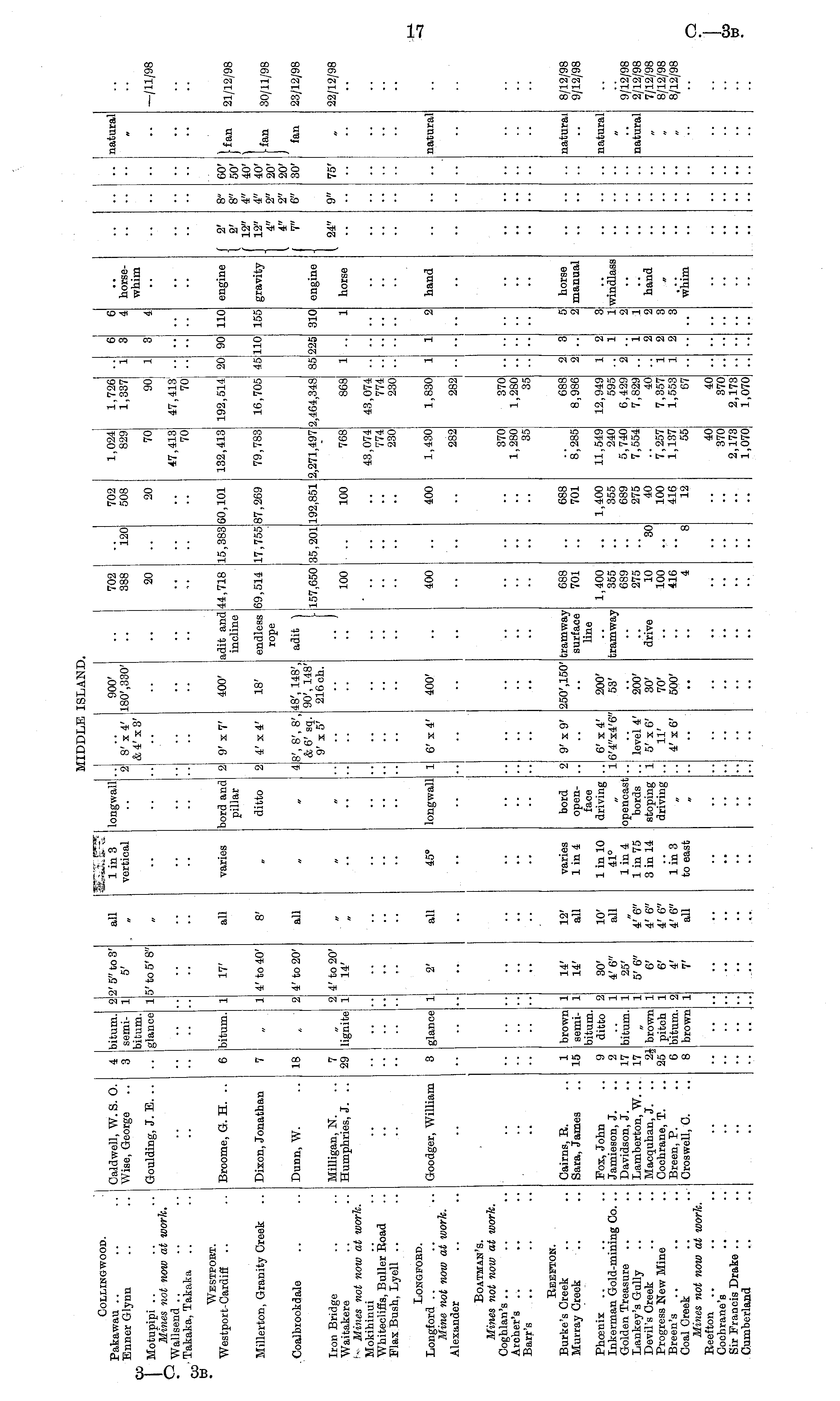 tIDDLE ISLAND i I COLDIHGWOOD. Pakawau .. .. Enner Glynn .. Caldwell, W. S. 0. Wise, George 4 3 bitum. semibitum. glance 2 1 2' 5" to 3' 5' all Iin3 vertical longwall '2, 8' x 4' & 4' x 3' 900' 180',330' 702 388 "l20 702 508 1,024 829 1,726 1,337 "i 6 3 6 4 horsewhim natural Motupipi Mines not now at work. Wallsend Takaka, Takaka Goulding, 3. E. .. 5'to 5' 8" 20 20 70 90 -/11/9S 47,413 70 47,413 70J Westpobt. Westport-Cardiff Broome, G. H. bitum. 17' all varies bord and pillar 9' x7' 400' adit and incline 44,718 15,383 60,101 132,413 192,514 20! 90 110 engine 2' 2' 12" 12" 4" 4" 7" 8" 8" 4" 4" 2" 2" 6" 60' 50' 40' 40' 20' 20' 30' I fan I fan 21/12/9! Millerton, Granity Creek Dixon, Jonathan 4' to 40' 8' ditto 4'x4' 18' endless rope 69,514 17,755 87,269 79,783 16,705 45 110 155 gravity 30/11/9! . Coalbrookdale Dunn, W. 18 4' to 20' all 8', 8', 8', & 6' sq. 9' x5' 48', 148', 90', 148' 216 ch. adit 1 2,271,497 2,464,348 engine fan 23/12/9! Iron Bridge Waitakere ; - Mines not now at work. Mokihinui Whitecliffs, Buller Eoad Flax Bush, Lyell Milligan, N. Humphries, J. lignite ! 4' to 20' 14' 157,650 35,201 192,851 85 225 310 24" 22/12/9! 7 29 2 1 100 100 768 868 horse 9" 75' •• 43,074 774 230 43,074 774 230 i Longeoed. Longford Mine not now at work. Alexander Goodger, William 3 glance 2' all 45° longwall 6'x4' 400' 400 400 1,430 1,830 hand natural 282 282 - •• Boatman's. Mines not now at work. Coghlan's Archer's Barr's ! •• . •• •• 370 1,280 35 370 1,280 35 Eeefton. Burke's Creek Murray Creek Cairns, E. Sara, James 1 15 brown semibitum. ditto 1 1 14' 14' 12' all varies lint bord 9'x9' 250',150' tramway surface line 688 701 " 688 701 8 1285 688 8,986 2 2 8 5 2 horse manual natural 8/12/9! 9/12/9! Phoenix Inkerman Gold-mining Co. .. Golden Treasure Lankey's Gully Devil's Creek Progress New Mine Breen's Coal Creek Mines not now at work. Eeefton Cochrane's Sir Francis Drake Cumberland Pox, John Jamieson, J. Davidson, J. Lamberton, W. .. Macguhan, J. Cochrane, T. Breen, P. Oroswell, 0. 9 2 17 17 24 25 6 8 30' 4' 6" 25' 5' 6" 6' 6' 4' 7' 10' all linlO 41° lin4 lin75 3 in 14 openface driving 6' x 4' 6'4"x4'6" 200' 53' 1,400 355 689 275 10 100 416 4 1,400 355 689 275 40 100 416 12 11,549 240 5,740 7,554 12,949 595 6,429 7,829 40 7,357 1,553 67 2 1 windlass natural 2 1 1 1 1 1 2 1 1 tramway 1 2 3 1 2 1 2 3 3 9/12/9! 2/12/9! 7/12/91 8/12/9! 8/12/9! bitum. 4'6" 4' 6" 4' 6" 4' 6" all opencast bords stoping driving •• level 4' 5' x6' 11' 4'x6' 200' 30' 70' 500' 1 2 2 2 natural brown pitch bitum. brown li'n3 to east 1 drive *30 7,257 1,137 55 1 1 hand •• 8 •• ■• whim 40 370 2,173 1,070 40 370 2,173 1,070 •• •• •• •• •• •• •• •• •■ ■-