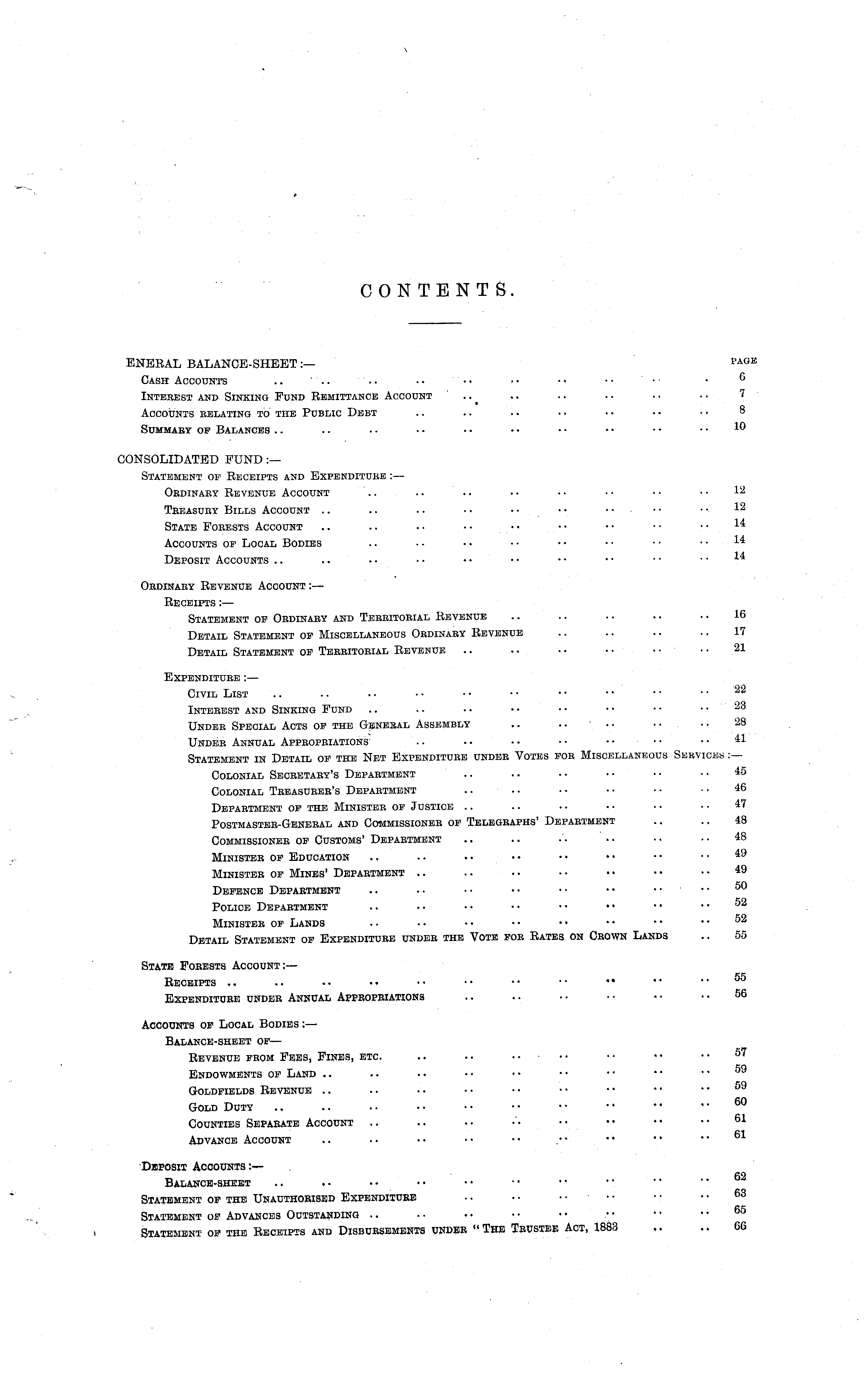 ENEEAL BALANCE-SHEET:— I>AaK Cash Accounts .. ".. •■ ■• •• •• •• •• ' • ■ • 6 Interest and Sinking Fund Remittance Account .. _ .. .. .. .. •• 7 Accounts relating to the Public Debt .. .. .. .. • • • • • • 8 Summary of Balances .. .. .. ■ - • • • • • • • • • • • ■ 10 CONSOLIDATED EUND :— Statement op Receipts and Expenditure :— Ordinary Revenue Account .. .. .. . • • • • • • • • • 12 Treasury Bills Account .. .. .. • ■ • • • • • ■ • • • ■ 12 State Forests Account .. .. • • • • • • • • • • • • ■ • 14 Accounts of Local Bodies .. • - ■ • • • • • • • • • • • 14 Deposit Accounts .. .. . ■ • • • • • • • • • • • • • • 14 Ordinary Eevenue Account :— Eeceipts :— Statement of Ordinary and Territorial Revenue .. .. .. .. •• 16 Detail Statement of Miscellaneous Ordinary Revenue .. .. .. .. 17 Detail Statement of Territorial Revenue .. .. ■ • • • • • • • 21 Expenditure :— Civil List .. .. .. • • • • •• • • ■• ••• • a 2 Interest and Sinking Fund .. .. .. • • ■ • • ■ • • • • 2d Under Special Acts of the Genebal Assembly .. .. • • • ■ • 28 Under Annual Appropriations .. .. • • • • • • • • • • 41 Statement in Detail of the Net Expenditure under Votes for Miscellaneous Services :— Colonial Secretary's Department .. .. • • • • • • • • 45 Colonial Treasurer's Department .. .. . - • • • • • • 46 Department of the Minister of Justice .. .. .. • • • • • • 47 Postmaster-General and Commissioner of Telegraphs' Department .. .. 48 Commissioner of Customs' Department .. .. .'. •• •• •• 48 Minister of Education .. .. . • • • • ■ • • • • • • 49 Minister of Mines' Department .. .. •• •• •• •• •• 49 Defence Department .. . • • • • • • • ■ • • • • • 50 Police Department .. •• ■ • • • ■ • • • • • • • 52 en Minister of Lands Detail Statement of Expenditure under the Vote for Eates on Crown Lands .. 55 State Forests Account:— Receipts Expenditure under Annual Appropriations .. .. •• •• •• •• 56 Accounts of Local Bodies ; — Balance-sheet of— Revenue from Fees, Fines, etc. .. .. .... .. •• •• 57 Endowments of Land Goldfiblds Revenue .. .. •• •• •• •• •• •• •• 59 Gold Duty .. .. .. 60 Counties Separate Account .. .. •• •"• •■ •• •• ■• 61 fii Advance Account Deposit Accounts :— 62 Balance-sheet .. .- •• Statement of the Unauthorised Expenditure • • • • • • ■ ■ • • • • 63 Statement of Advances Outstanding Statement of the Receipts and Disbursements under " The Trustee Act, 1883 .. .. 66