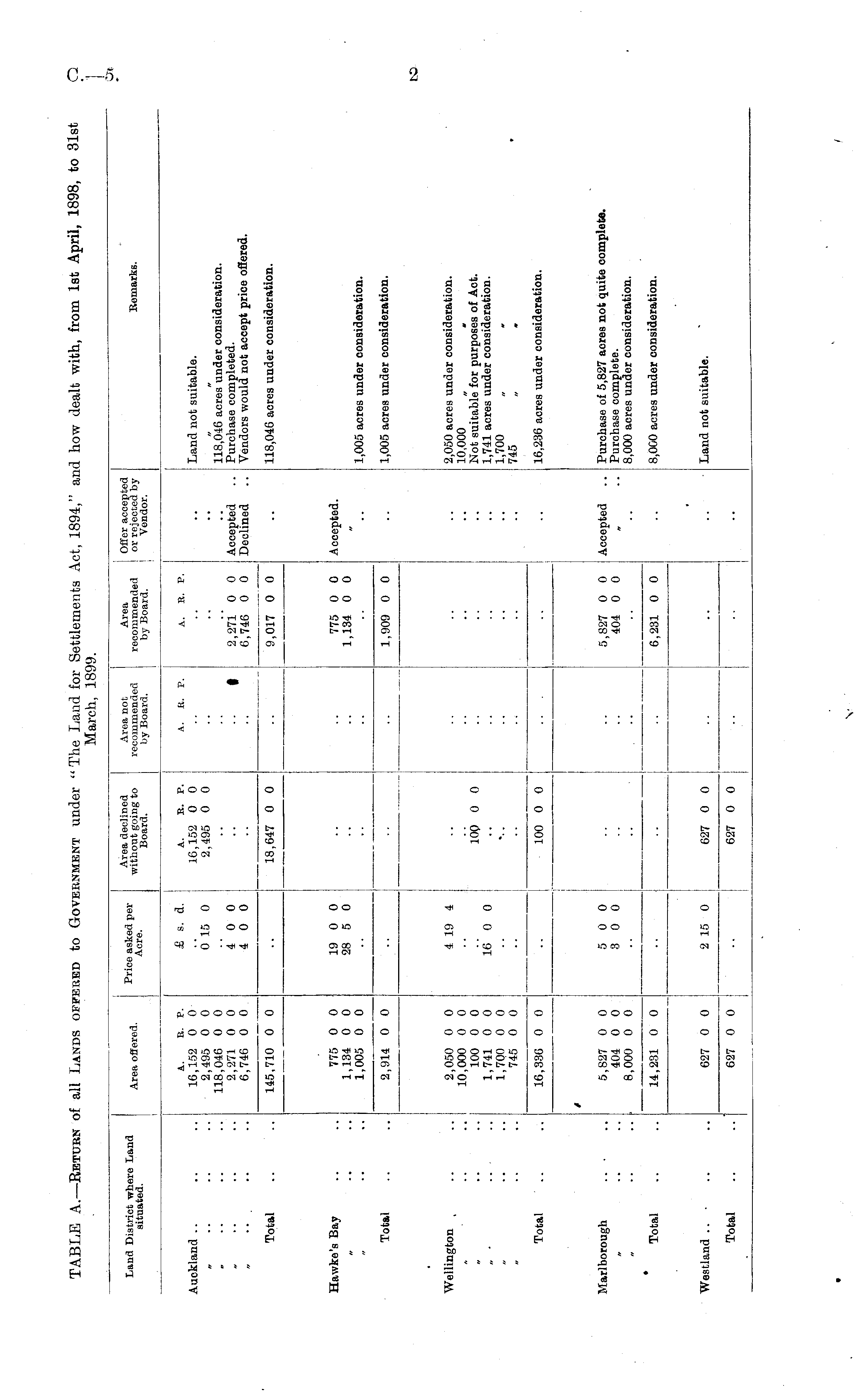 Land District where Land situated. Area offered. Price asked per Acre. Area declined without going to Board. Area not recommended by Board. Area recommended by Board. Offer accepted ! or rejected by Vendor. Remarks. Auckland .. A. R. P. 16,152 0 0 2,495 0 0 118,046 0 0 2,271 0 0 6,746 0 0 £ s. d. 6 15 0 A. R. P. 16,152 0 0 2,495 0 0 A. H. P. A. R. P. - Land not suitable. 118,046 acres under consideration. Purchase completed. Vendors would not accept price offered. 4 0 0 4 0 0 • 2,271 0 0 6,746 0 0 Accepted Declined Total 145,710 0 0 18,647 0 0 9,017 0 0 118,046 acres under consideration. Hawke's Bay 775 0 0 1,134 0 0 Accepted. 1,005 acres under consideration. 775 0 0 1,134 0 0 1,005 0 0 2,914 0 0 19 0 0 28 5 0 Total 1,909 0 0 1,005 acres under consideration. Wellington , 2,050 0 0 10,000 0 0 100 0 0 1,741 0 0 1,700 0 0 745 0 0 4 19 4 10Q 0 0 2,050 acres under consideration. 10,000 Not suitable for purposes of Aot. 1,741 acres under consideration. 1,700 745 • 16 0 0 Total 16,336 0 0 100 0 0 16,236 acres under consideration. Marlborough / Accepted 5,827 0 0 404 0 0 8,000 0 0 14,231 0 0 5 0 0 3 0 0 5,827 0 0 404 0 0 Purchase of 5,827 acres not quite complete. Purchase complete. 8,000 acres under consideration. •■ • Total 6,231 0 0 8,000 acres under consideration. Westland .. ■ 627 0 0 2 15 0 627 0 0 Land not suitable. Total 627 0 0 627 0 0