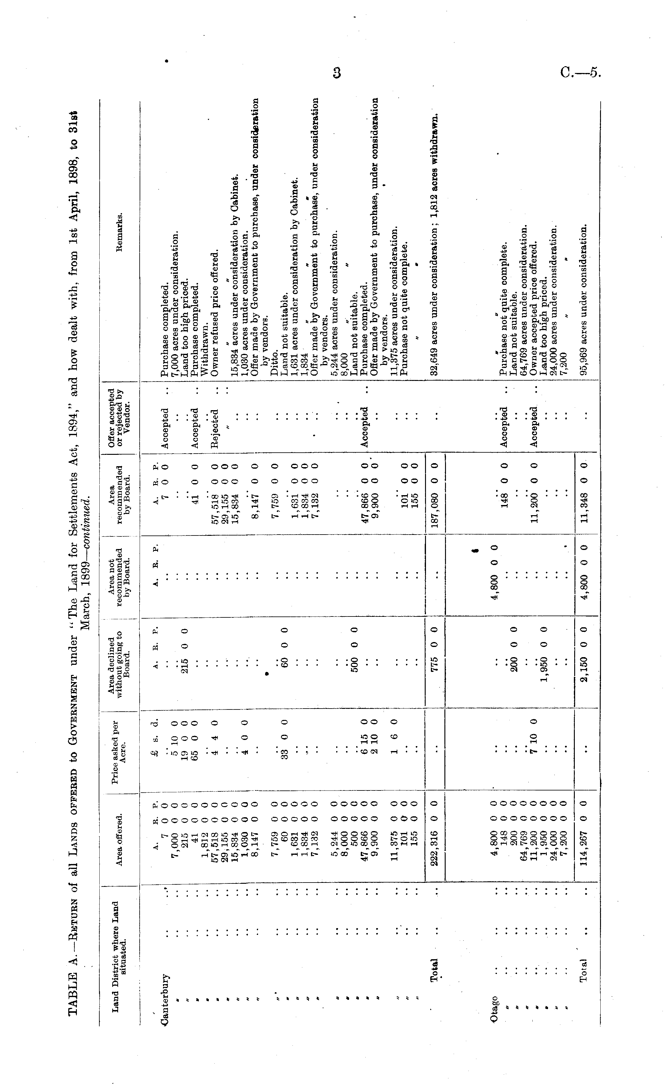Land District where Land situated. Area offered. Price asked per Acre. Area declined without going to Board. I Area not recommended I by Board. Area recommended by Board. Offer accepted or rejected by Vendor. Remarks. A. R. P. 7 0 0 7,000 0 0 215 0 0 41 0 0 1,812 0 0 57,518 0 0 29,155 0 0 15,834 0 0 1,030 0 0 8,147 0 0 £ s. d. A. R. P. A. R. p. A. R. P. 7 0 0 Canterbury 5 10 0 19 0 0 65 0 0 Accepted Purchase completed. 7,000 acres under consideration. Land too high priced. Purchase completed. Withdrawn. Owner refused price offered. 215 0 0 4i' 0 0 Accepted 4 4 0 57,518 0 0 29,155 0 0 15,834 0 0 Rejected 7,759 0 0 60 0 0 1,631 0 0 1,834 0 0 7,132 0 0 4 0 0 33 0 0 • 60 0 0 8,147 0 0 7,759 0 0 1,631 0 0 1,834 0 0 7,132 0 0 15,834 acres under consideration by Cabinet. 1,030 acres under consideration. Offer made by Government to purchase, under consideratioi by vendors. Ditto. Land not suitable. 1,631 acres under consideration by Cabinet. 1,834 „ „ » Offer made by Government to purchase, under consideratioi by vendors. 5,244 acres under consideration. 8,000 Land not suitable. Purchase completed. Offer made by Government to purchase, under consideratioi by vendors. • 11,375 acres under consideration. Purchase not quite complete. * 5,244 0 0 8,000 0 0 500 0 0 47,866 0 0 9,900 0 0 6 15 0 2 10 0 500 0 0 47,866 0 0 9,900 0 0 Accepted 11,375 0 0 101 0 0 155 0 0 16 0 ioi 0 0 155 0 0 Total 222,316 0 0 J 775 0 0 ■• 187,080 0 0 32,649 acres under consideration ; 1,812 acres withdrawn. Otago 4,800 0 0 148 0 0 200 0 0 64,769 0 0 11,200 0 0 1,950 0 0 24,000 0 0 7,200 0 0 114,267 0 0 I 148 0 0 Accepted • 4,800 0 0 Purchase not quite complete. Land not suitable. 64,769 acres under consideration. Owner accepted price offered. Land too high priced. 24,000 acres under consideration. 7,200 •• •• 200 0 0 710 0 11,200 0 0 Accepted 1,950 0 0 .. .. . 1 2,150 0 0 95,969 acres under consideration. Total 4,800 0 0 11,348 0 0