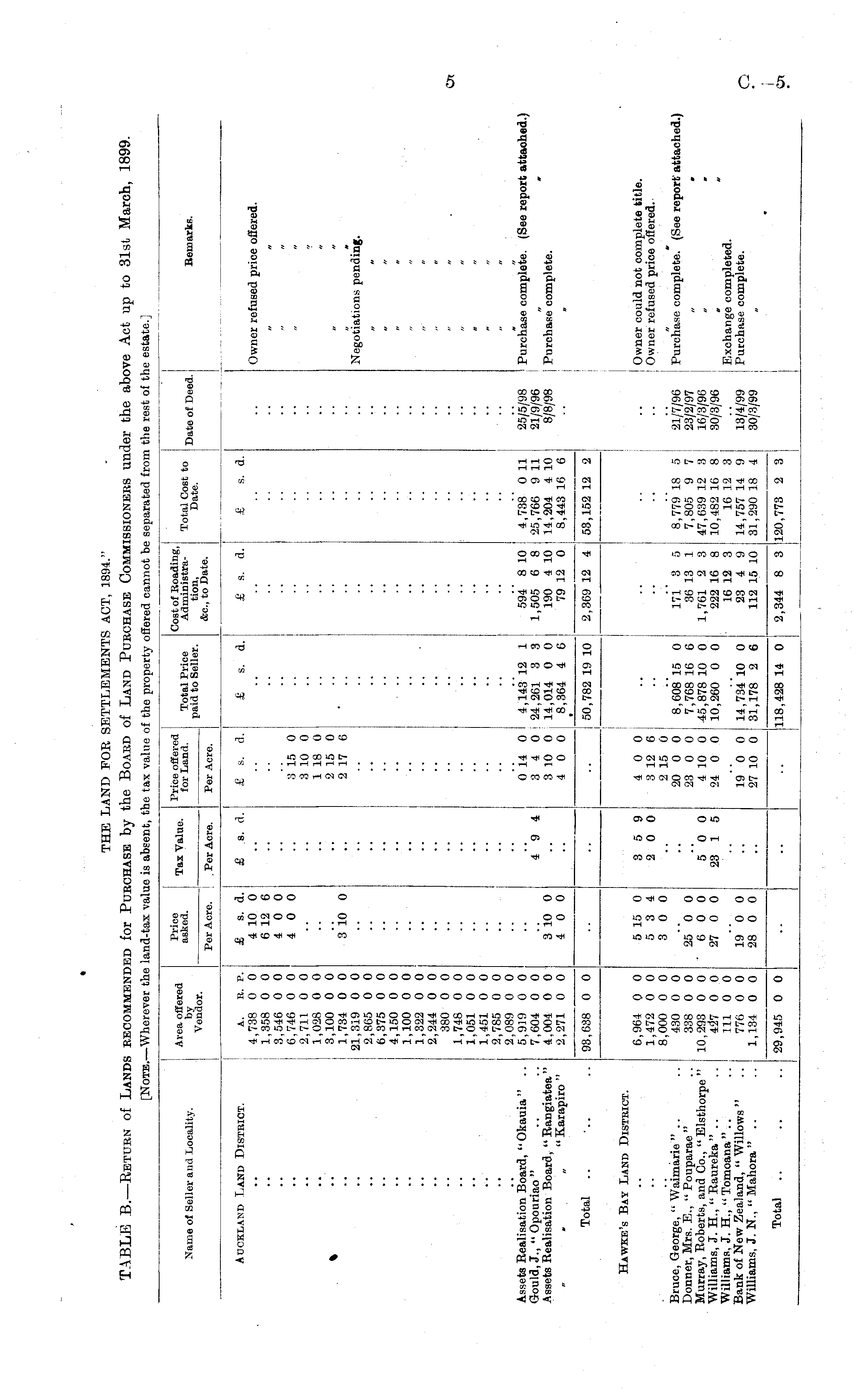 [Note. —Wherever the land-tax value is absent, tl e tax value f the property offered cannot b< separated fro: the rest of tl e estate.] Name of Seller and Locality. Area offered by Vendor. Price asked. Tax Value. Price offered for Land. Total Price iaid to Seller. Cost of Reading, Administration, &c, to Date. Total Cost to Date. Date of Deed. Bern arks. Per Acre. | . Per Acre. Per Acre. Auckland Land District. A. R. P. 4,738 0 0 1,358 0 0 3,546 0 0 6.746 0 0 2,711 0 0 1,028 0 0 3,100 0 0 1,734 0 0 21,319 0 0 2,865 0 0 6,375 0 0 ' 4,150 0 0 1,100 0 0 1,322 0 0 2,244 0 0 380 0 0 1,748 0 0 1,051 0 0 1,451 0 0 2,785 0 0 2,089 0 0 5,919 0 0 7,604 0 0 4,004 0 0 2,271 0 0 93,638 0 0 £, s. d. 4 10 0 6 12 6 4 0 0 4 0 0 £ s. d. £ s. d. £ s. d. £ s. d. £ s. d. Owner refused price offered. 3 15 0 3 10 0 1 18 0 2 15 0 2 17 6 % 310 0 Negotiations pending. ■• . Assets Realisation Board, " Okauia " .. Gould, J., " Opouriao " Assets Realisation Board, "Rangiatea" „ » „ "Karapiro" 3 10 0 4 0 0 4 9 4 0 14 0 3 4 0 3 10 0 4 0 0 4,143 12 1 24,261 3 3 14,014 0 0 8,364 4 6 594 8 10 1,505 6 8 190 4 10 79 12 0 4,738 0 11 25,766 9 11 14,204 4 10 8,443 16 6 : 25/5/98 21/9/96 8/8/98 ' Purchase complete. (See report attached/ I Purchase complete. Total .. 53,152 12 2 I 50,782 19 10 2,369 12 4 Hawse's Bay Land District. ! Owner could not complete title. I Owner refused price offered.Bruce, George, " Waimarie " .. Donner, Mrs. E., " Pouparae " Murray, Roberts, and Co., " Elsthorpe " Williams, J. H., " Raureka Williams, J. H., " Tomoana " .. Bank of New Zealand, " Willows " Williams, J. N., " Mahora " .. 6,964 0 0 1,472 0 0 8,000 0 0 430 0 0 338 0 0 10,293 0 0 427 0 0 111 0 0 776 0 0 1,134 0 0 5 15 0 5 3 4 3 0 0 25 0 0 • 6 0 0 27 0 0 3 5 9 2 0 0 5 - 'o 0 23 1 5 4 0 0 3 12 6 2 15 0 20 0 0 23 0 0 4 10 0 24 0 0 8,608 15 0 7,768 16 6 45,878 10 0 10,260 0 0 171 3 5 36 13 1 1,761 2 3 222 16 8 16 12 3 23 4 9 112 15 10 8,779 18 5 7,805 9 7 47,639 12 3 10,482 16 8 16 12 3 14,757 14 9 31,290 18 4 120,773 2 3 21/7/96 23/2/97 16/3/96 30/3/96 13/4/99 30/3/99 Purchase complete. (See report attached.] Exchange completed. Purchase complete. 19 0 0 28 0 0 19' 0 0 27 10 0 14,734 10 0 31,178 2 6 Total .. ■ • 29,945 0 0 • ■ 118,428 14 0 2,344 8 3