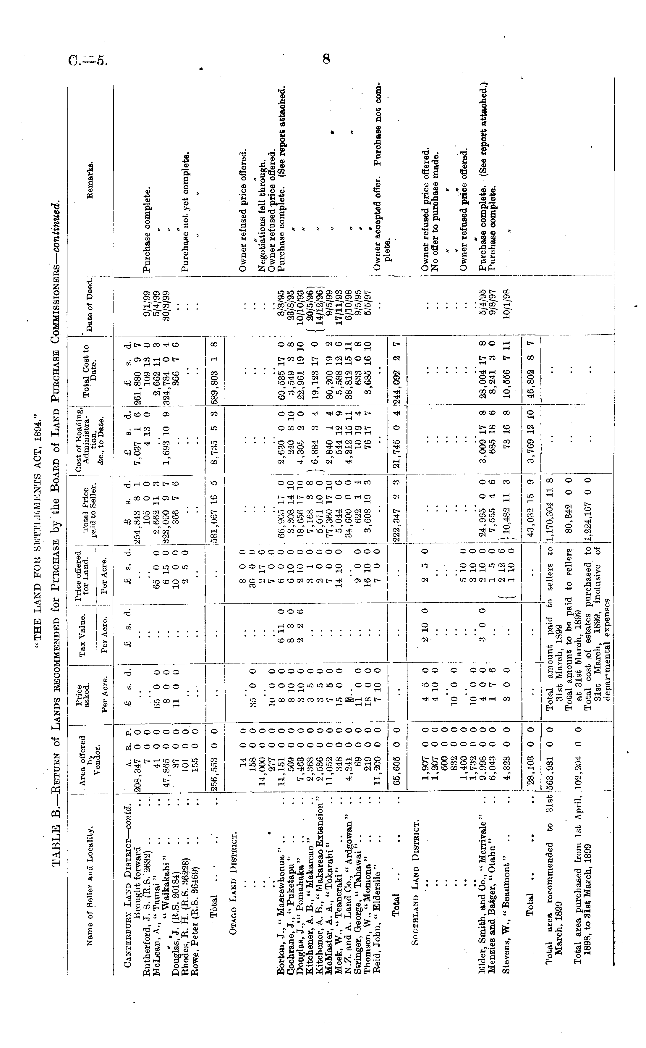 Name of Seller and Locality. Area offered Price asked. Tax Value Price offered lax value. for La nd. Total Price paid to Seller. Cost of Roading, Administra- Total Cost to "jw. nf two, tion, Date. uate ot ueecl - &c, to Date. Remarks. Per Acre. Per Acre, j Per Acre. Canterbury Land District — contd. Brought forward Rutherford, J. S. (R.S. 2682) .. McLean, A., " Tamai " „ " Waikakahi " .. Douglas, J. (R.S. 20184) Rhodes, R. H. (R.S. 36228) Rowe, Peter (R.S. 36469) A. R. P. 208,847 0 0 7 0 0 41 0 0 47,865 0 0 37 0 0 101 0 0 155 0 0 £ s. d.j .. 65 0 0 8 0 0 11 0 0 £ s. d. .. £ s. d.| ! 65 0 0 6 15 0 : 10 0 0 2 5 0 £ s. d. 254,843 8 1 105 0 0 2,662 11 3 323,090 9 7 366 7 6 £ s. d. 7,037 1 6 ! 4 13 0! 1,693' 10 9 £ s. d. 261,880 9 7 109 13 0 2,662 11 3 324,784 0 4 366 7 6 9/1/99 5/4/99 30/3/99 Purchase complete. I Purchase not yet complete. Total .. • 256,553 0 0 581,067 16 5 8,735 5 3 589,803 1 8 •■ -- Otago Land District. 8 0 0 30 0 0 2 17 6 7 0 0 6 0 0 6 10 0 2 10 0 3 10 2 0 0 7 0 0 14 10 0 Owner refused price offered. • Borton, J., " Maerewhenua " .. Cochrane, J., " Puketapu " .. Douglas, J.,'" Pomahaka " Kitchener, A. B., " Makareao " Kitchener, A. B., " Makareao Extension " McMaster, A. A., " Tokarahi " Meek, W., " Teaneraki" N.Z. and A. Land Co., " Ardgowan " .. Stringer, George, " Tahawai ".. Thomson, W., " Momona " .. Reid, John, " Elderslie " 14 0 0 158 0 0 14,000 0 0 277 0 0 11,151 0 0 509 0 0 7,463 0 0 2,368 0 0 2,536 0 0 11,052 0 0 348 0 0 4,241 0 0 69 0 0 219 0 0 11,200 0 0 35 0 0 10 0 0 8 0 0 8 10 0 3 10 0 3 5 0 3 5 0 7 5 0 15 0 0 11 0 0 is o o ; 7 10 0 6 11 0 8 3 0 2 2 6 i I I 66,905 17 0 3,308 14 10 18,656 17 10 7,168 3 8 5,071 10 0 77,360 17 10 5,044 0 6 34,600 0 0 622 1 4 3,608 19 3 i 2,630 0 0 240 8 10 4,305 2 0 I 6,884 3 4 •• 69,535 17 0 3,549 3 8 22,961 19 10 19,123 17 0 j 8/8/95 23/8/95 10/10/93 j 20/5/96) 1 14/12/96 f 9/5/99 17/11/93 6/10/98 9/5/95 5/5/97 Negotiations fell through. Owner refused price offered. Purchase complete. (See report attached. 9 0 0 16 10 0 7 0 0 2,840 1 4 544 12 9 4,212 15 11 10 19 4 76 17 7 80,200 19 2 5,588 12 6 38,812 15 11 633 0 8 3,685 16 10 * 9 - 1222,347 2 3 21,745 0 4 - 244,092 2 7 Owner accepted offer. Purchase not com plete. Total 65,605 0 0 Southland Land District. Owner refused price offered. No offer to purchase made. 1,907 0 0 1,207 0 0 600 0 0 832 0 0 1,460 0 0 1,732 0 0 9,998 0 0 6,043 0 0 4 5 0 4 10 0 10 "o 0 2 10 0 2 5 0 ■•■ 5 10 0 3 10 0 2 10 0 15 0 j 2 12 6 t 1 10 0 ■■ Owner refused price offered. Elder, Smith, and Co., " Merrivale " .. Menzies and Batger, " Otahu " 10 0 0 4 0 0 17 6 3 "o 0 •• | 24,995 0 0 7,555 4 6 3,009 17 8 685 18 6 28,00417 8 8,241 3 0 5/4/95 9/8/97 Purchase complete. (See report attached. Purchase complete. Stevens, W., " Beaumont " 4,328 0 0 3 0 0 110,482 11 3 43,032 15 9 73 16 8 10,556 7 11 10/1/98 Total .. 28,103 0 0 • - 3,769 12 10 46,802 8 7 Total area recommended to 31st March, 1899 I i ! Total area purchased from 1st April, 1898, to 31st March, 1899 1563,931 0 0 j 102,204 0 0 Total amount paid to sellers to 31st March, 1899 Total amount to be paid to Fellers at 31st March, 1899 Total cost of estates purchased to 31st March, 1899, inclusive of departmental expenses 1,170,304 11 8 I 80,342 0 0 I " | 1,224,167 0 0