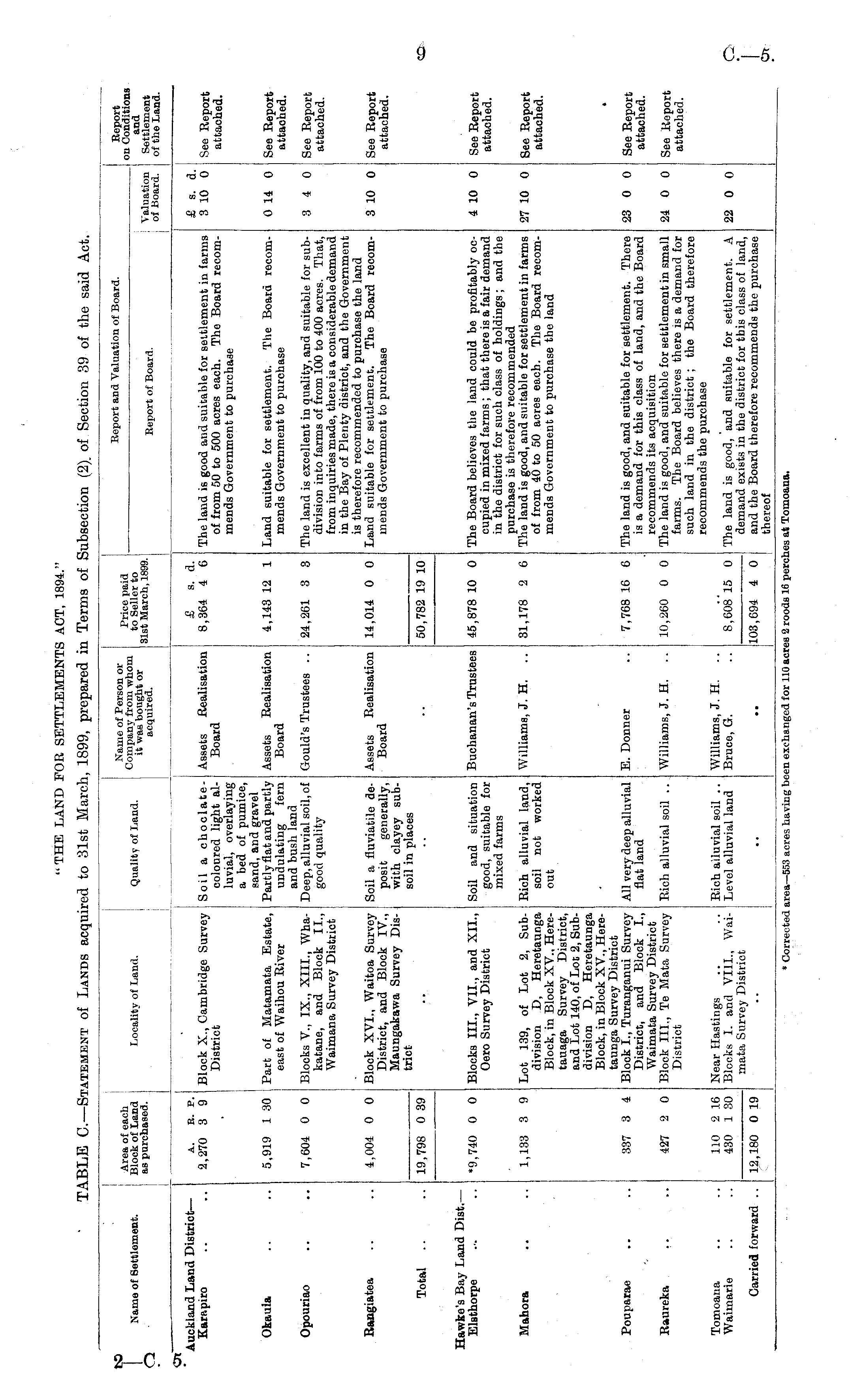Name of Settlement. Area of each Block of Land as purchased. Locality of Land. Quality of Land. Name of Person or Company from whom it was bought or acquired. to Seller to 31st March, 1899. Report and Valuation of Board. Report on Conditions and : Valuation Settlement , of Board. of the Land. Report of Board. Auckland Land District — Karapiro A. R. P. 2,270 3 9 Block X., Cambridge Survey District Soil a choclatecoloured light alluvial, overlaying a bed of pumice, sand, and gravel Partly flat and partly undulating fern and bush land Deep, alluvial soil, of good quality Assets Realisation Board £ s. d. 8,364 4 6 The land is good and suitable for settlement in farms of from 50 to 500 acres each. The Board recommends Government to purchase £ s. d. 3 10 0 See Report attached. I Okauia 5,919 1 30 l Part of Matamata Estate, east of Waihou River Assets Realisation Board 4,143 12 1 Land suitable for settlement. The Board recommends Government to purchase 0 14 0 See Report attached. Opouriao 7,604 0 0 Blocks V., IX., XIII., Whakatane, and Block II., Waimana Survey District Gould's Trustees .. 24,261 3 3 The land is excellent in quality, and suitable for subdivision into farms of from 100 to 400 acres. That, from inquiries made, there is a considerable demand in the Bay of Plenty district, and the Government is therefore recommended to purchase the land Land suitable for settlement. The Board recommends Government to purchase 3 4 0 See Report attached. Bangiatea 4,004 0 0 Blook XVI., Waitoa Survey District, and Block IV., Maungakawa Survey District Soil a fluviatile deposit generally, with clayey subsoil in places Assets Realisation Board 14,014 0 0 3 10 0 See Report attached. Total 19,798 0 39 50,782 19 10 Hawke's Bay Land Dist. — Elsthorpe Mahora | *9,740 0 0 Blocks III., VII., and XII., Oero Survey District Lot 139, of Lot 2, Subdivision D, Heretaunga Block, in Block XV., Heretauaga Survey District, and Lot 140, of Lot 2, Subdivision D, Heretaunga Block, in Block XV., Heretaunga Survey District Block I., Turanganui Survey District, and Block I., Waimata Survey District Block III., Te Mata Survey District Soil and situation good, suitable for mixed farms Buchanan's Trustees Williams, J. H. 45,878 10 0 31,178 2 6 The Board believes the land could be profitably occupied in mixed farms ; that there is a fair demand in the district for such class of holdings ; and the purchase is therefore recommended The land is good, and suitable for settlement in farms of from 40 to 50 acres each. The Board recommends Government to purchase the land 4 10 0 27 10 0 See Report attached. See Report attached. 1,133 3 9 Rich alluvial land, soil not worked out Pouparae 337 3 4 427 2 0 All very deep alluvial flat land E. Donner Williams, J. H. 7,768 16 6 The land is good, and suitable for settlement. There is a demand for this class of land, and the Board recommends its acquisition The land is good, and suitable for settlement in small farms. The Board believes there is a demand for such land in the district ; the Board therefore recommends the purchase 23 0 0 24 0 0 See Report attached. Raureka .. Rich al luvial soil [ 10,260 0 0 See Report attached. Tomoana Waimarie 110 2 16 430 1 30 Near Hastings Blocks I. and VIII., Waimata Survey District Rich ailuvial soil .. Level alluvial land Williams, J. H. Bruce, G. 8,608 15 0 103,694 4 0 The land is good, and suitable for settlement. A demand exists in the district for this class of land, and the Board therefore recommends the purchase thereof 22 0 0 Carried forward .. 12,180 0 19 I * Corrected area— 553 acres having been exchanged for 110 acres 2 roods 16 perches at Tomoana.