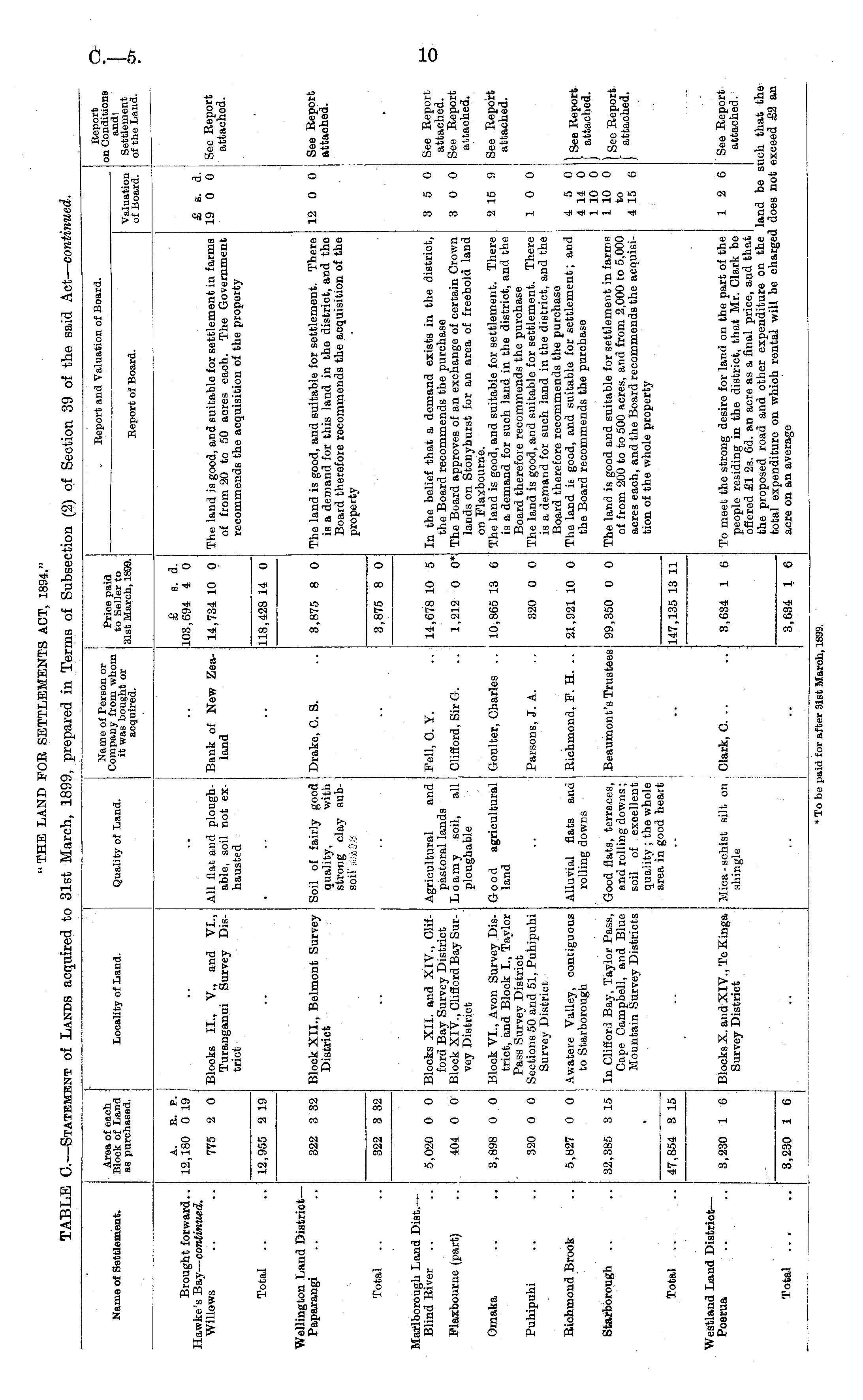 Name of Person or Report and Valuation of Board. Report on Conditions and! Settlement of the Land. Name of Settlement. Area of each Block of Land as purchased. Locality of Land. Quality of Land. to Seller to 31st March, 1899. it was bought or acquired. Report of Board. Valuation of Board. Brought forward.. Hawke's Bay — continued. Willows A. R. P. 12,180 0 19 j £ s. d. 103,694 4 0 775 2 0 Blocks II., V., and VI., Turanganui Survey District All flat and ploughable, soil not exhausted Bank of New Zealand 14,734 10 0 £ s. d. 19 0 0 The land is good, and suitable for settlement in farms 19 0 0 of from 20 to 50 acres each. The Government recommends the acquisition of the property See Report attached. Total 12,955 2 19 118,428 14 0 Wellington Land District — Paparangi 322 3 32 Block XII., Belmont Survey District Soil of fairly good quality, with strong clay subsoil' Mi 0.8 Drake, C. S. 3,875 8 0 The land is good, and suitable for settlement. There 12 0 0 is a demand for this land in the district, and the Board therefore recommends the acquisition of the property > 12 0 0 See Report attached. Total 322 3 32 3,875 8 0 Marlborough Land Dist.— Blind River Flaxbourne (part) Omaka 5,020 0 0 404 0 0' I 3,898 0 0 Blocks XII. and XIV., Clifford Bay Survey District Block XIV., Clifford Bay Survey District Block VI., Avon Survey District, and Block I., Taylor Pass Survey District Sections 50 and 51, Puhipuhi Survey District Agricultural and pastoral lands Loamy soil, all ploughable Good agricultural land Fell, C. Y. Clifford, Sir G. Goulter, Charles .. I 14,678 10 5 1,212 0 0* I 10,865 13 6 In the belief that a demand exists in the district, 3 5 0 the Board recommends the purchase The Board approves of an exchange of certain Crown 3 0 0 lands on Stonyhurst for an area of freehold land on Flaxbourne. The land is good, and suitable for settlement. There 2 15 9 is a demand for such land in the district, and the Board therefore recommends the purchase The land is good, and suitable for settlement. There 10 0 is a demand for such land in the district, and the Board therefore recommends the purchase The land is good, and suitable for settlement; and 4 5 0 the Board recommends the purchase 4 14 0 i in n 3 5 0 3 0 0 2 15 9 See Report attached. See Report attached. See Report attached. Puhipuhi 320 0 0 Parsons, J. A. 320 0 0 10 0 Richmond Brook i 5,827 0 0 32,385 3 15 Awatere Valley, contiguous to Starborough Alluvial flats and rolling downs I Richmond, F. H. Beaumont's Trustees 21,921 10 0 4 5 0 4 14 0 1 10 0 1 10 0 to 4 15 6 | See Report j attached. 1 See Report j attached. Starborough In Clifford Bay, Taylor Pass, Cape Campbell, and Blue Mountain Survey Districts Good flats, terraces, and rolling downs; soil of excellent quality ; the whole area in good heart 99,350 0 0 The land is good and suitable for settlement in farms 1 10 0 of from 200 to to 500 acres, and from 2,000 to 5,000 to acres each, and the Board recommends the acquisi- 4 15 6 tion of the whole property Total — 1 147,135 13 11 47,854 3 15 Westland Land District — Poerua 3,230 1 6 Blocks X. and XIV., Te Kinga Survey District Mica-schist silt on shingle J j Clark, C. .. 3,634 1 6 To meet the strong desire for land on the part of the 12 6 people residing in the district, that Mr. Clark be offered £1 2s. 6d. an acre as a final price, and that the proposed road and other expenditure on the land be si total expenditure on which rental will be charged does not i acre on an average See Report attached. Total ... uch that the exceed £2 an 3,230 1 6 3,634 1 6 * To be paid for after 31st March, 1899.