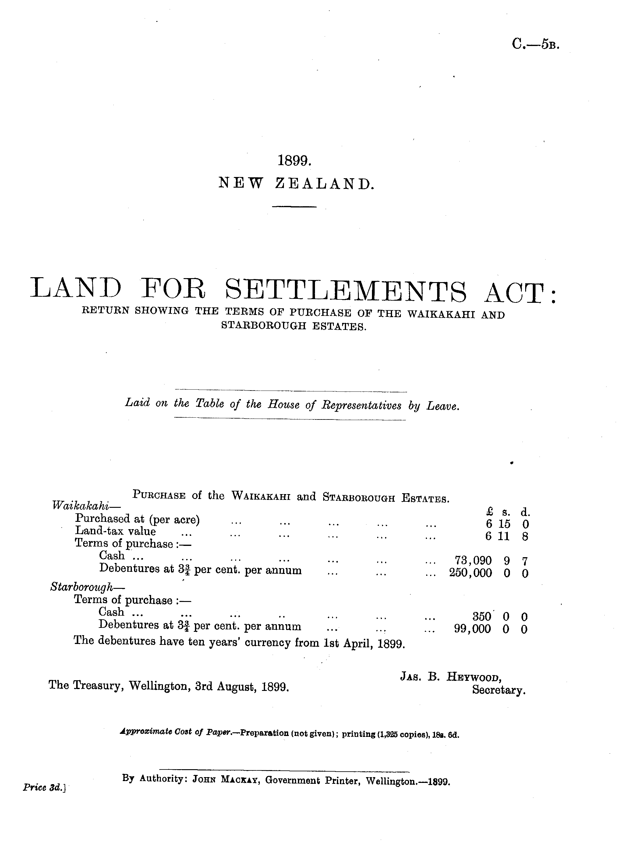 LAND FOR SETTLEMENTS ACT: RETURN SHOWING THE TERMS OF PURCHASE OF THE WAIKAKAHI AND STARBOROUGH ESTATES.