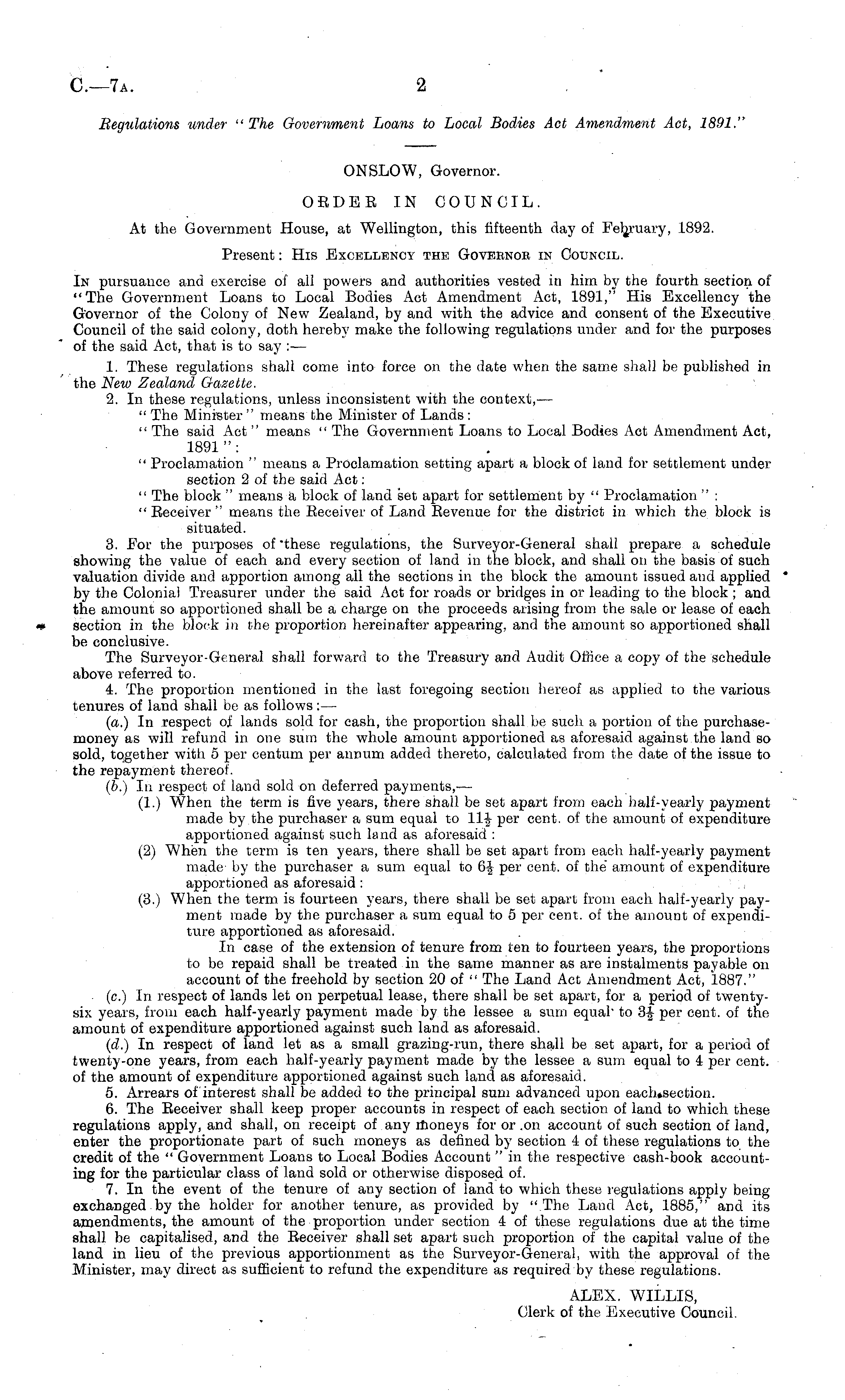 Regulations under "The Government Loans to Local Bodies Act Amendment Act, 1891." ONSLOW, Governor. OBDEE IN COUNCIL. At the Government House, at Wellington, this fifteenth day of February, 1892. Present: His Excellency the Governor in Council. In pursuance and exercise of all powers and authorities vested in him by the fourth section of "The Government Loans to Local Bodies Act Amendment Act, 1891," His Excellency the Governor of the Colony of New Zealand, by and with the advice and consent of the Executive Council of the said colony, doth hereby make the following regulations under and for the purposes of the said Act, that is to say : — 1. These regulations shall come into force on the date when the same shall be published in the New Zealand Gazette. 2. In these regulations, unless inconsistent with the context, — " The Minister " means the Minister of Lands : " The said Act" means " The Government Loans to Local Bodies Act Amendment Act, 1891 " : " Proclamation " means a Proclamation setting apart a block of land for settlement under section 2 of the said Act: " The block " means a block of land set apart for settlement by " Proclamation " : " Beceiver " means the Eeceiver of Land Eevenue for the district in which the block is situated. 3. For the purposes of 'these regulations, the Surveyor-General shall prepare a schedule showing the value of each and every section of land in the block, and shall on the basis of such valuation divide and apportion among all the sections in the block the amount issued and applied by the Colonial Treasurer under the said Act for roads or bridges in or leading to the block ; and the amount so apportioned shall be a charge on the proceeds arising from the sale or lease of each • section in the block in the proportion hereinafter appearing, and the amount so apportioned shall be conclusive. The Surveyor-General shall forward to the Treasury and Audit Office a copy of the schedule above referred to. 4. The proportion mentioned in the last foregoing section hereof as applied to the various tenures of land shall be as follows :— (a.) In respect of lands sold for cash, the proportion shall be such a portion of the purchasemoney as will refund in one sum the whole amount apportioned as aforesaid against the land so sold, together with 5 per centum per annum added thereto, calculated from the date of the issue to the repayment thereof. (b.) In respect of land sold on deferred payments,- — (1.) When the term is five years, there shall be set apart from each half-yearly payment made by the purchaser a sum equal to per cent, of the amount of expenditure apportioned against such land as aforesaid : (2) When the term is ten years, there shall be set apart from each half-yearly payment made by the purchaser a sum equal to 6-J per cent, of the amount of expenditure apportioned as aforesaid : (3.) When the term is fourteen years, there shall be set apart from each half-yearly payment made by the purchaser a sum equal to 5 per cent, of the amount of expenditure apportioned as aforesaid. In case of the extension of tenure from ten to fourteen years, the proportions to be repaid shall be treated in the same manner as are instalments payable on account of the freehold by section 20 of " The Land Act Amendment Act, 1887." (c.) In respect of lands let on perpetual lease, there shall be set apart, for a period of twentysix years, from each half-yearly payment made by the lessee a sum equal" to 3-| per cent, of the amount of expenditure apportioned against such land as aforesaid. (d.) In respect of land let as a small grazing-run, there shall be set apart, for a period of twenty-one years, from each half-yearly payment made by the lessee a sum equal to 4 per cent, of the amount of expenditure apportioned against such land as aforesaid. 5. Arrears of interest shall be added to the principal sum advanced upon eaclusection. 6. The Eeceiver shall keep proper accounts in respect of each section of land to which these regulations apply, and shall, on receipt of any moneys for or .on account of such section of land, enter the proportionate part of such moneys as defined by section 4 of these regulations to the credit of the " Government Loans to Local Bodies Account " in the respective cash-book accounting for the particular class of land sold or otherwise disposed of. 7. In the event of the tenure of any section of land to which these regulations apply beingexchanged by the holder for another tenure, as provided by "The Laud Act, 1885," and its amendments, the amount of the proportion under section 4 of these regulations due at the time shall be capitalised, and the Eeceiver shall set apart such proportion of the capital value of the land in lieu of the previous apportionment as the Survey or-General, with the approval of the Minister, may direct as sufficient to refund the expenditure as required by these regulations. ALEX. WILLIS, Clerk of the Executive Council.