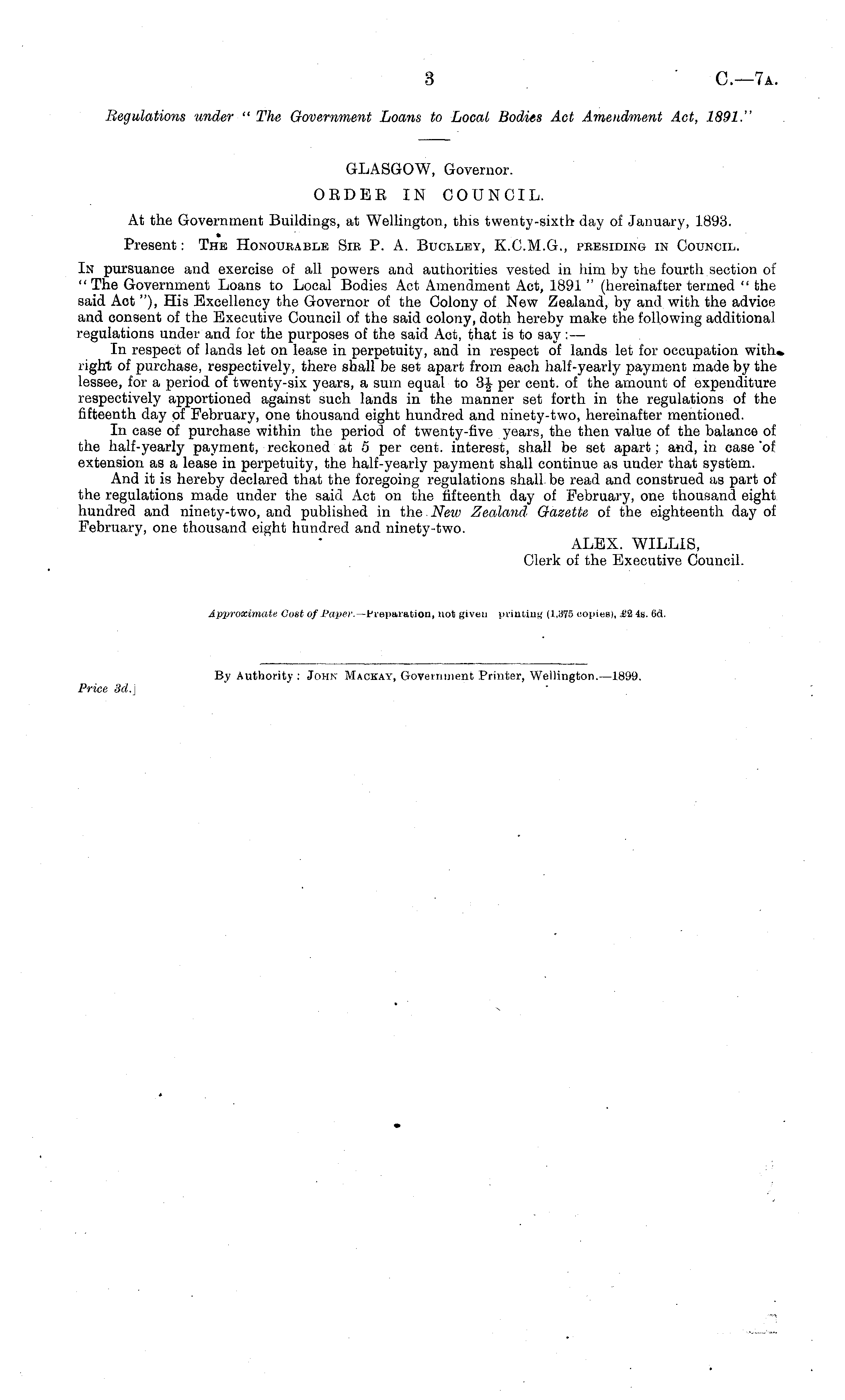 Regulations under " The Government Loans to Local Bodies Act Amendment Act, 1891." GLASGOW, Governor. OEDEE IN COUNCIL. At the Government Buildings, at Wellington, this twenty-sixth day of January, 1893. Present: The Honoukable Sic P. A. Buckley, K.C.M.G., pbesiding in Council. In pursuance and exercise of all powers and authorities vested in him by the fourth section of " The Government Loans to Local Bodies Act Amendment Act, 1891 " (hereinafter termed " the said Act "), His Excellency the Governor of the Colony of New Zealand, by and with the advice and consent of the Executive Council of the said colony, doth hereby make the following additional regulations under and for the purposes of the said Act, that is to say : — In respect of lands let on lease in perpetuity, and in respect of lands let for occupation with*, right of purchase, respectively, there shall be set apart from each half-yearly payment made by the lessee, for a period of twenty-six years, a sum equal to 3J per cent, of the amount of expenditure respectively apportioned against such lands in the manner set forth in the regulations of the fifteenth day of February, one thousand eight hundred and ninety-two, hereinafter mentioned. In case of purchase within the period of twenty-five years, the then value of the balance of the half-yearly payment, reckoned at 5 per cent, interest, shall be set apart; and, in case'of extension as a lease in perpetuity, the half-yearly payment shall continue as under that system. And it is hereby declared that the foregoing regulations shall be read and construed as part of the regulations made under the said Act on the fifteenth day of February, one thousand eight hundred and ninety-two, and published in the..New Zealand Gazette of the eighteenth day of February, one thousand eight hundred and ninety-two. ALEX. WILLIS, Clerk of the Executive Council. Approximate Cost of Pa/per. —Preparation, not given printing (1.375 copies), £2 4s. 6d.