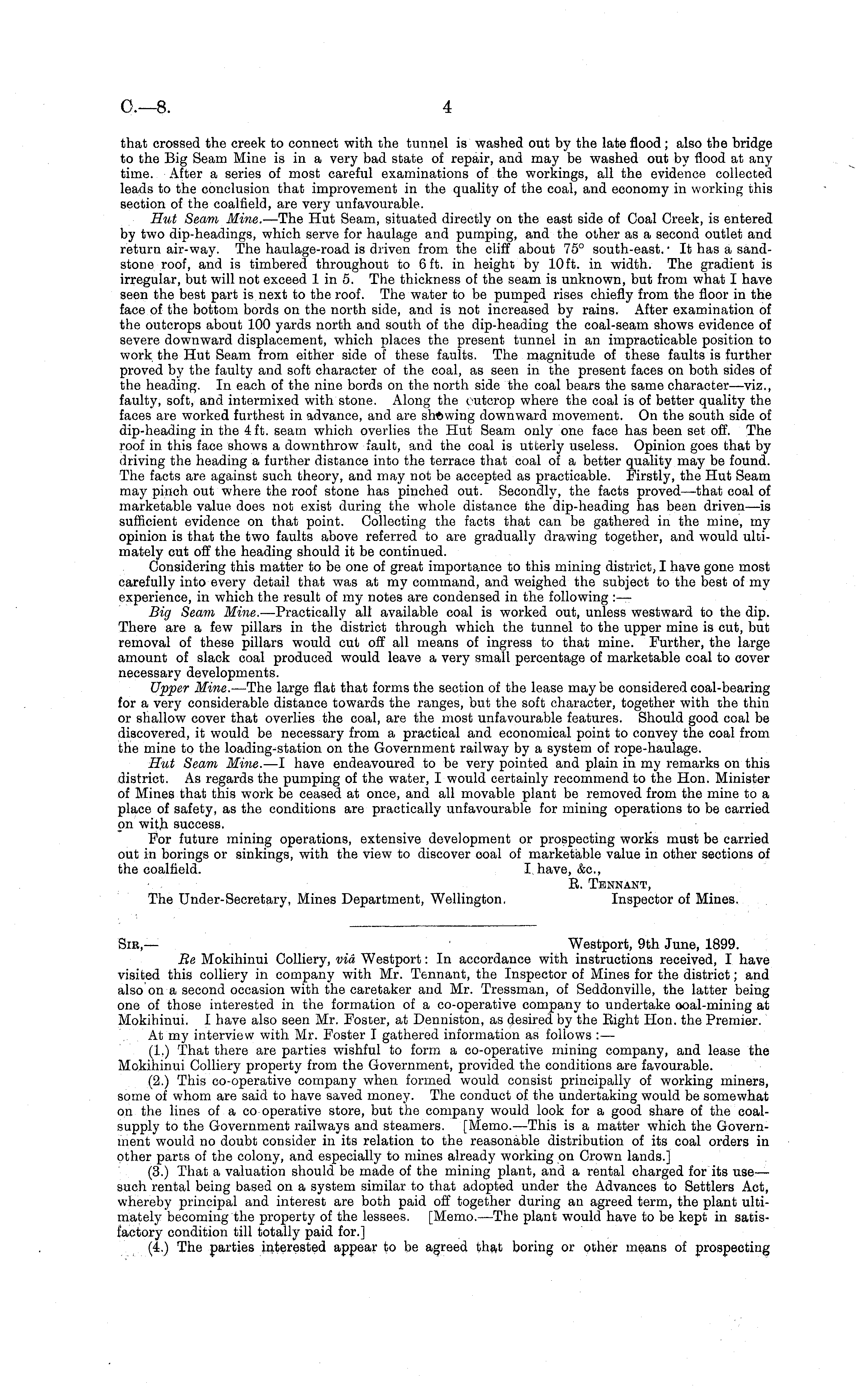 Sir,— Westport, 9th June, 1899. Be Mokihinui Colliery, via Westport: In accordance with instructions received, I have visited this colliery in company with Mr. Tennant, the Inspector of Mines for the district; and also on a second occasion with the caretaker and Mr. Tressman, of Seddonville, the latter being one of those interested in the formation of a co-operative company to undertake ooal-mining at Mokihinui. I have also seen Mr. Foster, at Denniston, as desired by the Eight Hon. the Premier. At my interview with Mr. Foster I gathered information as follows : — (1.) That there are parties wishful to form a co-operative mining company, and lease the Mokihinui Colliery property from the Government, provided the conditions are favourable. (2.) This co-operative company when formed would consist principally of working miners, some of whom are said to have saved money. The conduct of the undertaking would be somewhat on the lines of a co operative store, but the company would look for a good share of the coalsupply to the Government railways and steamers. [Memo. —This is a matter which the Government would no doubt consider in its relation to the reasonable distribution of its coal orders in other parts of the colony, and especially to mines already working on Crown lands.] (3.) That a valuation should be made of the mining plant, and a rental charged for its use— such rental being based on a system similar to that adopted under the Advances to Settlers Act, whereby principal and interest are both paid off together during an agreed term, the plant ultimately becoming the property of the lessees. [Memo. —The plant would have to be kept in satisfactory condition till totally paid for.] (4.) The parties interested appear to be agreed that boring or other means of prospecting