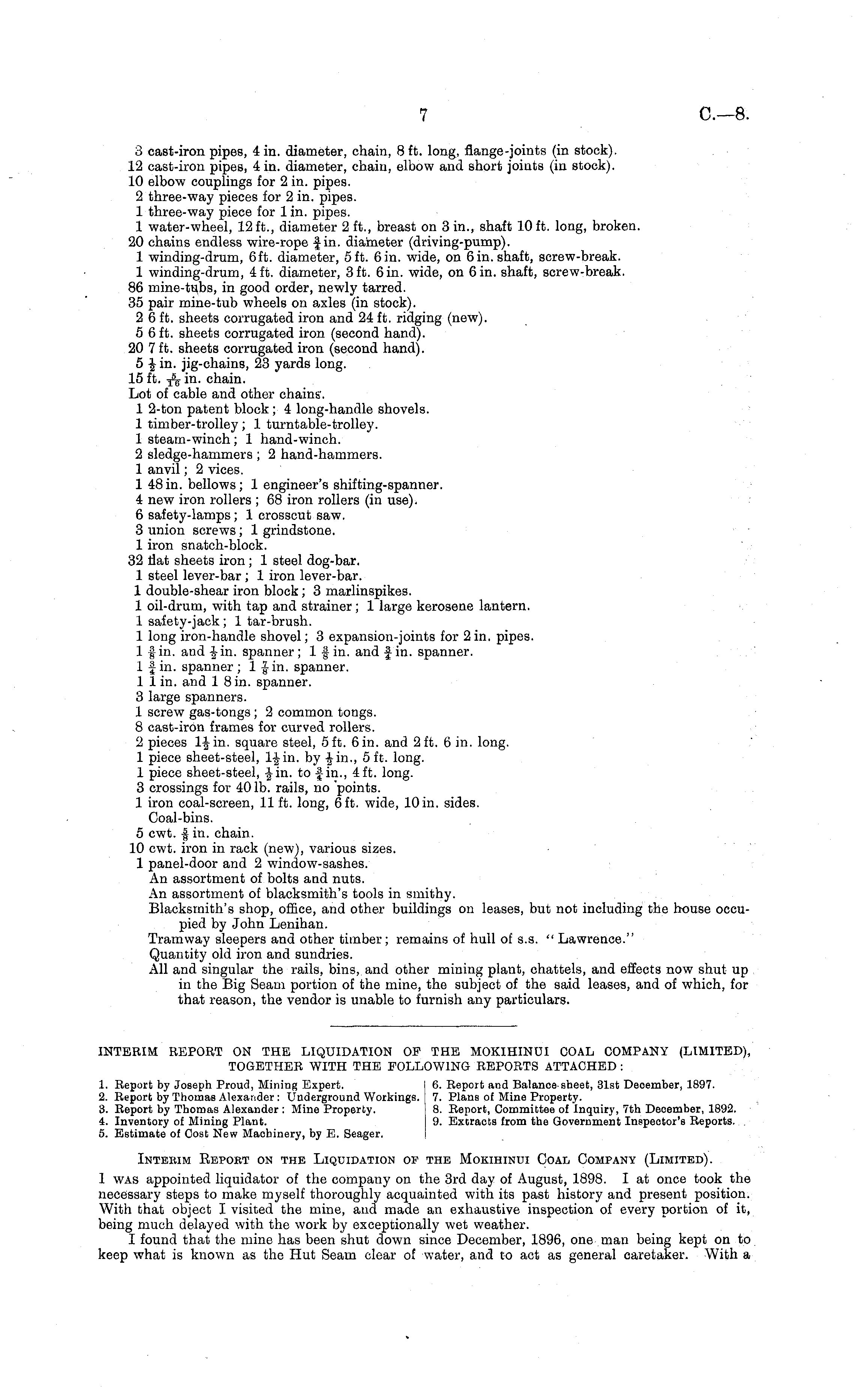 INTERIM REPORT ON THE LIQUIDATION OP THE MOKIHINUI COAL COMPANY (LIMITED), TOGETHER WITH THE FOLLOWING REPORTS ATTACHED : 1. Report by Joseph Proud, Mining Expert. j 6. Report and Balance.sheet, 31st Deoember, 1897. 2. Report by Thomas Alexander : Underground Workings. I 7. Plans of Mine Property. 3. Report by Thomas Alexander : Mine Property. j 8. Report, Committee of Inquiry, 7th December, 1892. 4. Inventory of Mining Plant. 9. Extracts from the Government Inspector's Reports. 5. Estimate of Cost New Machinery, by E. Seager. Interim Eeport on the Liquidation of the Mokihinui Coal Company (Limited). 1 was appointed liquidator of the company on the 3rd day of August, 1898. I at once took the necessary steps to make myself thoroughly acquainted with its past history and present position. With that object I visited the mine, and made an exhaustive inspection of every portion of it, being much delayed with the work by exceptionally wet weather. I found that the mine has been shut down since December, 1896, one man being kept on to keep what is known as the Hut Seam clear of water, and to act as general caretaker. With a