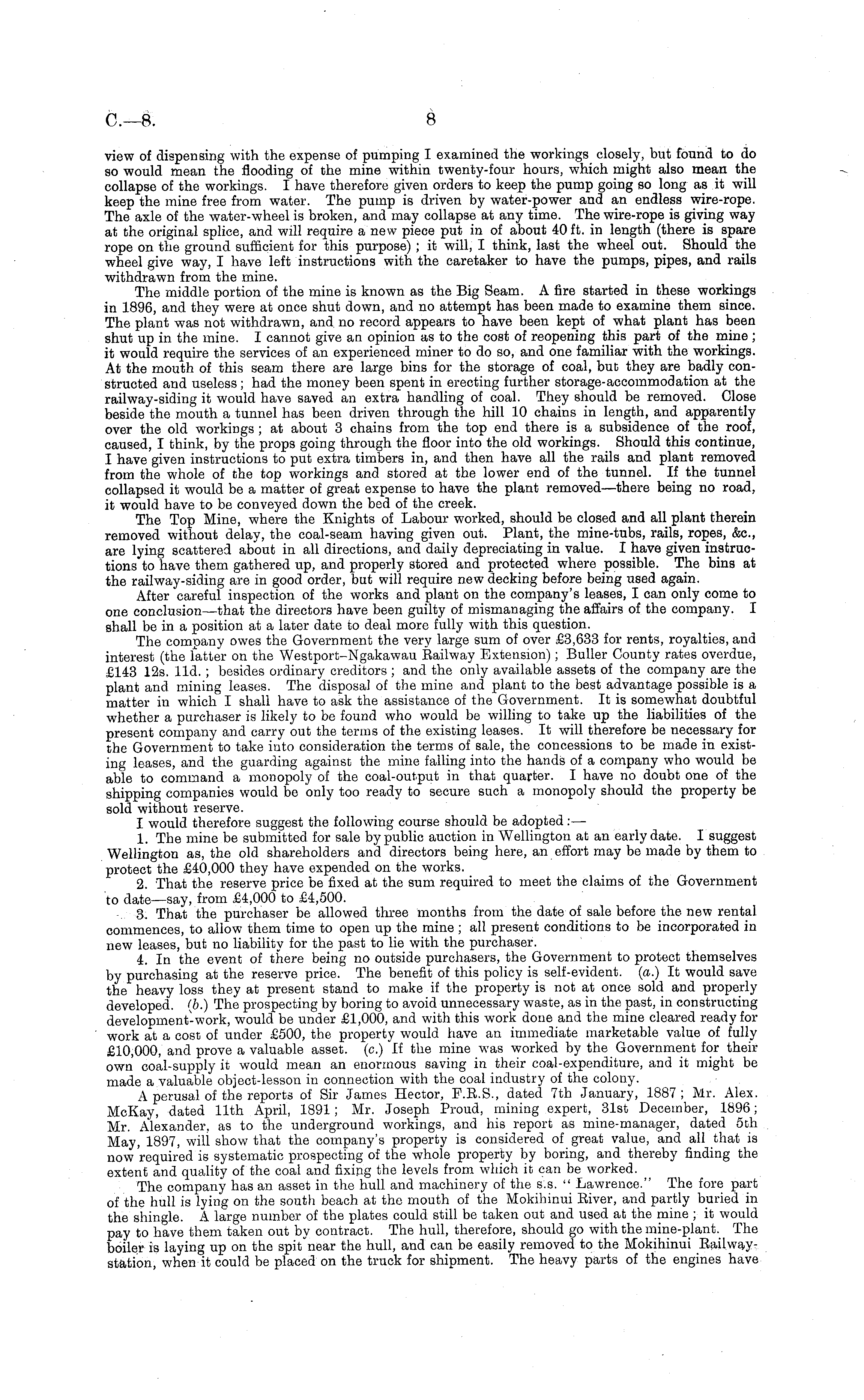 view of dispensing with the expense of pumping I examined the workings closely, but found to do so would mean the flooding of the mine within twenty-four hours, which might also mean the collapse of the workings. I have therefore given orders to keep the pump going so long as it will keep the mine free from water. The pump is driven by water-power and an endless wire-rope. The axle of the water-wheel is broken, and may collapse at any time. The wire-rope is giving way at the original splice, and will require a new piece put in of about 40 ft. in length (there is spare rope on the ground sufficient for this purpose) ; it will, I think, last the wheel out. Should the wheel give way, I have left instructions with the caretaker to have the pumps, pipes, and rails withdrawn from the mine. The middle portion of the mine is known as the Big Seam. A fire started in these workings in 1896, and they were at once shut down, and no attempt has been made to examine them since. The plant was not withdrawn, and no record appears to have been kept of what plant has been shut up in the mine. I cannot give an opinion as to the cost of reopening this part of the mine ; it would require the services of an experienced miner to do so, and one familiar with the workings. At the mouth of this seam there are large bins for the storage of coal, but they are badly constructed and useless; had the money been spent in erecting further storage-accommodation at the railway-siding it would have saved an extra handling of coal. They should be removed. Close beside the mouth a tunnel has been driven through the hill 10 chains in length, and apparently over the old workings; at about 3 chains from the top end there is a subsidence of the roof, caused, I think, by the props going through the floor into the old workings. Should this continue, I have given instructions to put extra timbers in, and then have all the rails and plant removed from the whole of the top workings and stored at the lower end of the tunnel. If the tunnel collapsed it would be a matter of great expense to have the plant removed—there being no road, it would have to be conveyed down the bed of the creek. The Top Mine, where the Knights of Labour worked, should be closed and all plant therein removed without delay, the coal-seam having given out. Plant, the mine-tubs, rails, ropes, &c, are lying scattered about in all directions, and daily depreciating in value. I have given instructions to have them gathered up, and properly stored and protected where possible. The bins at the railway-siding are in good order, but will require new decking before being used again. After careful inspection of the works and plant on the company's leases, I can only come to one conclusion —that the directors have been guilty of mismanaging the affairs of the company. I shall be in a position at a later date to deal more fully with this question. The company owes the Government the very large sum of over £3,633 for rents, royalties, and interest (the latter on the Westport-Ngakawau Railway Extension); Buller County rates overdue, £143 12s. lid.; besides ordinary creditors ; and the only available assets of the company are the plant and mining leases. The disposal of the mine and plant to the best advantage possible is a matter in which I shall have to ask the assistance of the Government. It is somewhat doubtful whether a purchaser is likely to be found who would be willing to take up the liabilities of the present company and carry out the terms of the existing leases. It will therefore be necessary for the Government to take into consideration the terms of sale, the concessions to be made in existing leases, and the guarding against the mine falling into the hands of a company who would be able to command a monopoly of the coal-output in that quarter. I have no doubt one of the shipping companies would be only too ready to secure such a monopoly should the property be sold without reserve. I would therefore suggest the following course should be adopted: — 1. The mine be submitted for sale by public auction in Wellington at an early date. I suggest Wellington as, the old shareholders and directors being here, an effort may be made by them to protect the £40,000 they have expended on the works. 2. That the reserve price be fixed at the sum required to meet the claims of the Government to date—say, from £4,000 to £4,500. -.. 3. That the purchaser be allowed three months from the date of sale before the new rental commences, to allow them time to open up the mine ; all present conditions to be incorporated in new leases, but no liability for the past to lie with the purchaser. 4. In the event of there being no outside purchasers, the Government to protect themselves by purchasing at the reserve price. The benefit of this policy is self-evident, (a.) It would save the heavy loss they at present stand to make if the property is not at once sold and properly developed, (b.) The prospecting by boring to avoid unnecessary waste, as in the past, in constructing development-work, would be under £1,000, and with this work done and the mine cleared ready for work at a cost of under £500, the property would have an immediate marketable value of fully £10,000, and prove a valuable asset, (c.) If the mine was worked by the Government for their own coal-supply it would mean an enormous saving in their coal-expenditure, and it might be made a valuable object-lesson in connection with the coal industry of the colony. A perusal of the reports of Sir James Hector, F.R.S., dated 7th January, 1887 ; Mr. Alex. McKay, dated 11th April, 1891; Mr. Joseph Proud, mining expert, 31st December, 1896; Mr. Alexander, as to the underground workings, and his report as mine-manager, dated sch May, 1897, will show that the company's property is considered of great value, and all that is now required is systematic prospecting of the whole property by boring, and thereby finding the extent and