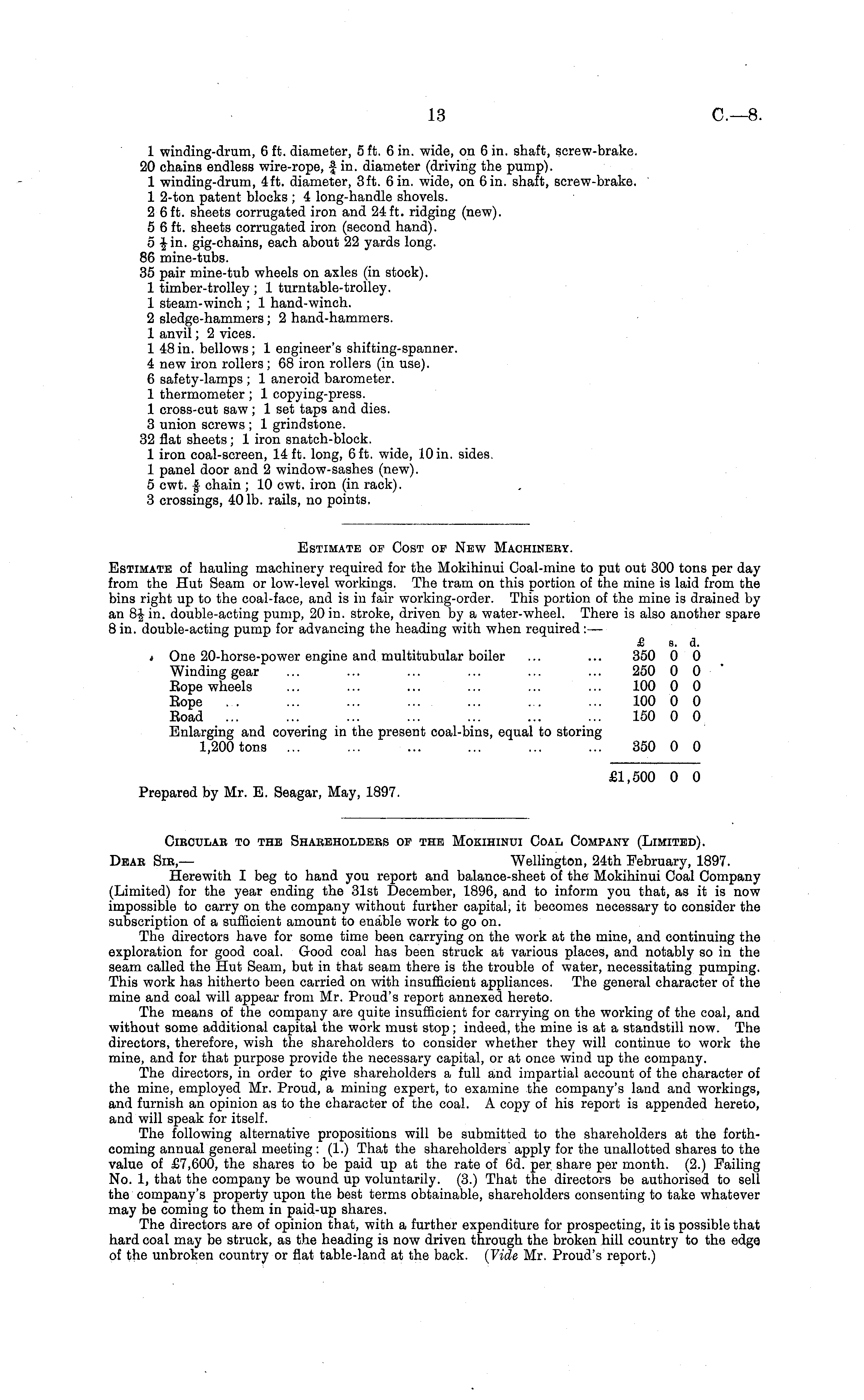 Circular to the Shareholders of the Mokihinui Coal Company (Limited). Dear Sir,— Wellington, 24th February, 1897. Herewith I beg to hand you report and balance-sheet of the Mokihinui Coal Company (Limited) for the year ending the 31st December, 1896, and to inform you that, as it is now impossible to carry on the company without further capital, it becomes necessary to consider the subscription of a sufficient amount to enable work to go on. The directors have for some time been carrying on the work at the mine, and continuing the exploration for good coal. Good coal has been struck at various places, and notably so in the seam called the Hut Seam, but in that seam there is the trouble of water, necessitating pumping. This work has hitherto been carried on with insufficient appliances. The general character of the mine and coal will appear from Mr. Proud's report annexed hereto. The means of the company are quite insufficient for carrying on the working of the coal, and without some additional capital the work must stop; indeed, the mine is at a standstill now. The directors, therefore, wish the shareholders to consider whether they will continue to work the mine, and for that purpose provide the necessary capital, or at once wind up the company. The directors, in order to give shareholders a full and impartial account of the character of the mine, employed Mr. Proud, a mining expert, to examine the company's land and workings, and furnish an opinion as to the character of the coal. A copy of his report is appended hereto, and will speak for itself. The following alternative propositions will be submitted to the shareholders at the forthcoming annual general meeting : (1.) That the shareholders apply for the unallotted shares to the value of £7,600, the shares to be paid up at the rate of 6d. per share per month. (2.) Failing No. 1, that the company be wound up voluntarily. (3.) That the directors be authorised to sell the company's property upon the best terms obtainable, shareholders consenting to take whatever may be coming to them in paid-up shares. The directors are of opinion that, with a further expenditure for prospecting, it is possible that hard coal may be struck, as the heading is now driven through the broken hill country to the edge of the unbroken country or flat table-land at the back. (Vide Mr. Proud's report.)