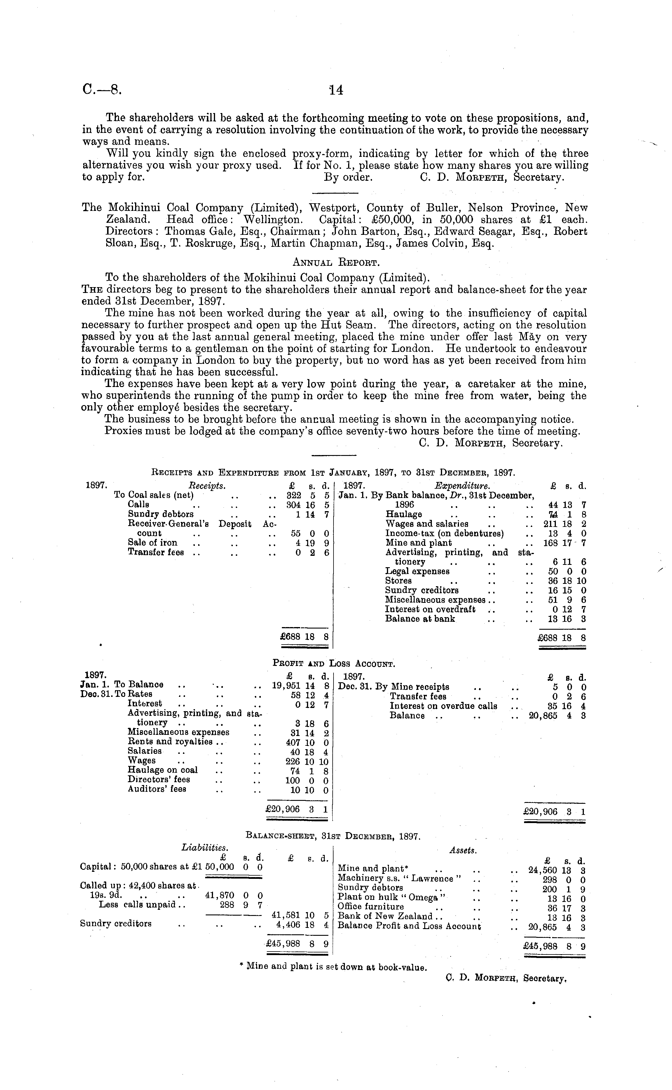 The Mokihinui Coal Company (Limited), Westport, County of Buller, Nelson Province, New Zealand. Head office: Wellington. Capital: £50,000, in 50,000 shares at £1 each. Directors : Thomas Gale, Esq., Chairman; John Barton, Esq., Edward Seagar, Esq., Eobert Sloan, Esq., T. Eoskruge, Esq., Martin Chapman, Esq., James Colvin, Esq. Annual Eeport. To the shareholders of the Mokihinui Coal Company (Limited). The directors beg to present to the shareholders their annual report and balance-sheet for the year ended 31st December, 1897. The mine has not been worked during the year at all, owing to the insufficiency of capital necessary to further prospect and open up the Hut Seam. The directors, acting on the resolution passed by you at the last annual general meeting, placed the mine under offer last May on very favourable terms to a gentleman on the point of starting for London. He undertook to endeavour to form a company in London to buy the property, but no word has as yet been received from him indicating that he has been successful. The expenses have been kept at a very low point during the year, a caretaker at the mine, who superintends the running of the pump in order to keep the mine free from water, being the only other employe besides the secretary. The business to be brought before the annual meeting is shown in the accompanying notice. Proxies must be lodged at the company's office seventy-two hours before the time of meeting. C. D. Morpeth, Secretary.