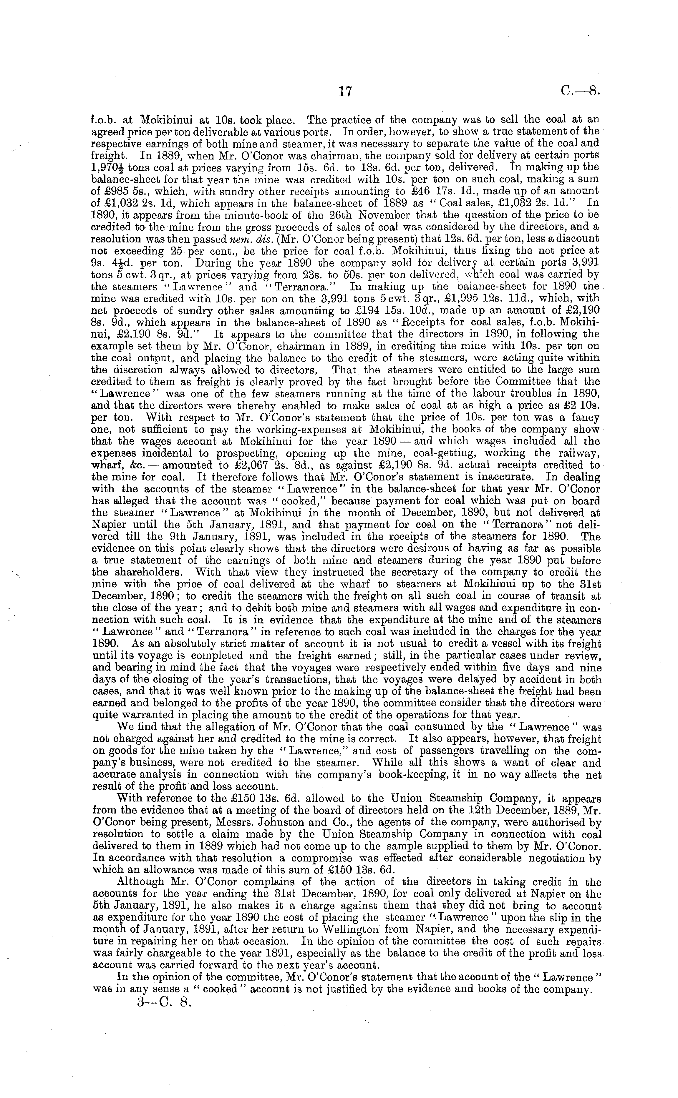 f.o.b. at Mokihinui at 10s. took place. The practice of the company was to sell the coal at an agreed price per ton deliverable at various ports. In order, however, to show a true statement of the respective earnings of both mine and steamer, it was necessary to separate the value of the coal and freight. In 1889, when Mr. O'Conor was chairman, the company sold for delivery at certain ports 1,970f tons coal at prices varying from 15s. 6d. to 18s. 6d. per ton, delivered. In making up the balance-sheet for that year the mine was credited with 10s. per ton on such coal, making a sum of £985 55., which, with sundry other receipts amounting to £46 17s. Id., made up of an amount of £1,032 2s. Id, which appears in the balance-sheet of 1889 as " Coal sales, £1,032 2s. Id." In 1890, it appears from the minute-book of the 26th November that the question of the price to be credited to the mine from the gross proceeds of sales of coal was considered by the directors, and a resolution was then passed nem. dis. (Mr. O'Conor being present) that 12s. 6d. per ton, less a discount not exceeding 25 per cent., be the price for coal f.o.b. Mokihinui, thus fixing the net price at 9s. 4-|d. per ton. During the year 1890 the company sold for delivery at certain ports 3,991 tons 5 cwt. 3qr., at prices varying from 235. to 50s. per ton delivered, which coal was carried by the steamers "Lawrence" and "Terranora." In making up the balance-sheet for 1890 the mine was credited with 10s. per ton on the 3,991 tons 5 cwt. 3qr., £1,995 12s. lid., which, with net proceeds of sundry other sales amounting to £194 15s. 10d., made up an amount of £2,190 Bs. 9d., which appears in the balance-sheet of 1890 as "Eeceipts for coal sales, f.o.b. Mokihinui, £2,190 Bs. 9d." It appears to the committee that the directors in 1890, in following the example set them by Mr. O'Conor, chairman in 1889, in crediting the mine with 10s. per ton on the coal output, and placing the balance to the credit of the steamers, were acting quite within the discretion always allowed to directors. That the steamers were entitled to the large sum credited to them as freight is clearly proved by the fact brought before the Committee that the "Lawrence" was one of the few steamers running at the time of the labour troubles in 1890, and that the directors were thereby enabled to make sales of coal at as high a price as £2 10s. per ton. With respect to Mr. O'Conor's statement that the price of 10s. per ton was a fancy one, not sufficient to pay the working-expenses at Mokihinui, the books of the company show that the wages account at Mokihinui for the year 1890 — and which wages included all the expenses incidental to prospecting, opening up the mine, coal-getting, working the railway, wharf, &c. — amounted to £2,067 2s. Bd., as against £2,190 Bs. 9d. actual receipts credited to the mine for coal. It therefore follows that Mr. O'Conor's statement is inaccurate. In dealing with the accounts of the steamer "Lawrence" in the balance-sheet for that year Mr. O'Conor has alleged that the account was " cooked," because payment for coal which was put on board the steamer "Lawrence" at Mokihinui in the month of December, 1890, but not delivered at Napier until the sth January, 1891, and that payment for coal on the "Terranora" not delivered till the 9th January, 1891, was included in the receipts of the steamers for 1890. The evidence on this point clearly shows that the directors were desirous of having as far as possible a true statement of the earnings of both mine and steamers during the year 1890 put before the shareholders. With that view they instructed the secretary of the company to credit the mine with the price of coal delivered at the wharf to steamers at Mokihinui up to the 31st December, 1890; to credit the steamers with the freight on all such coal in course of transit at the close of the year; and to debit both mine and steamers with all wages and expenditure in connection with such coal. It is in evidence that the expenditure at the mine and of the steamers " Lawrence " and " Terranora" in reference to such coal was included in the charges for the year 1890. As an absolutely strict matter of account it is not usual to credit a vessel with its freight until its voyage is completed and the freight earned; still, in the particular cases under review, and bearing in mind the fact that the voyages were respectively ended within five days and nine days of the closing of the year's transactions, that the voyages were delayed by accident in both cases, and that it was well known prior to the making up of the balance-sheet the freight had been earned and belonged to the profits of the year 1890, the committee consider that the directors were quite warranted in placing the amount to the credit of the operations for that year. We find that the allegation of Mr. O'Conor that the coal consumed by the " Lawrence " was not charged against her and credited to the mine is correct. It also appears, however, that freight on goods for the mine taken by the "Lawrence," and cost of passengers travelling on the company's business, were not credited to the steamer. While all this shows a want of clear and accurate analysis in connection with the company's book-keeping, it in no way affects the net result of the profit and loss account. With reference to the £150 13s. 6d. allowed to the Union Steamship Company, it appears from the evidence that at a meeting of the board of directors held on the 12th December, 1889, Mr. O'Conor being present, Messrs. Johnston and Co., the agents of the company, were authorised by resolution to settle a claim made by the Union Steamship Company in connection with coal delivered to them in 1889 which had not come up to the sample supplied to them by Mr. O'Conor. In accordance with that resolution a compromise was effected after considerable negotiation by which an allowance was made of this sum of £150 13s. 6d. Although Mr. O'Con