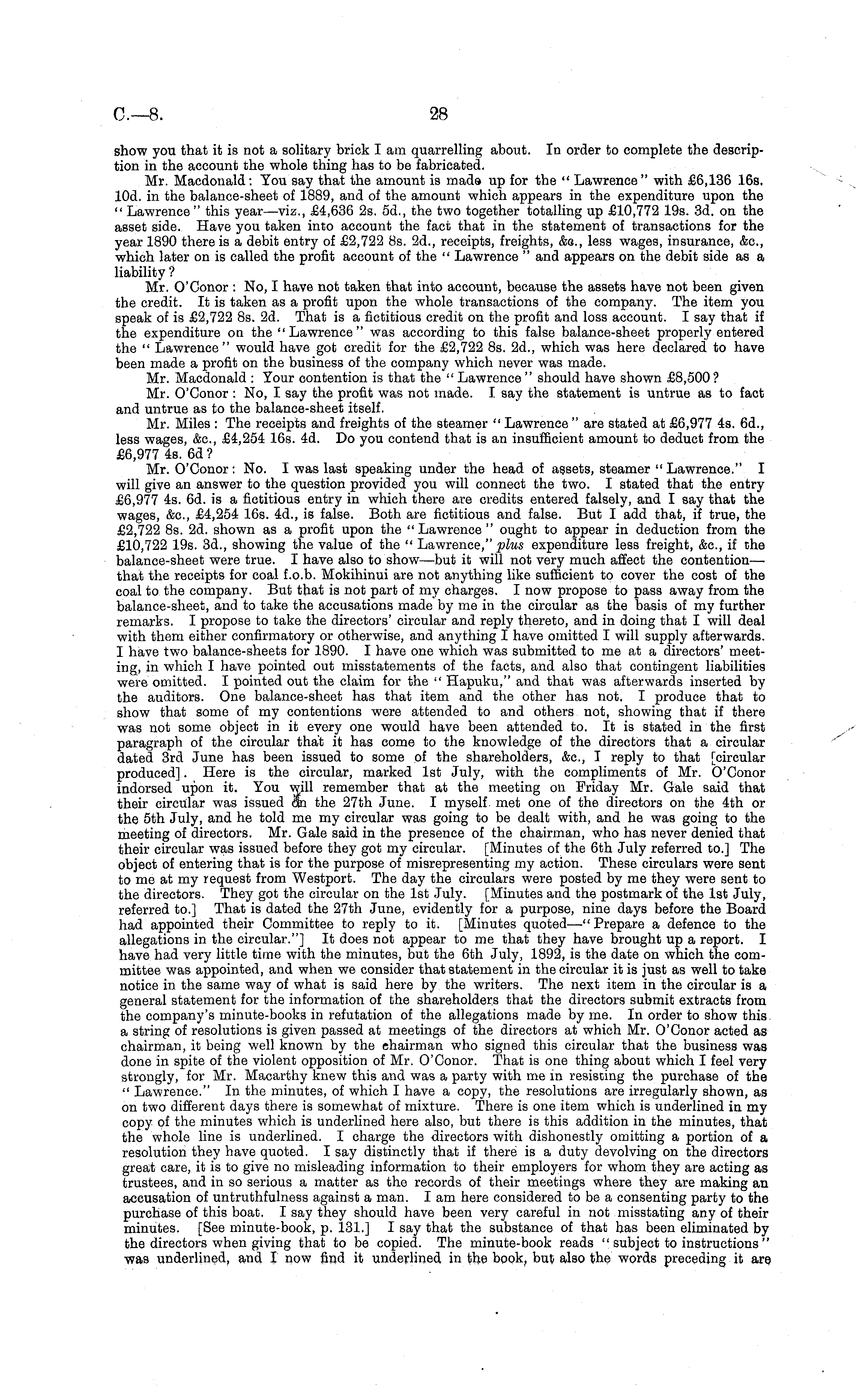 show you that it is not a solitary brick lam quarrelling about. In order to complete the description in the account the whole thing has to be fabricated. Mr. Macdonald : You say that the amount is made up for the " Lawrence " with £6,136 16s. lOd. in the balance-sheet of 1889, and of the amount which appears in the expenditure upon the " Lawrence" this year —viz., £4,636 2s. 5d., the two together totalling up £10,772 19s. 3d. on the asset side. Have you taken into account the fact that in the statement of transactions for the year 1890 there is a debit entry of £2,722 Bs. 2d., receipts, freights, &c., less wages, insurance, &c, which later on is called the profit account of the " Lawrence " and appears on the debit side as a liability ? Mr. O'Conor : No, I have not taken that into account, because the assets have not been given the credit. It is taken as a profit upon the whole transactions of the company. The item you speak of is £2,722 Bs. 2d. That is a fictitious credit on the profit and loss account. I say that if the expenditure on the " Lawrence " was according to this false balance-sheet properly entered the " Lawrence " would have got credit for the £2,722 Bs. 2d., which was here declared to have been made a profit on the business of the company which never was made. Mr. Macdonald : Your contention is that the " Lawrence " should have shown £8,500 ? Mr. O'Conor: No, I say the profit was not made. I say the statement is untrue as to fact and untrue as to the balance-sheet itself. Mr. Miles : The receipts and freights of the steamer " Lawrence " are stated at £6,977 4s. 6d., less wages, &c, £4,254 16s. 4d. Do you contend that is an insufficient amount to deduct from the £6,977 4s. 6d ? Mr. O'Conor: No. I was last speaking under the head of assets, steamer "Lawrence." I will give an answer to the question provided you will connect the two. I stated that the entry £6,977 4s. 6d. is a fictitious entry in which there are credits entered falsely, and I say that the wages, &c, £4,254 16s. 4d., is false. Both are fictitious and false. But I add that, if true, the £2,722 Bs. 2d. shown as a profit upon the "Lawrence" ought to appear in deduction from the £10,722 19s. 3d., showing the value of the " Lawrence," plus expenditure less freight, &c, if the balance-sheet were true. I have also to show—but it will not very much affect the contention — that the receipts for coal f.o.b. Mokihinui are not anything like sufficient to cover the cost of the coal to the company. But that is not part of my charges. I now propose to pass away from the balance-sheet, and to take the accusations made by me in the circular as the basis of my further remarks. I propose to take the directors' circular and reply thereto, and in doing that I will deal with them either confirmatory or otherwise, and anything I have omitted I will supply afterwards. I have two balance-sheets for 1890. I have one which was submitted to me at a directors' meeting, in which I have pointed out misstatements of the facts, and also that contingent liabilities were omitted. I pointed out the claim for the " Hapuku," and that was afterwards inserted by the auditors. One balance-sheet has that item and the other has not. I produce that to show that some of my contentions were attended to and others not, showing that if there was not some object in it every one would have been attended to. It is stated in the first paragraph of the circular that it has come to the knowledge of the directors that a circular dated 3rd June has been issued to some of the shareholders, &c, I reply to that [circular produced]. Here is the circular, marked Ist July, with the compliments of Mr. O'Conor indorsed upon it. You will remember that at the meeting on Friday Mr. Gale said that their circular was issued an the 27th June. I myself, met one of the directors on the 4th or the sth July, and he told me my circular was going to be dealt with, and he was going to the meeting of directors. Mr. Gale said in the presence of the chairman, who has never denied that their circular was issued before they got my circular. [Minutes of the 6th July referred to.] The object of entering that is for the purpose of misrepresenting my action. These circulars were sent to me at my request from Westport. The day the circulars were posted by me they were sent to the directors. They got the circular on the Ist July. [Minutes and the postmark of the Ist July, referred to.] That is dated the 27th June, evidently for a purpose, nine days before the Board had appointed their Committee to reply to it. [Minutes quoted—"Prepare a defence to the allegations in the circular."] It does not appear to me that they have brought up a report. I have had very little time with the minutes, but the 6th July, 1892, is the date on which the committee was appointed, and when we consider that statement in the circular it is just as well to take notice in the same way of what is said here by the writers. The next item in the circular is a general statement for the information of the shareholders that the directors submit extracts from the company's minute-books in refutation of the allegations made by me. In order to show this a string of resolutions is given passed at meetings of the directors at which Mr. O'Conor acted as chairman, it being well known by the chairman who signed this circular that the business was done in spite of the violent opposition of Mr. O'Conor. That is one thing about which I feel very strongly, for Mr. Macarthy knew this and was a party with me in resisting the purchase of the " Lawrence." In the minutes, of which I have a copy, the resolutions are irregularly shown, as on two different days there is somewhat of mixture. There is one item which is underlined in my copy of the minutes which is underlined here also, but there is this addition in the minutes, that the whole line is underlined. I charge the -directors with dishonestly omitting a portion of a res