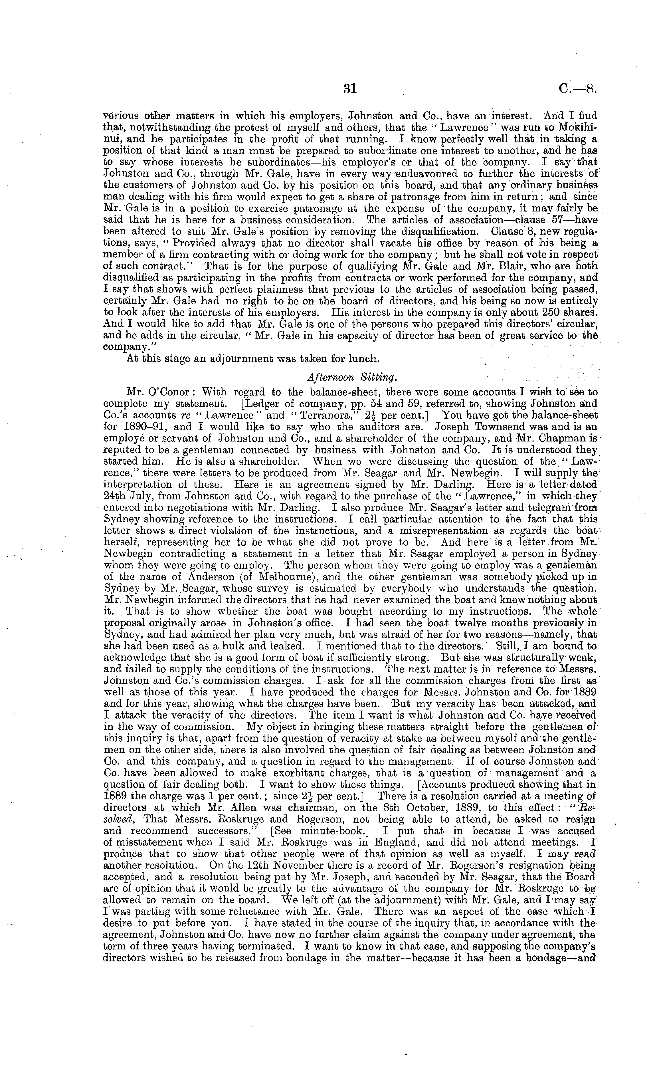 various other matters in which his employers, Johnston and Co., have an interest. And I find that, notwithstanding the protest of myself and others, that the " Lawrence " was run to Mokihinui, and he participates in the profit of that running. I know perfectly well that in taking a position of that kind a man must be prepared to subordinate one interest to another, and he has to say whose interests he subordinates —his employer's or that of the company. I say that Johnston and Co., through Mr. Gale, have in every way endeavoured to further the interests of the customers of Johnston and Co. by his position on this board, and that any ordinary business man dealing with his firm would expect to get a share of patronage from him in return; and since Mr. Gale is in a position to exercise patronage at the expense of the company, it may fairly be said that he is here for a business consideration. The articles of association—clause 57—have been altered to suit Mr. Gale's position by removing the disqualification. Clause 8, new regulations, says, " Provided always that no director shall vacate his office by reason of his being a member of a firm contracting with or doing work for the company; but he shall not vote in respect of such contract." That is for the purpose of qualifying Mr. Gale and Mr. Blair, who are both disqualified as participating in the profits from contracts or work performed for the company, and I say that shows with perfect plainness that previous to the articles of association being passed, certainly Mr. Gale had no right to be on the board of directors, and his being so now is entirely to look after the interests of his employers. His interest in the company is only about 250 shares. And I would like to add that Mr. Gale is one of the persons who prepared this directors' circular, and he adds in the circular, " Mr. Gale in his capacity of director has been of great service to the company." At this stage an adjournment was taken for lunch. Afternoon Sitting. Mr. O'Conor : With regard to the balance-sheet, there were some accounts I wish to see to complete my statement. [Ledger of company, pp. 54 and 59, referred to, showing Johnston and Co.'s accounts re "Lawrence" and " Terranora," _\ per cent.] You have got the balance-sheet for 1890-91, and I would like to say who the auditors are. Joseph Townsend was and is an employe or servant of Johnston and Co., and a shareholder of the company, and Mr. Chapman is reputed to be a gentleman connected by business with Johnston and Co. It is understood they started him. He is also a shareholder. When we were discussing the question of the " Lawrence," there were letters to be produced from Mr. Seagar and Mr. Newbegin. I will supply the interpretation of these. Here is an agreement signed by Mr. Darling. Here is a letter dated 24th July, from Johnston and Co., with regard to the purchase of the " Lawrence," in which they entered into negotiations with Mr. Darling. I also produce Mr. Seagar's letter and telegram from Sydney showing reference to the instructions. I call particular attention to the fact that this letter shows a direct violation of the instructions, and a misrepresentation as regards the boat herself, representing her to be what she did not prove to be. And here is a letter from Mr. Newbegin contradicting a statement in a letter that Mr. Seagar employed a person in Sydney whom they were going to employ. The person whom they were going to employ was a gentleman of the name of Anderson (of Melbourne), and the other gentleman was somebody picked up in Sydney by Mr. Seagar, whose survey is estimated by everybody who understands the question. Mr. Newbegin informed the directors that he had never examined the boat and knew nothing about it. That is to show whether the boat was bought according to my instructions. The whole proposal originally arose in Johnston's office. I had seen the boat twelve months previously in Sydney, and had admired her plan very much, but was afraid of her for two reasons—namely, that she had been used as a hulk and leaked. I mentioned that to the directors. Still, lam bound to acknowledge that she is a good form of boat if sufficiently strong. But she was structurally weak, and failed to supply the conditions of the instructions. The next matter is in reference to Messrs. Johnston and Co.'s commission charges. I ask for all the commission charges from the first as well as those of this year. I have produced the charges for Messrs. Johnston and Co. for 1889 and for this year, showing what the charges have been. But my veracity has been attacked, and I attack the veracity of the directors. The item I want is what Johnston and Co. have received in the way of commission. My object in bringing these matters straight before the gentlemen of this inquiry is that, apart from the question of veracity at stake as between myself and the men on the other side, there is also involved the question of fair dealing as between Johnston and Co. and this company, and a question in regard to the management. If of course Johnston and Co. have been allowed to make exorbitant charges, that is a question of management and a question of fair dealing both. I want to show these things. [Accounts produced showing that in 1889 the charge was 1 per cent.; since 2\ per cent.] There is a resolntion carried at a meeting of directors at which Mr. Allen was chairman, on the Bth October, 1889, to this effect: "Besolved, That Messrs. Eoskruge and Eogerson, not being able to attend, be asked to resign and recommend successors." [See minute-book.] I put that in because I was accused of misstatement when I said Mr. Eoskruge was in England, and did not attend meetings. I produce that to show that other people were of that opinion as well as myself. I may read another resolution. On the 12th November there is a record of Mr. Eogerson's resignation being accepted, and a resolution being put by Mr. Joseph, and seconded by Mr. Seagar, that t